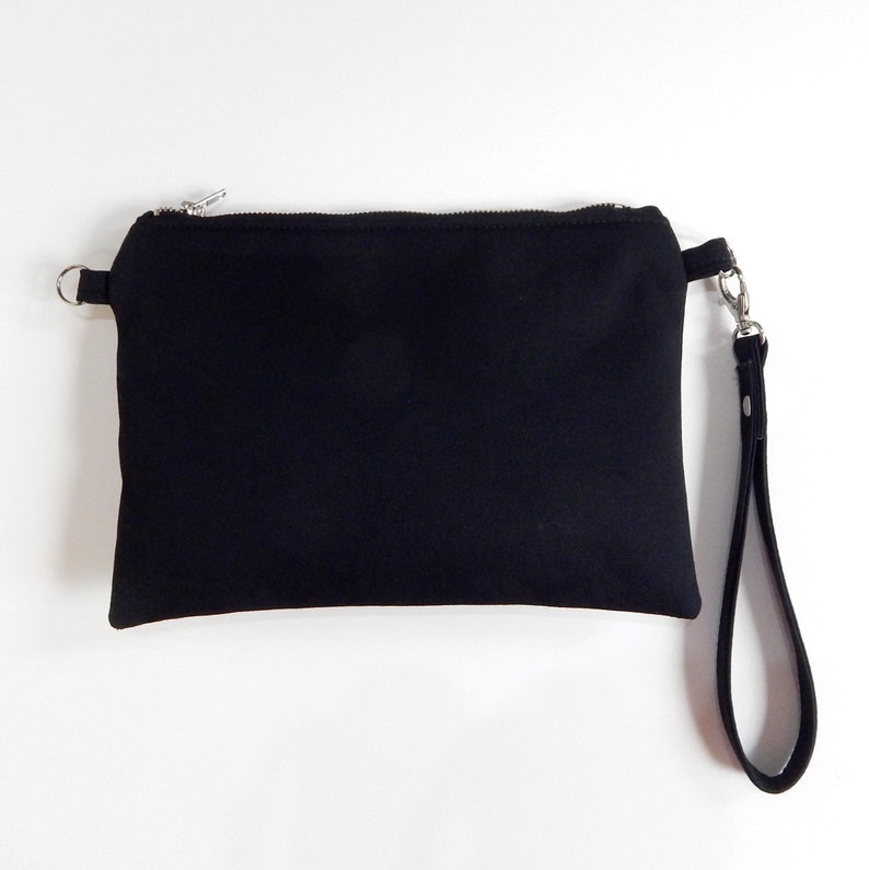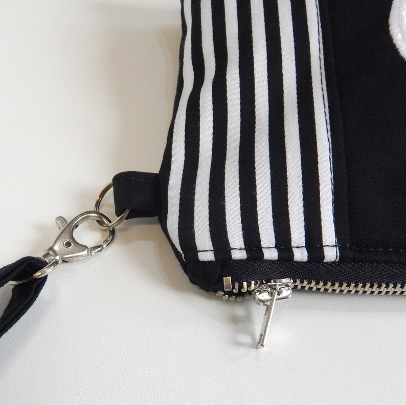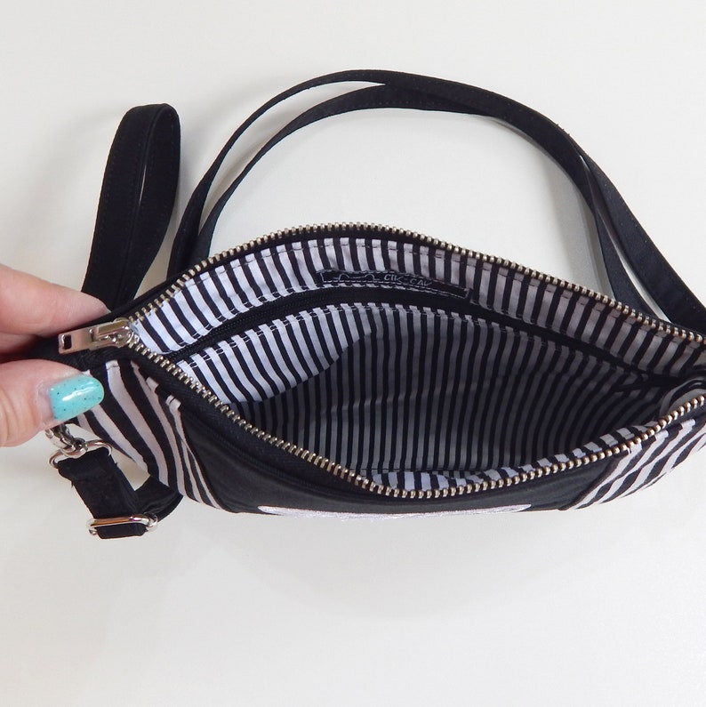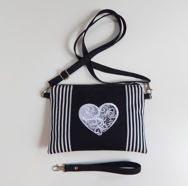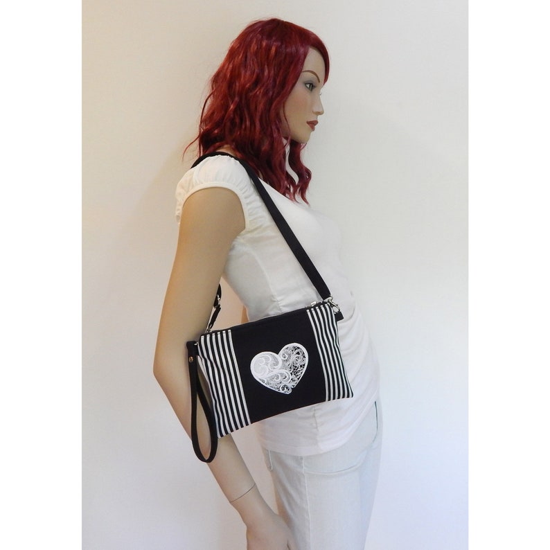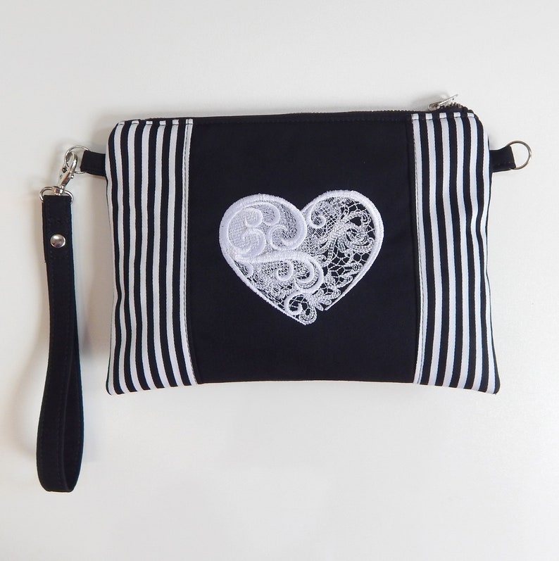 Wristlet gothic handbag made of black cotton twill (mix cotton-polyester twill), black - white striped cotton twill and machine embroidered heart . The bag is lined with black white striped canvas lining and has a zippered closure on the front.