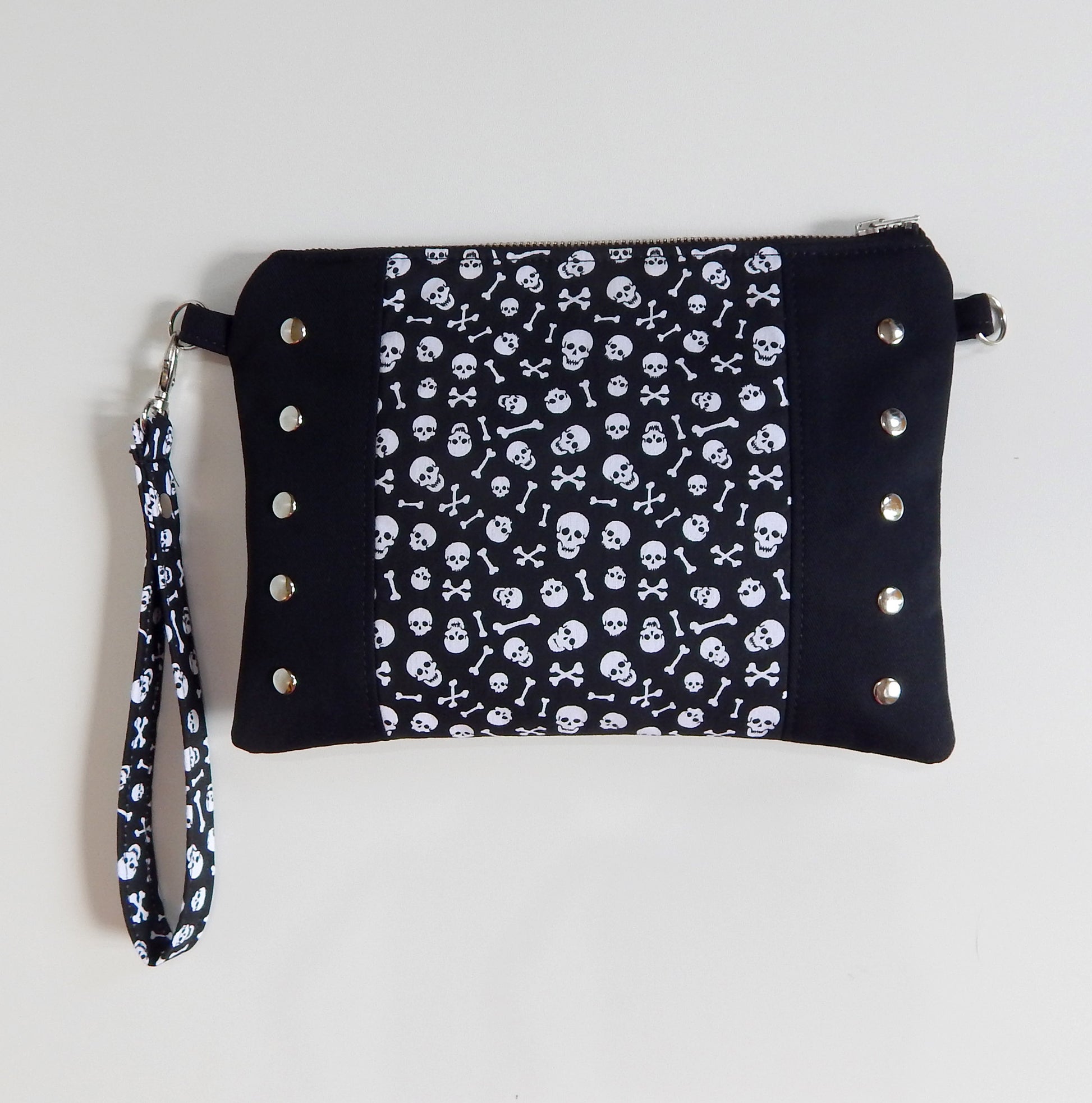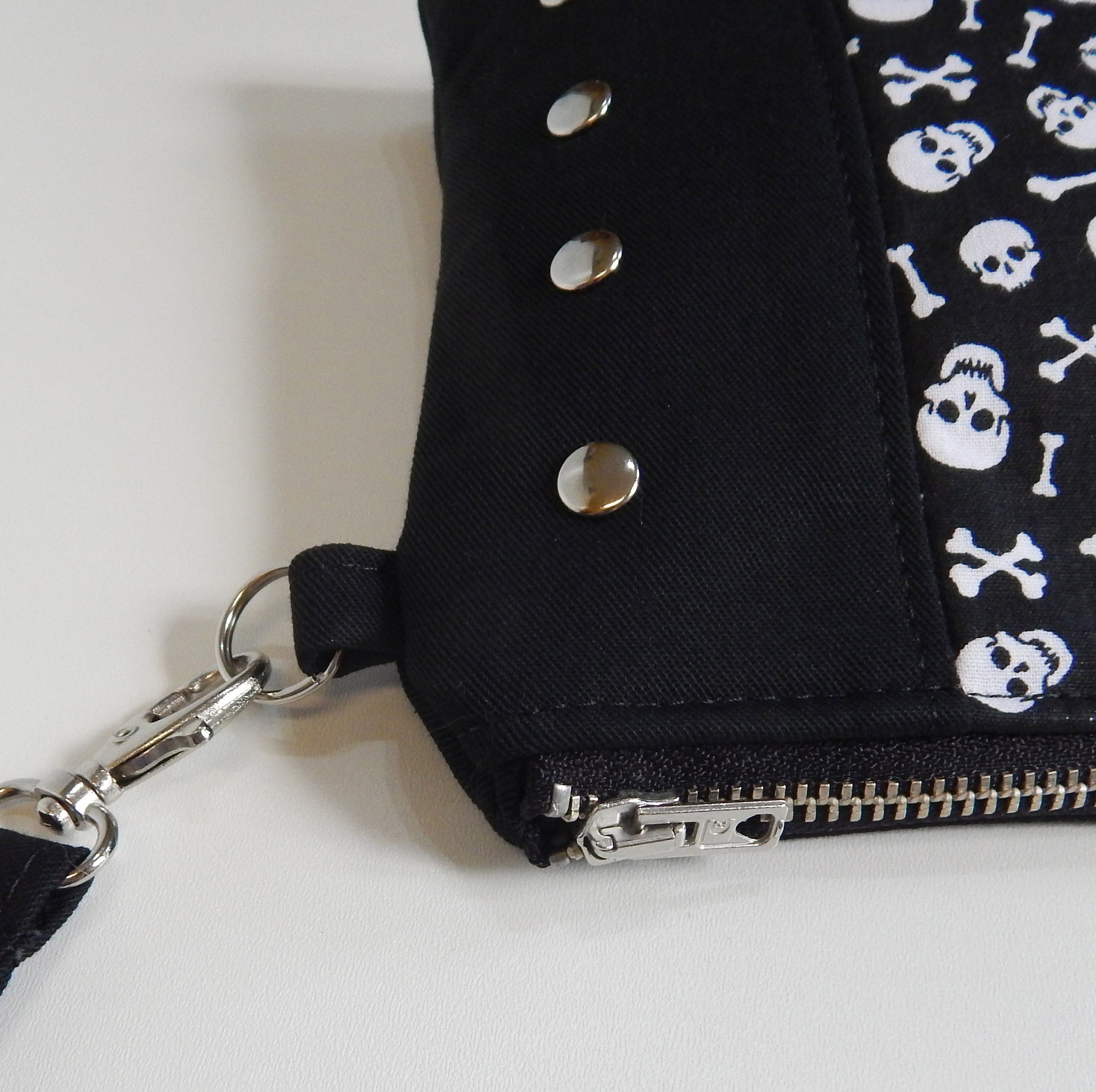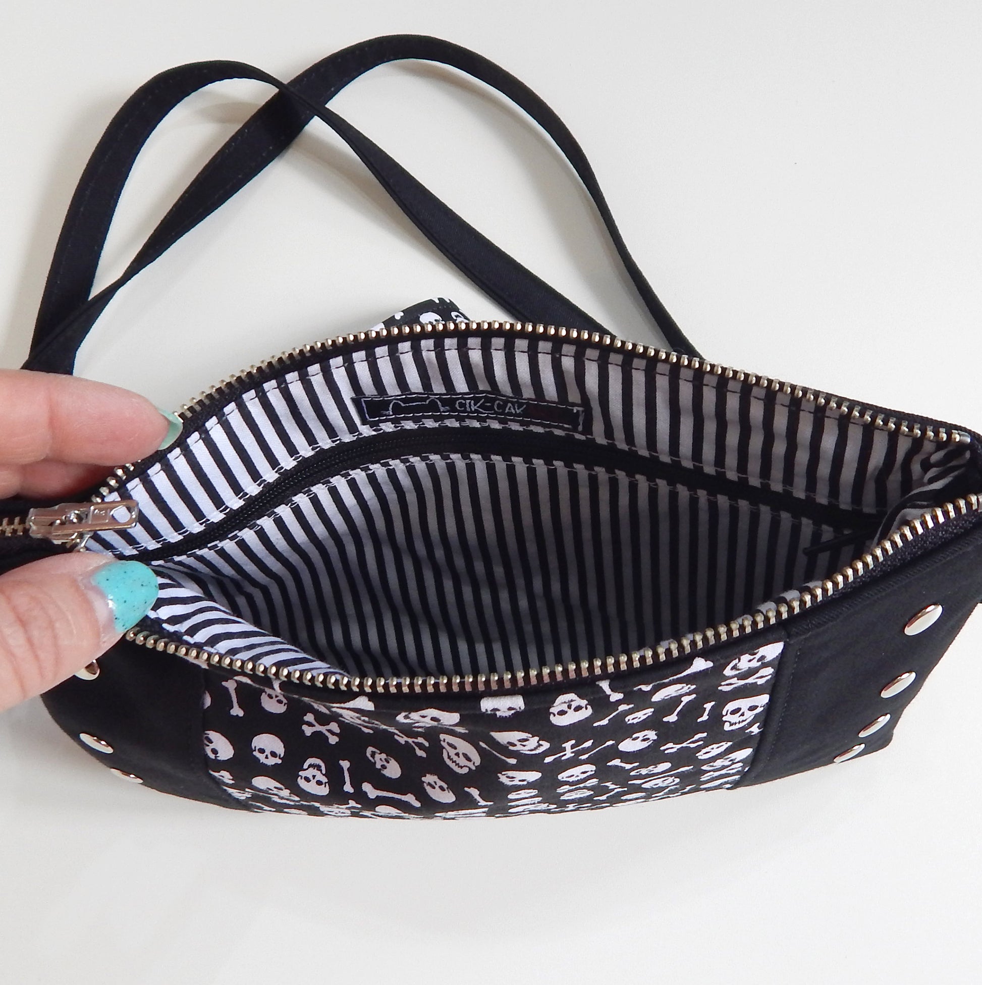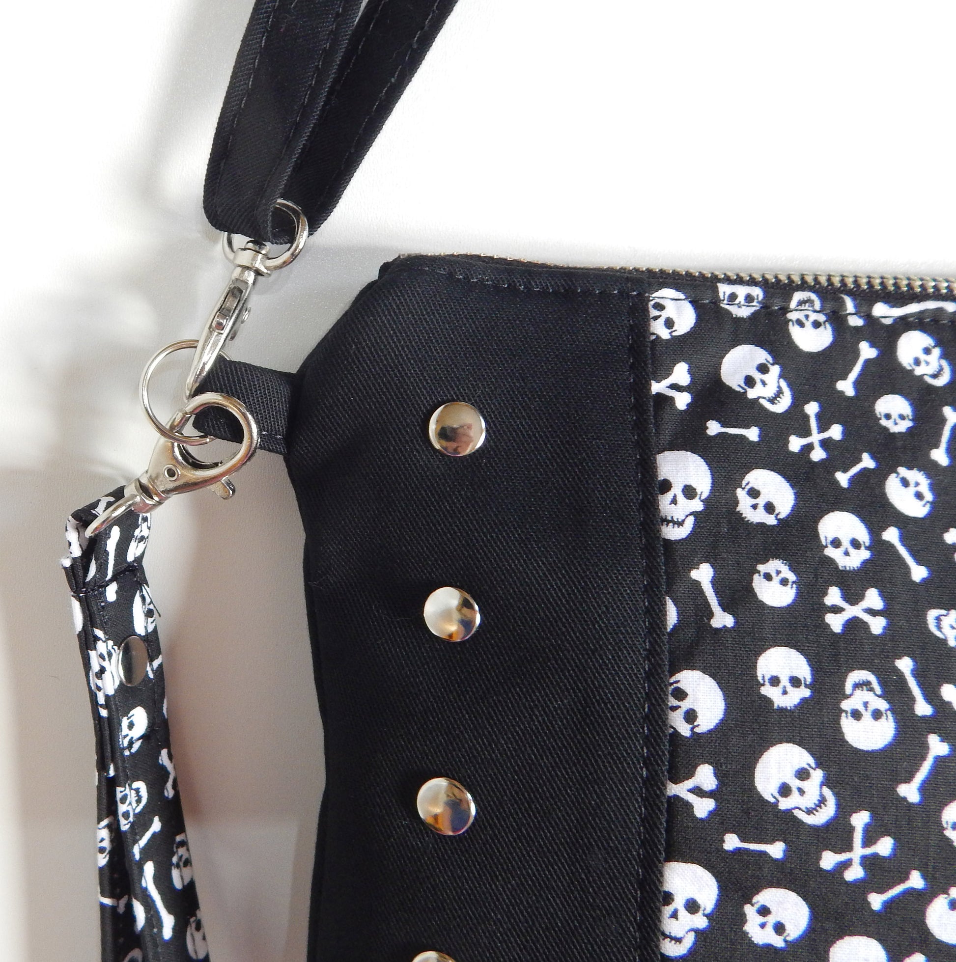 Wristlet skulls print handbag made of black cotton twill (mix cotton-polyester twill) and skulls print cotton canvas (black canvas, white skulls print), decorated with metal rivets . The bag is lined with black white striped canvas lining and has a zippered closure on the front.