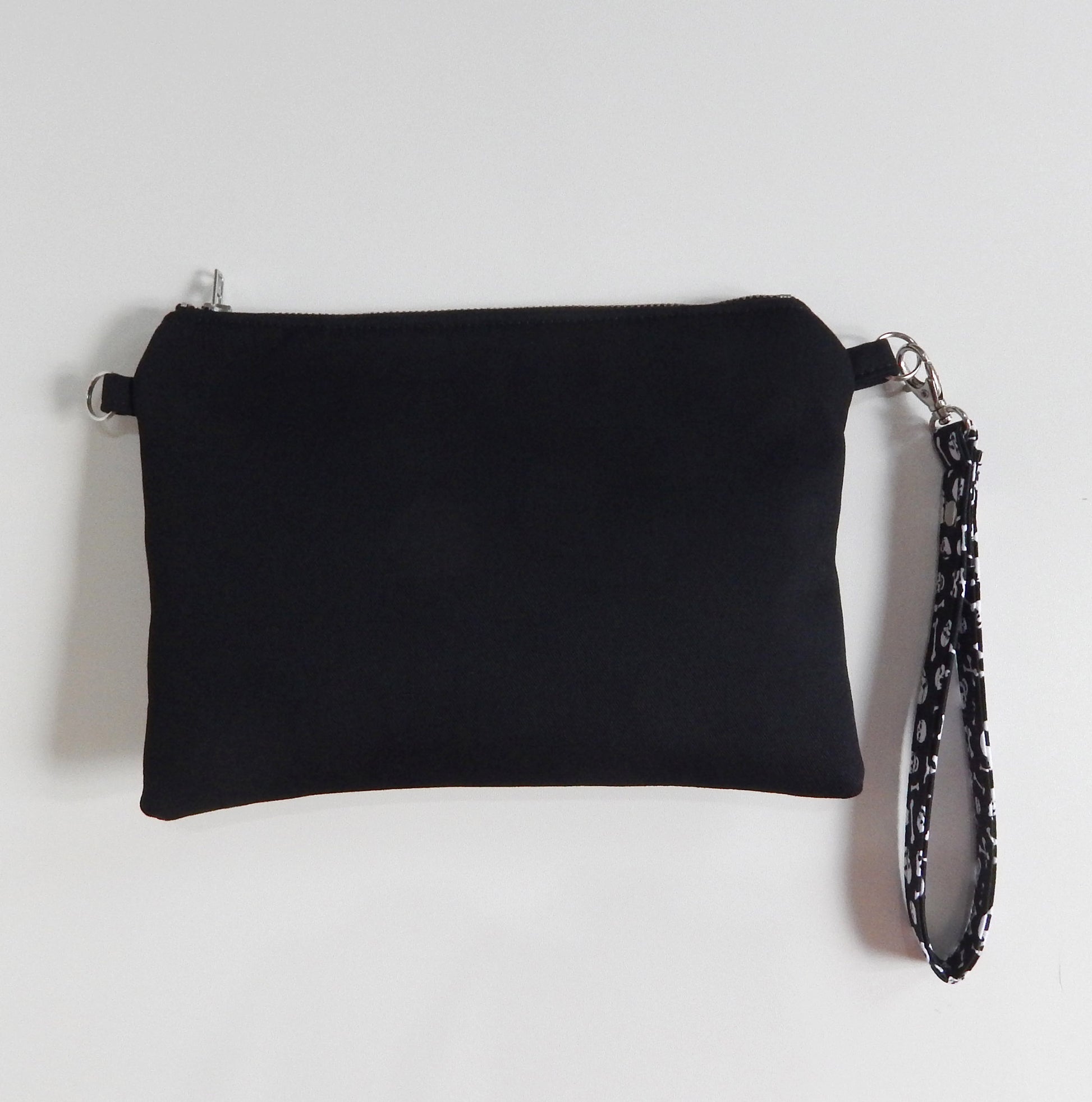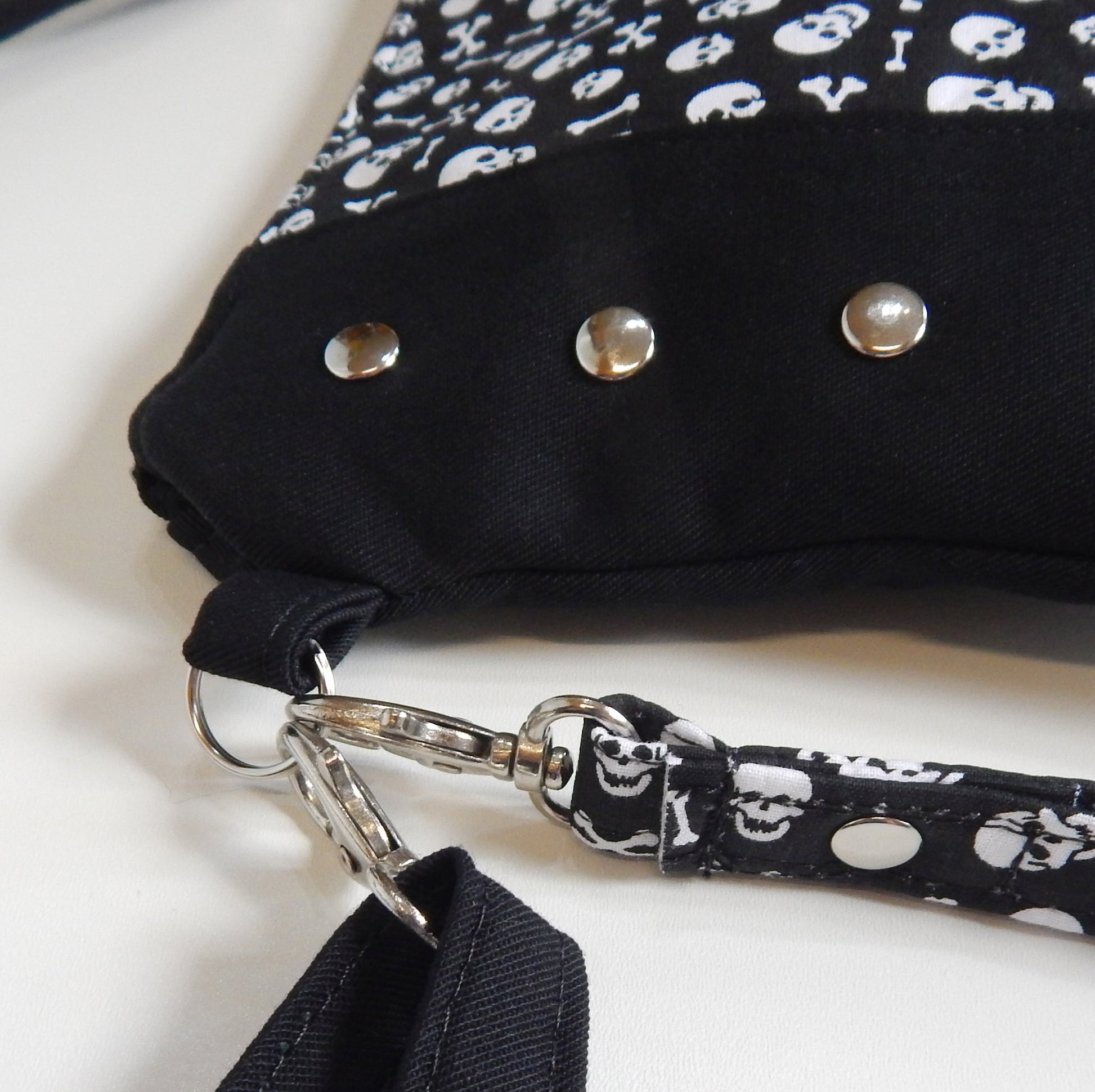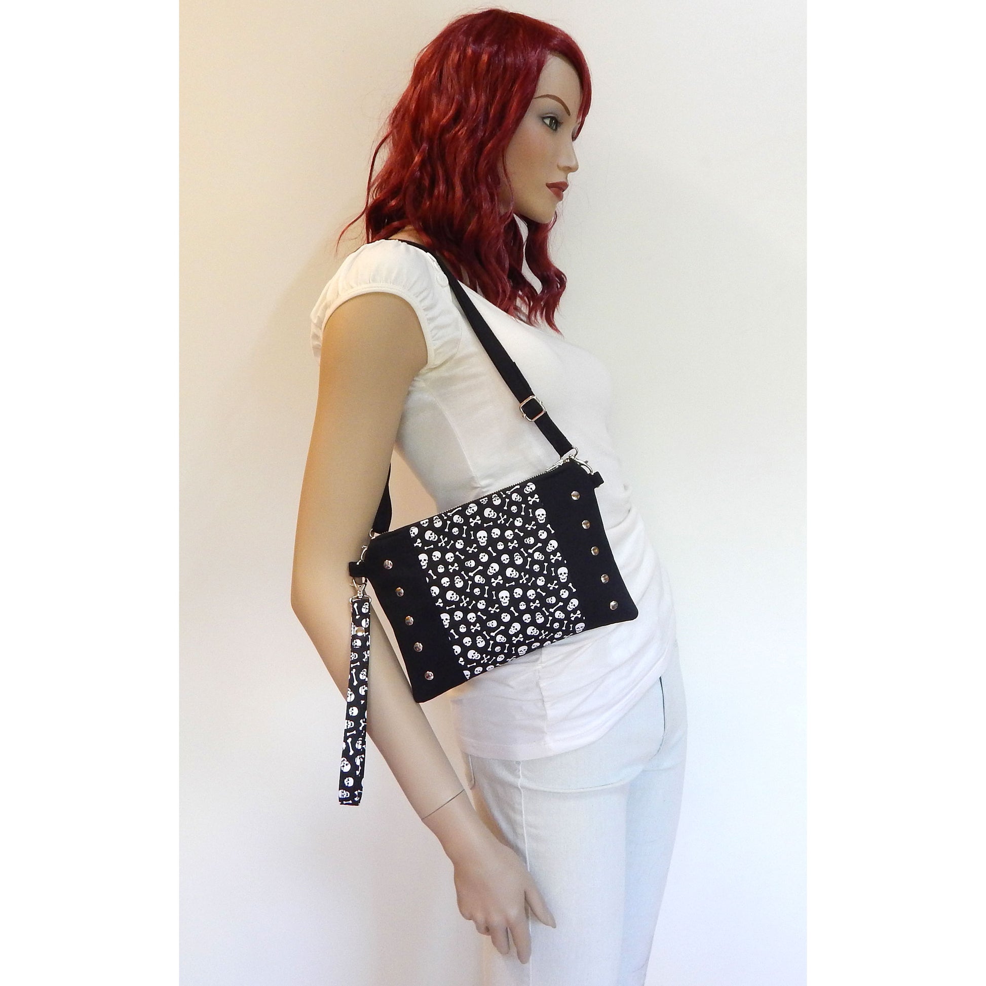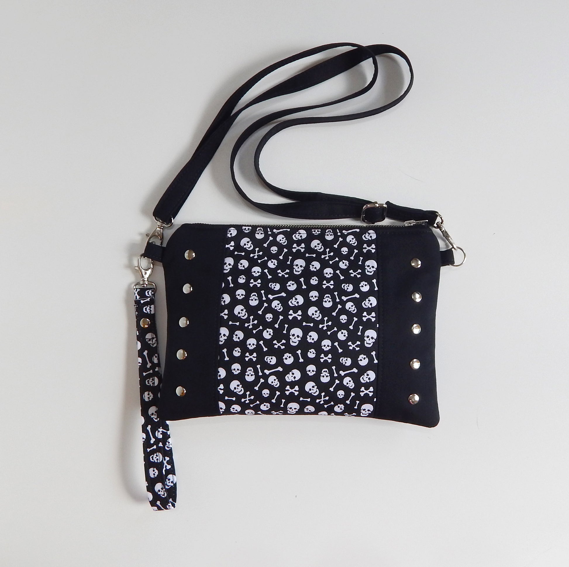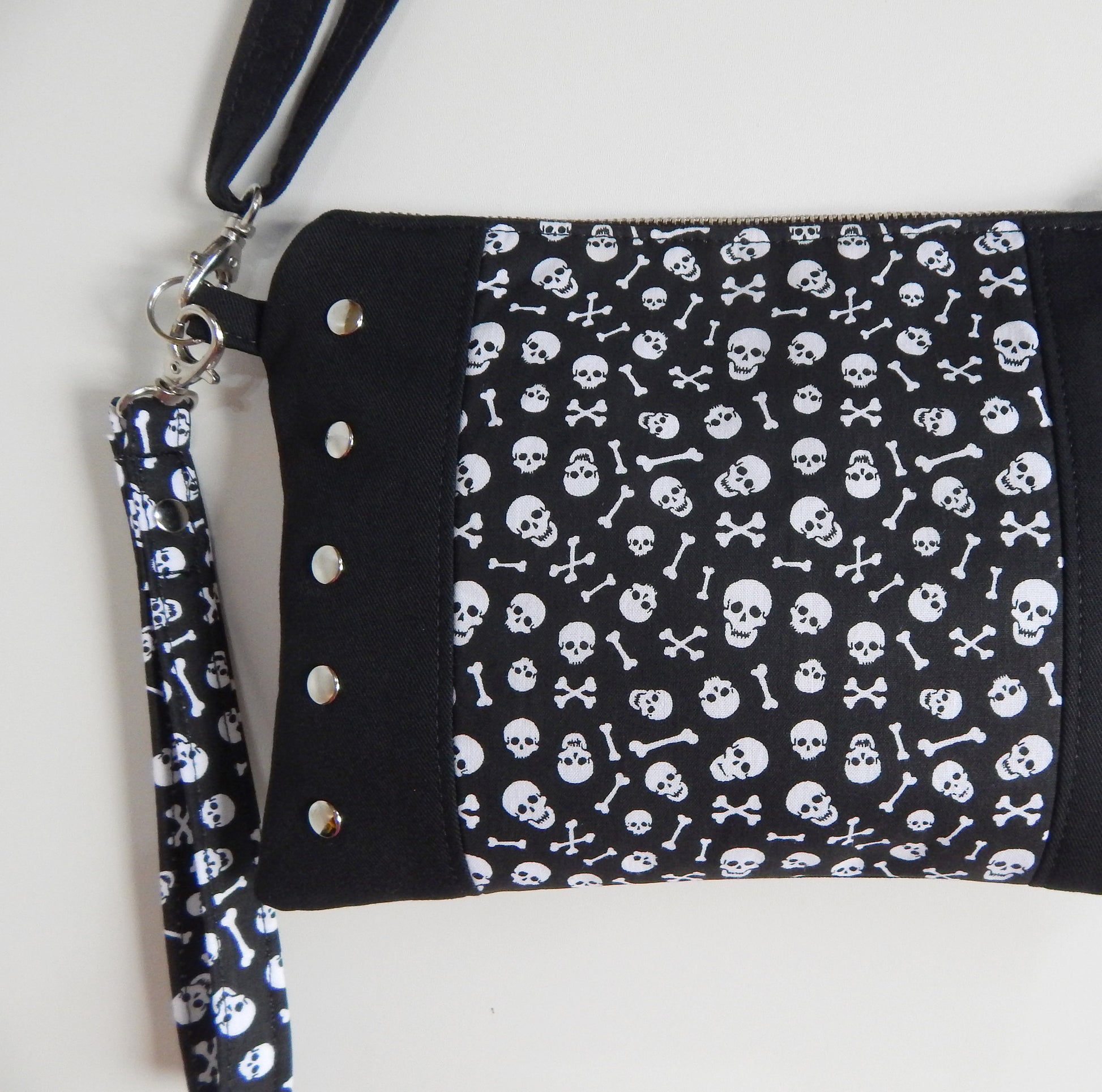 Wristlet skulls print handbag made of black cotton twill (mix cotton-polyester twill) and skulls print cotton canvas (black canvas, white skulls print), decorated with metal rivets . The bag is lined with black white striped canvas lining and has a zippered closure on the front.