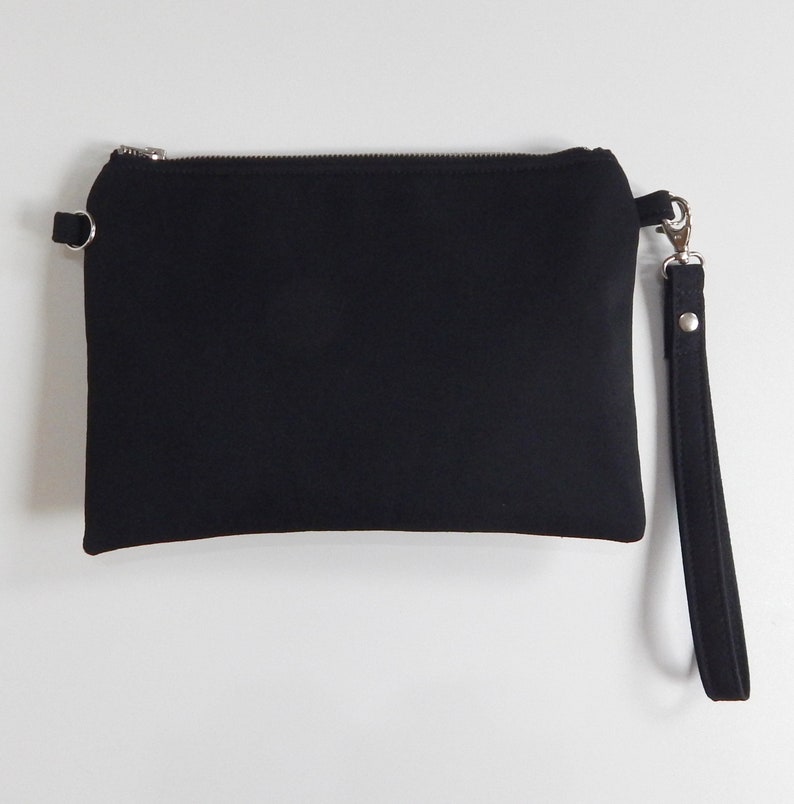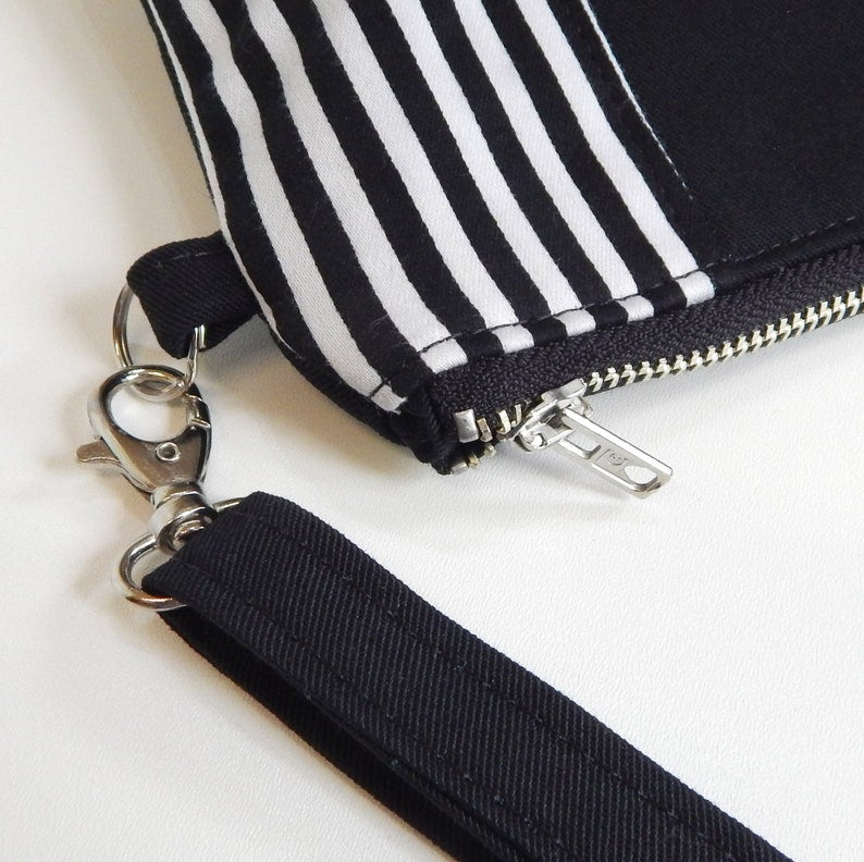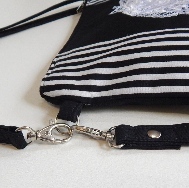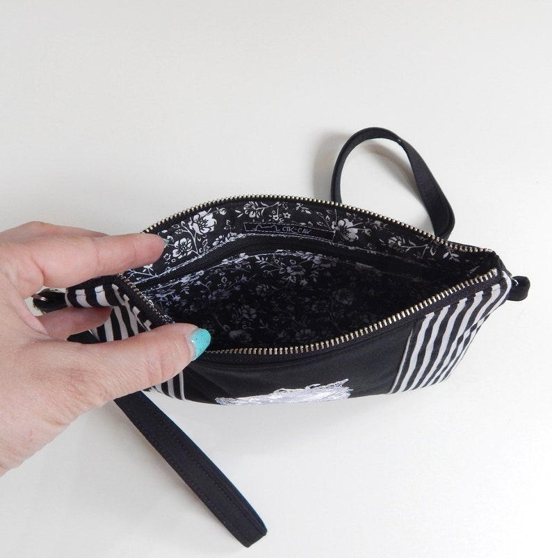 Wristlet gothic handbag made of black cotton twill (mix cotton-polyester twill), black - white striped cotton twill and machine embroidered rose . The bag is lined with black white floral canvas lining and has a zippered closure on the front.