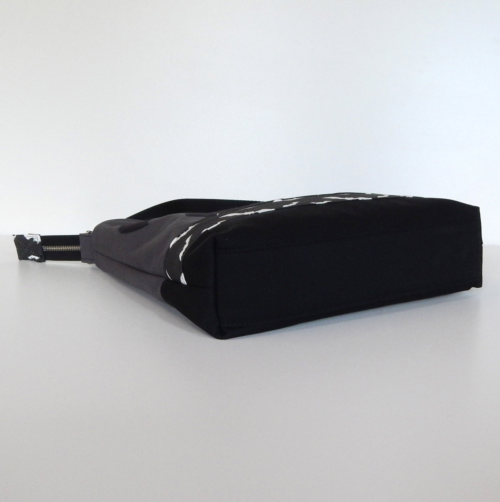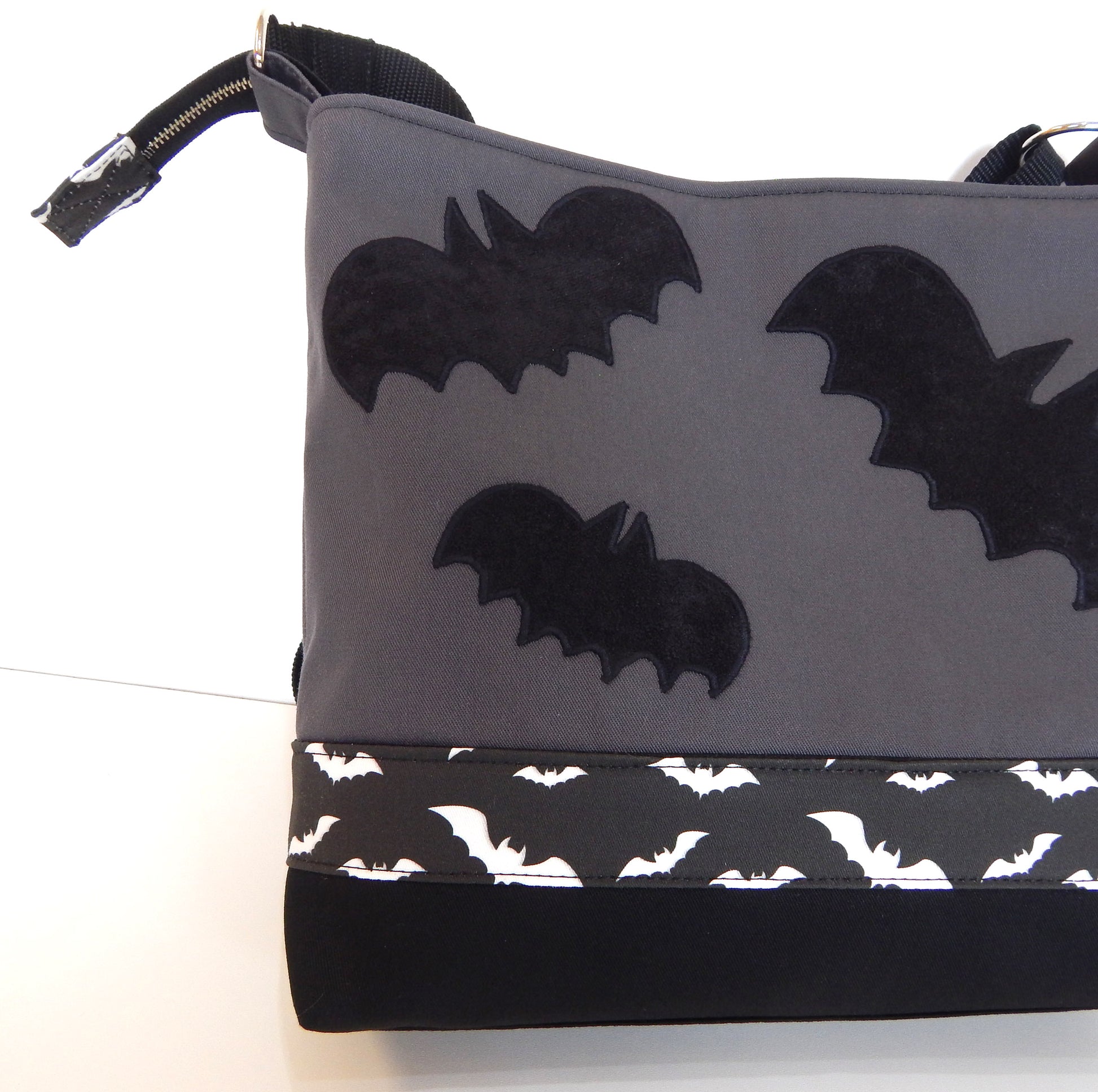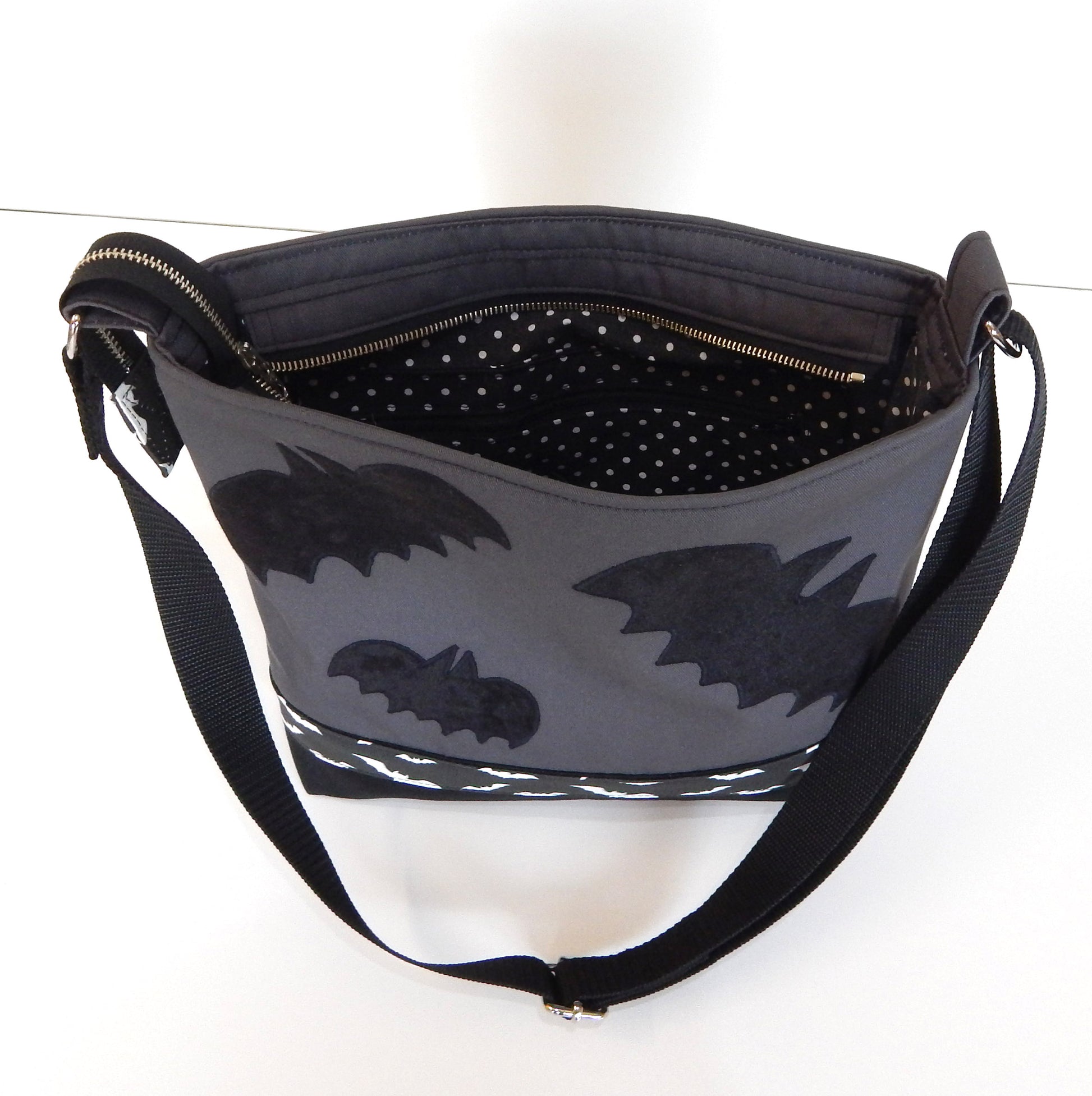 Bat gothic bag made of heavy weight durable mix fabrics: cotton-polyester black and gray canvas, and polka dot black - white cotton canvas lining .