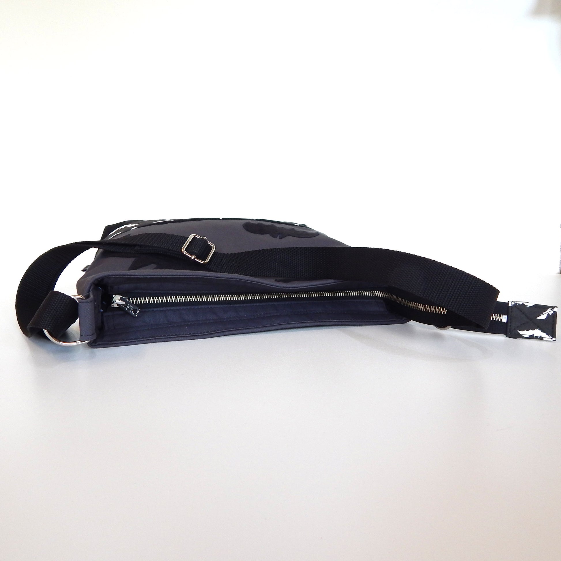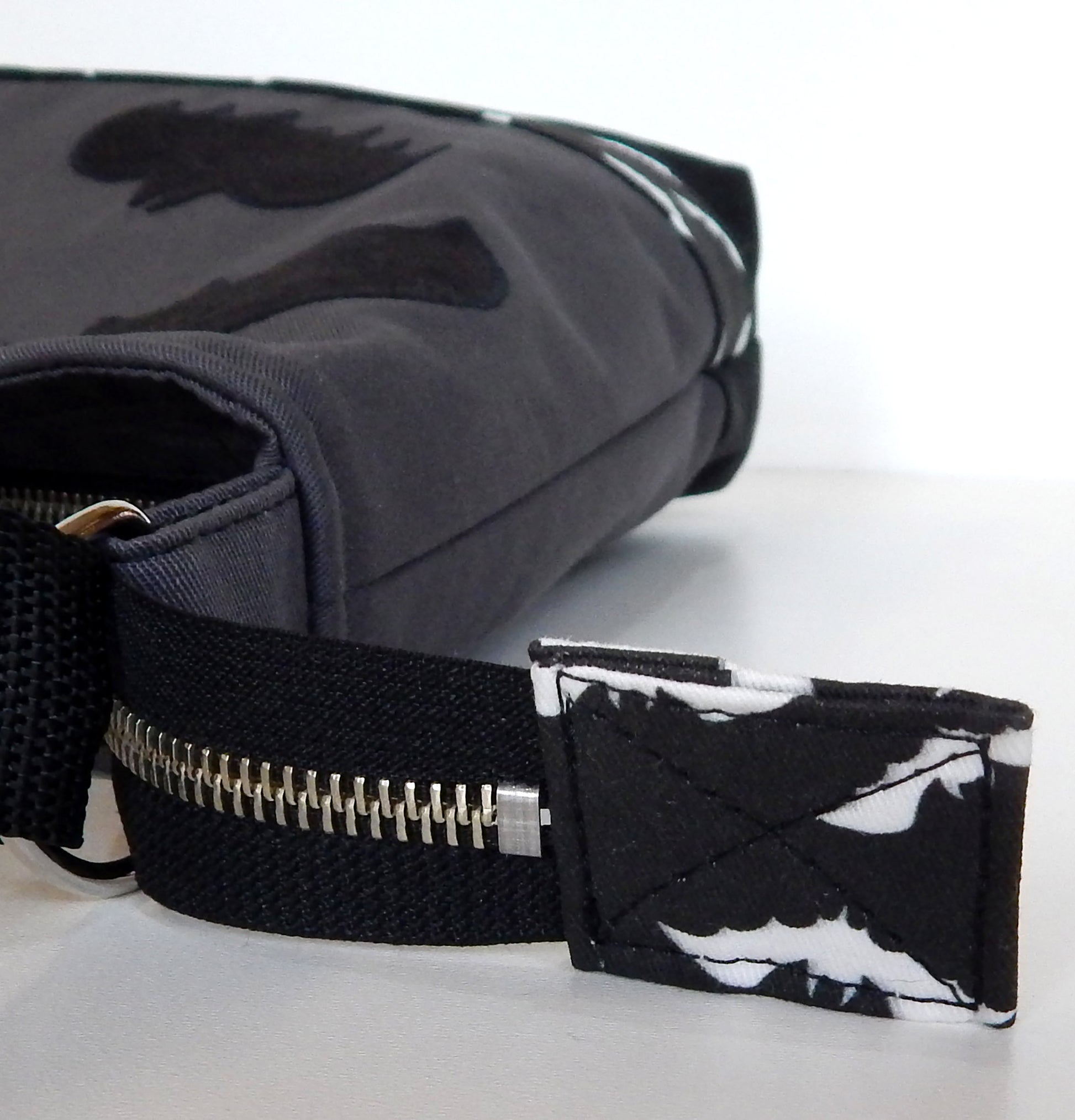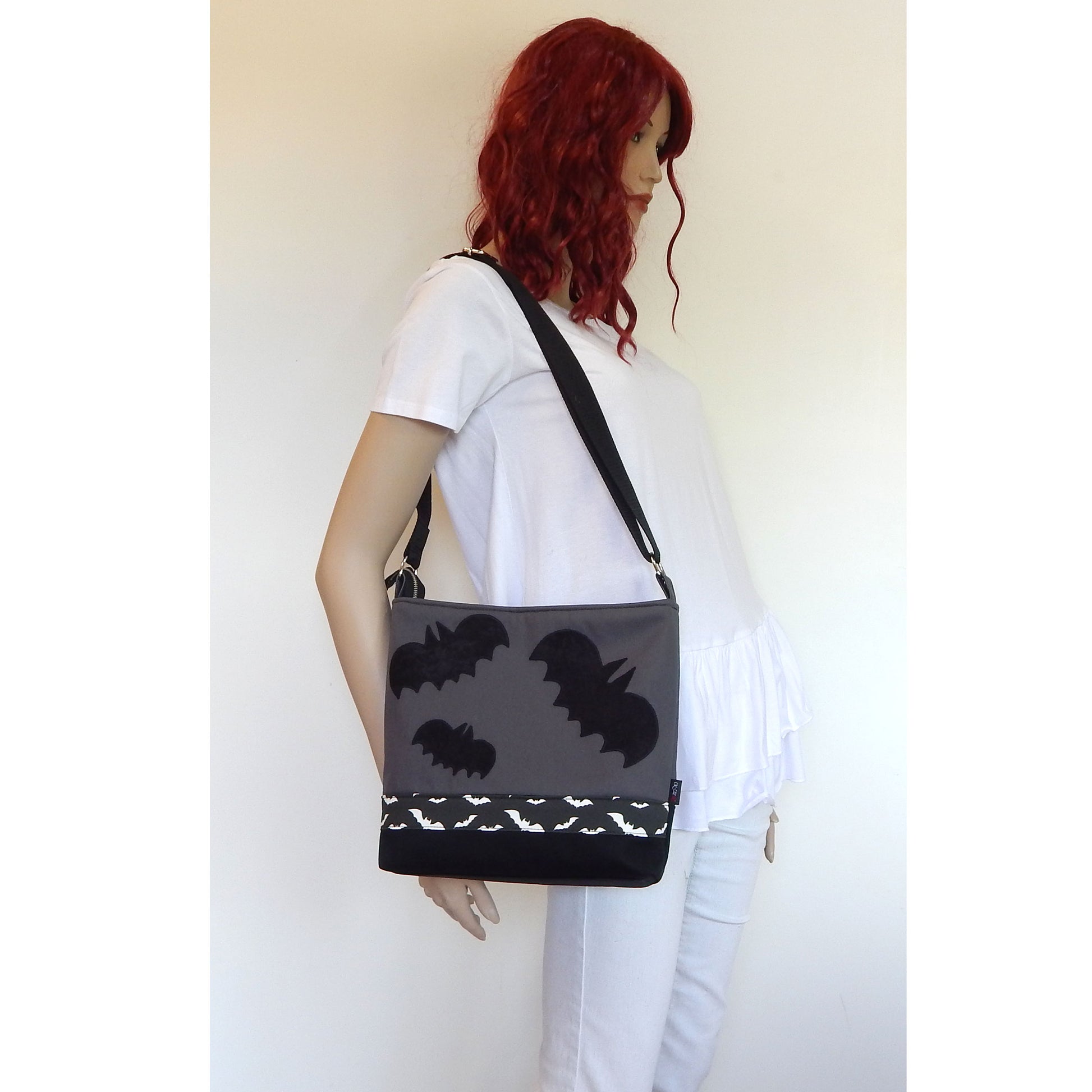 Bat gothic bag made of heavy weight durable mix fabrics: cotton-polyester black and gray canvas, and polka dot black - white cotton canvas lining .