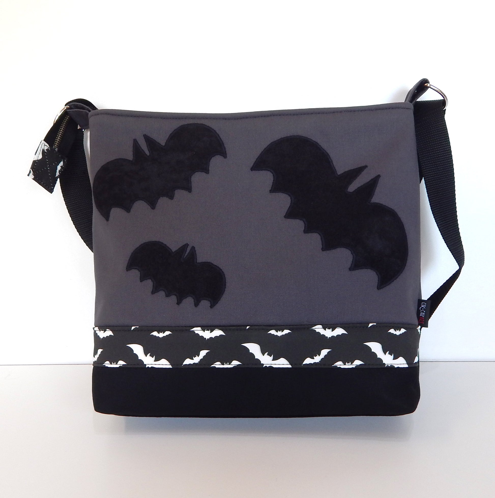 On the front, the handbag is decorated with bats border strap and bats applique in black color.