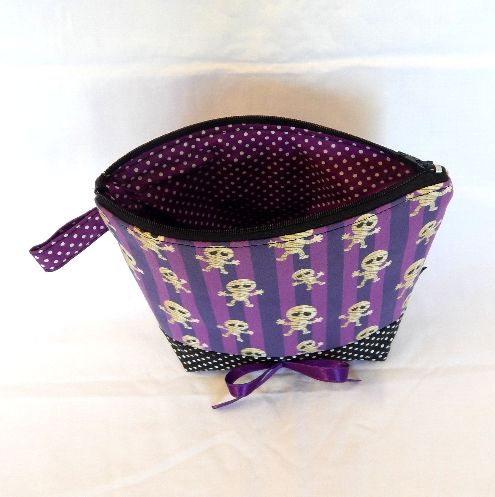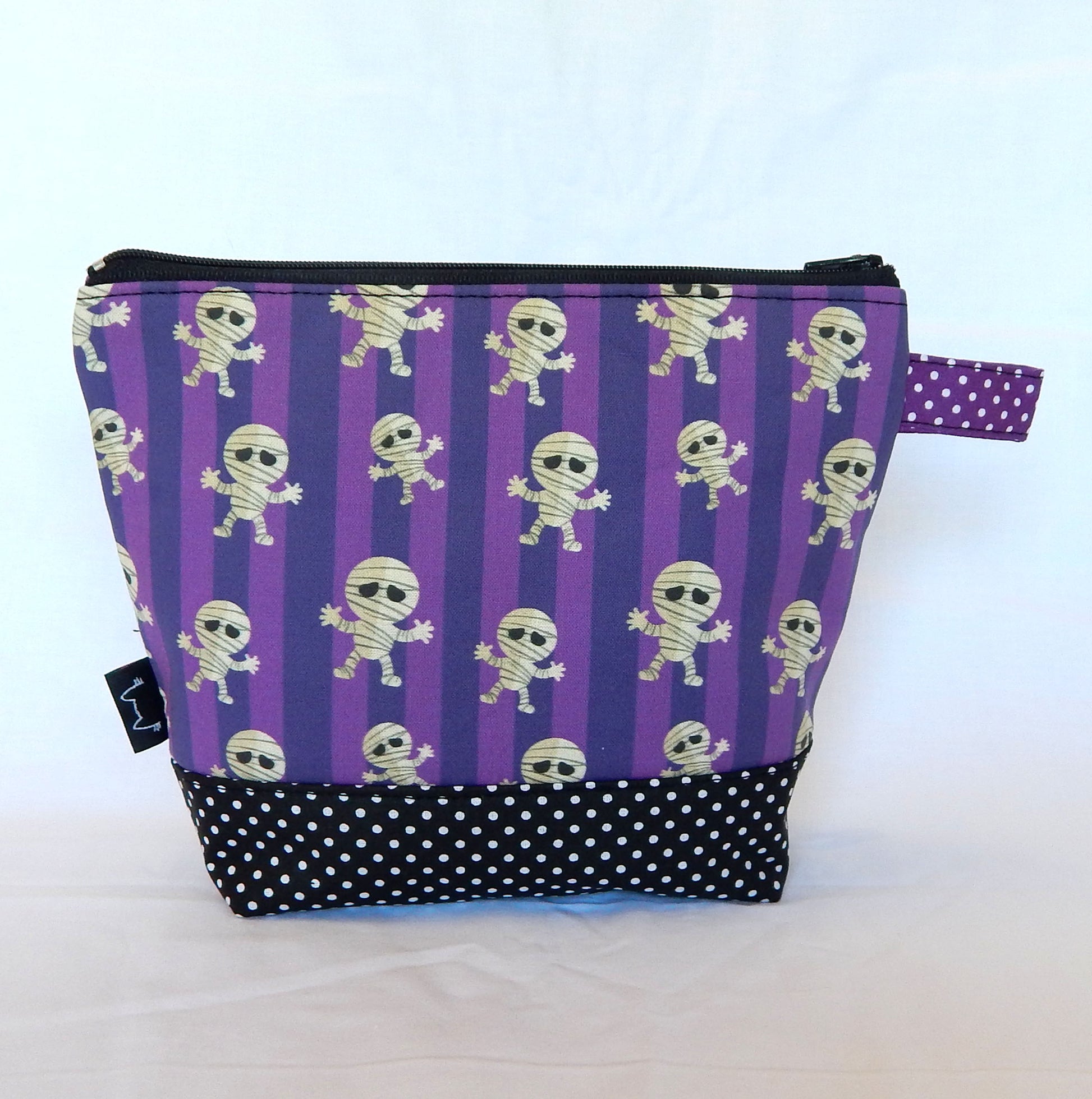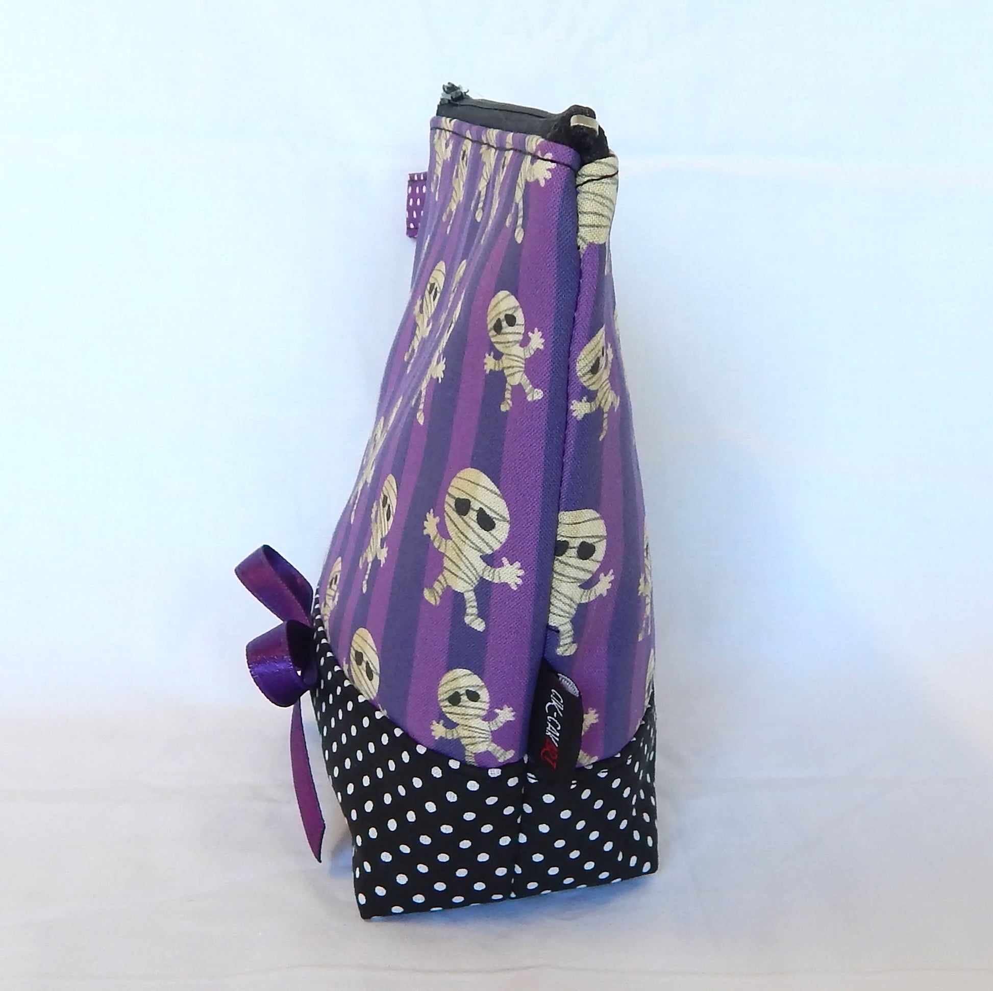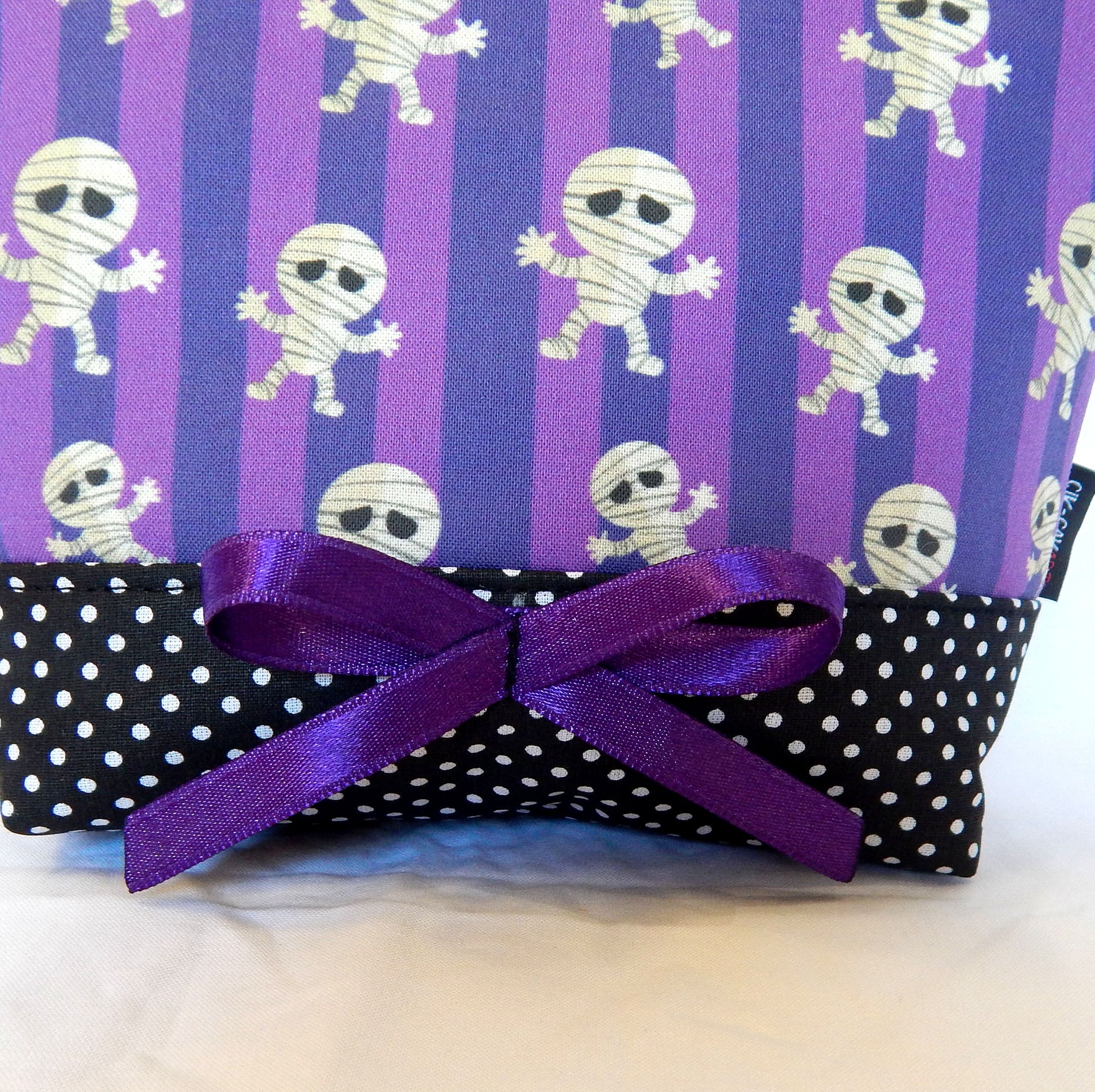 Materials: Crafted from spooky mummy purple-print cotton canvas with purple cotton polka dot lining for durability. Combination witk black-white polka dot bottom.