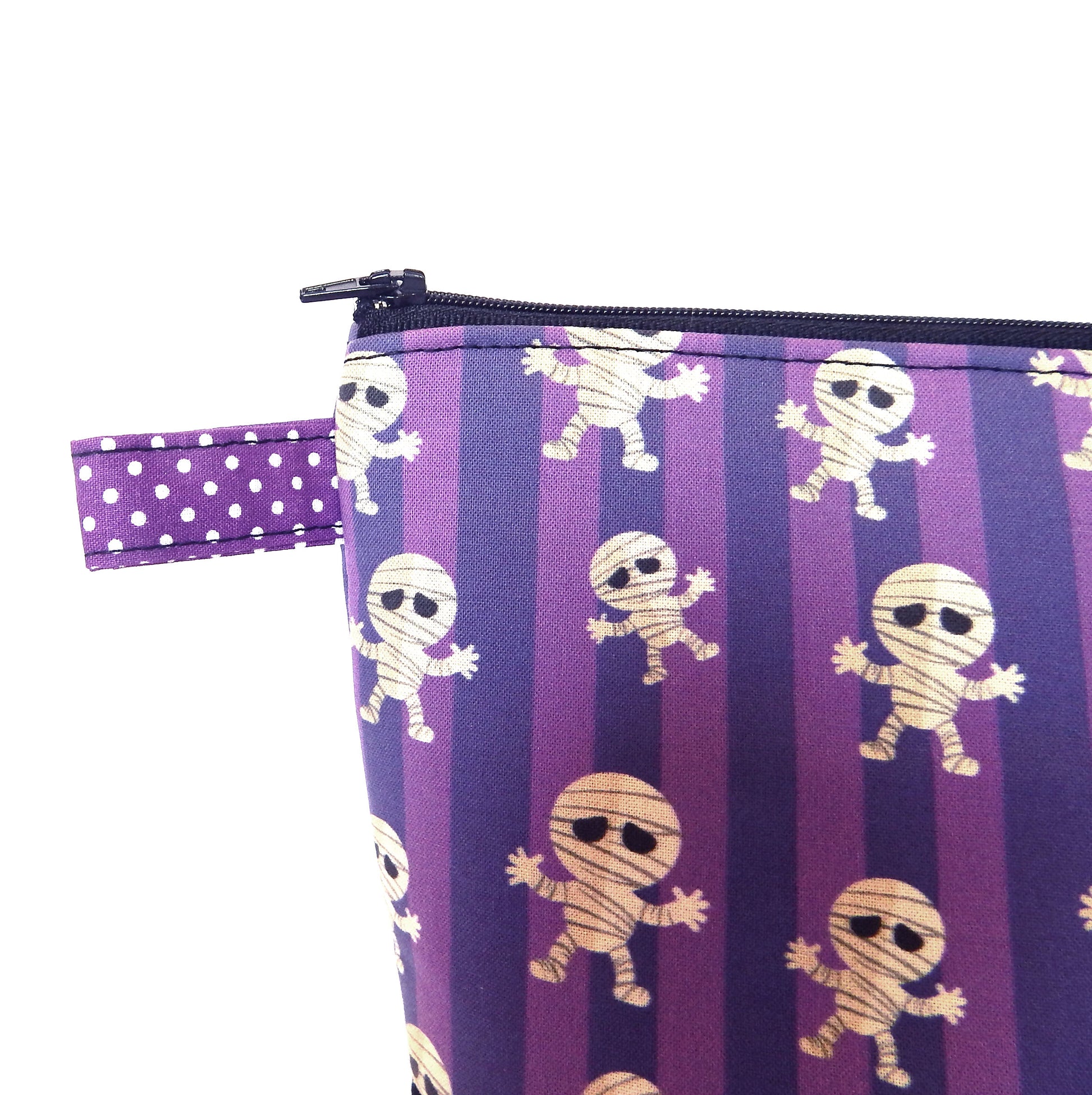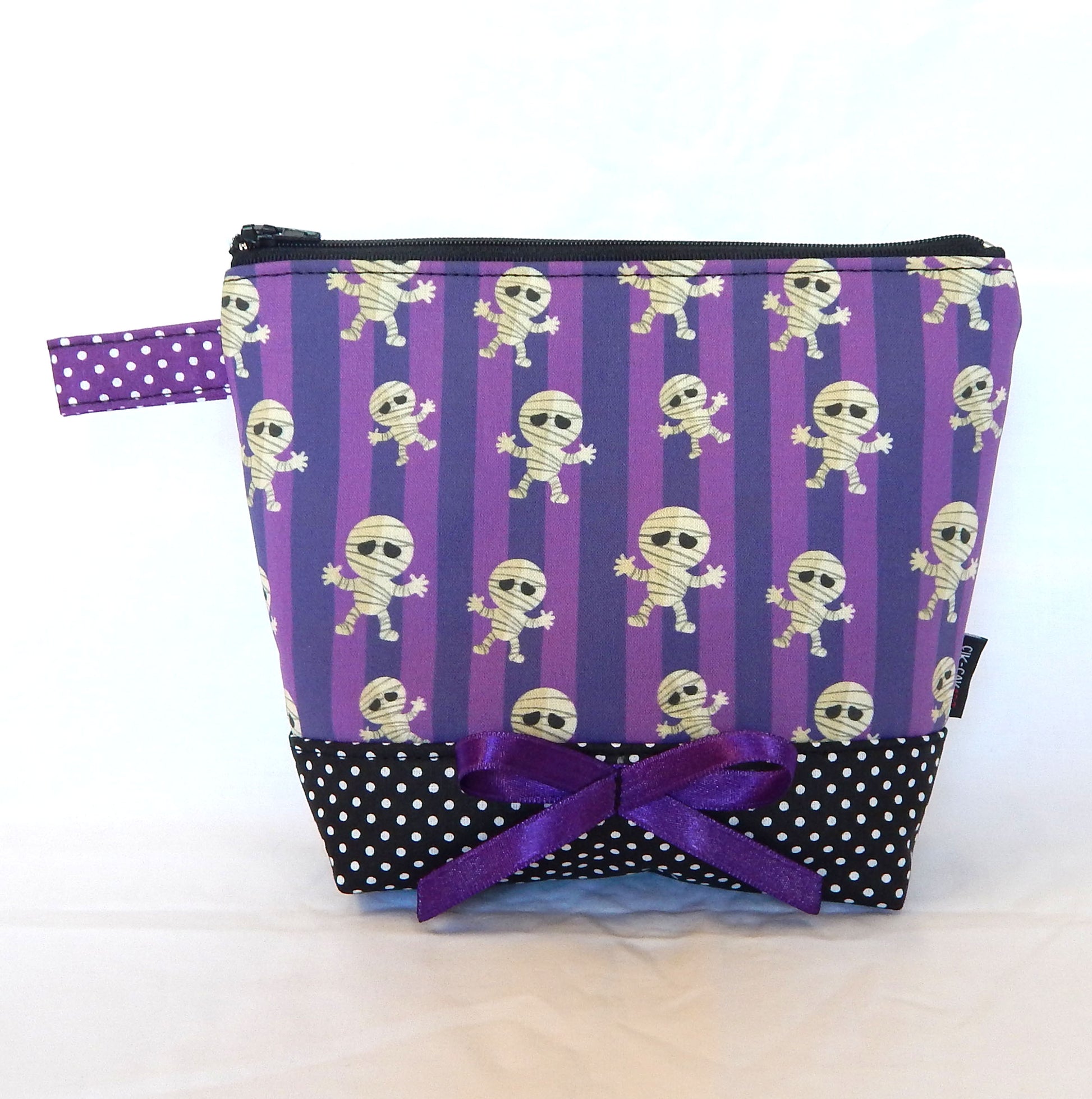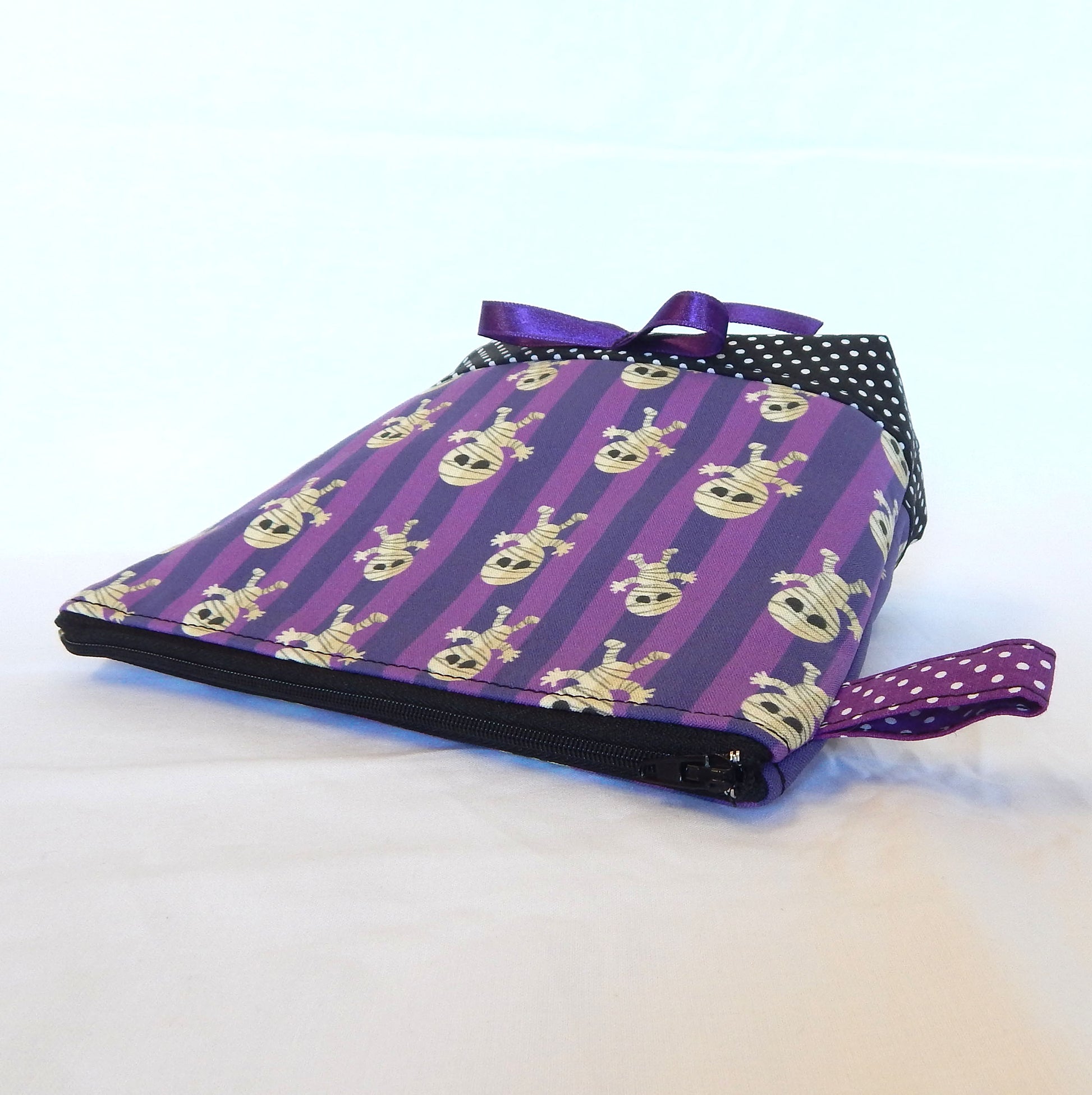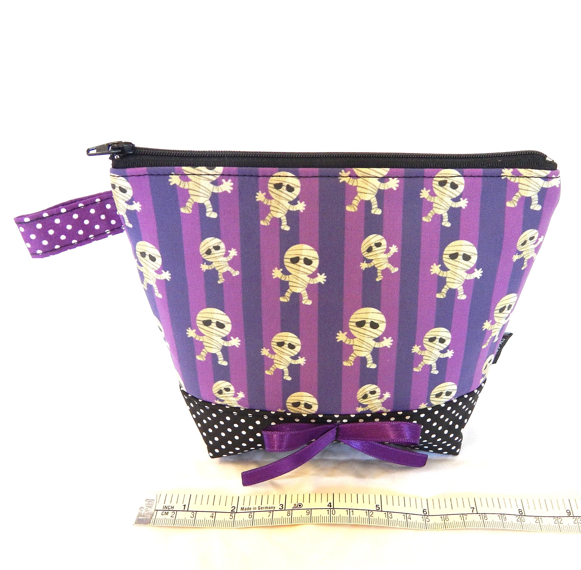 Materials: Crafted from spooky mummy purple-print cotton canvas with purple cotton polka dot lining for durability. Combination witk black-white polka dot bottom.
