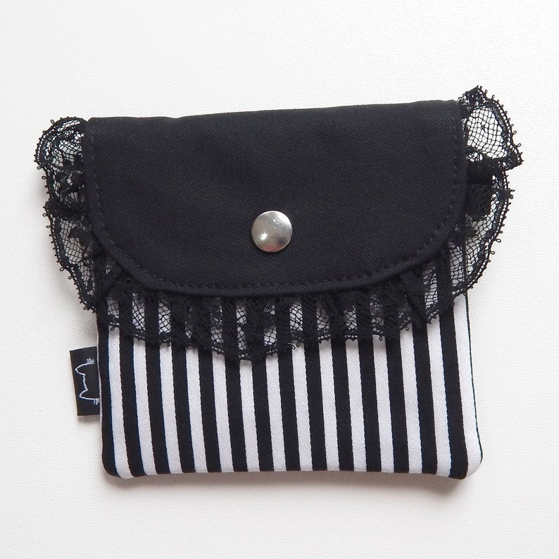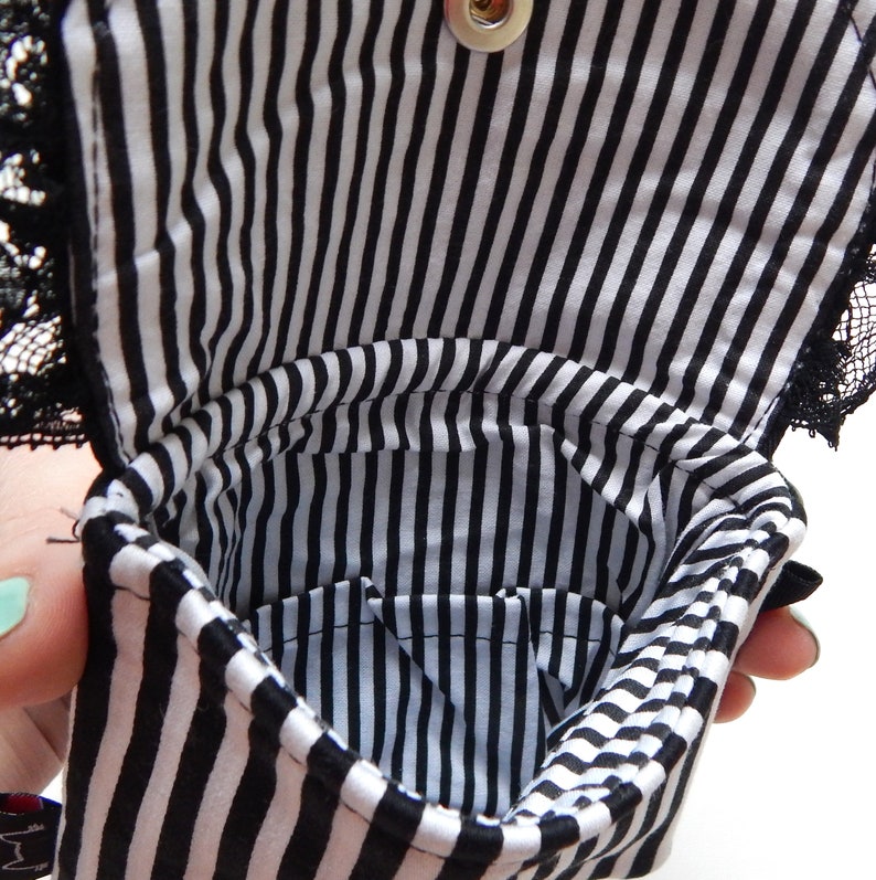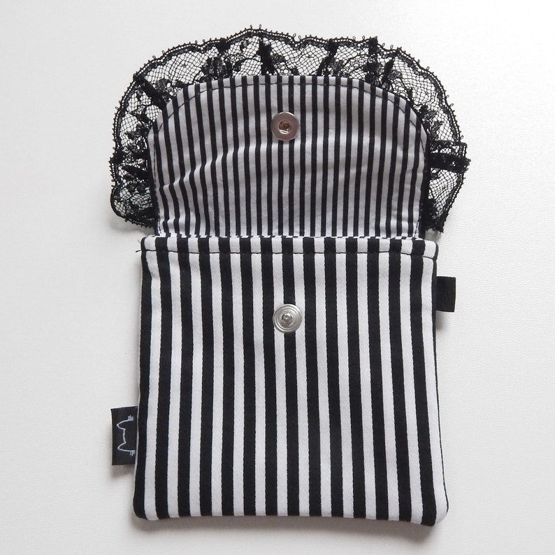 The pouch is made of black cotton- polyester twill, striped black white twill and is lined with striped black white cotton canvas lining inside.