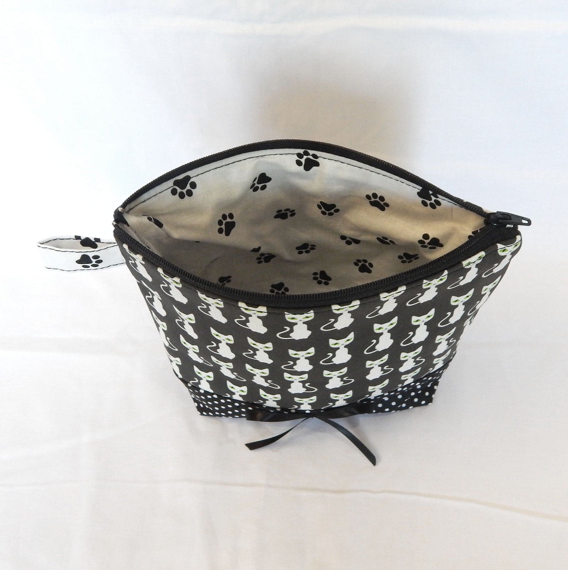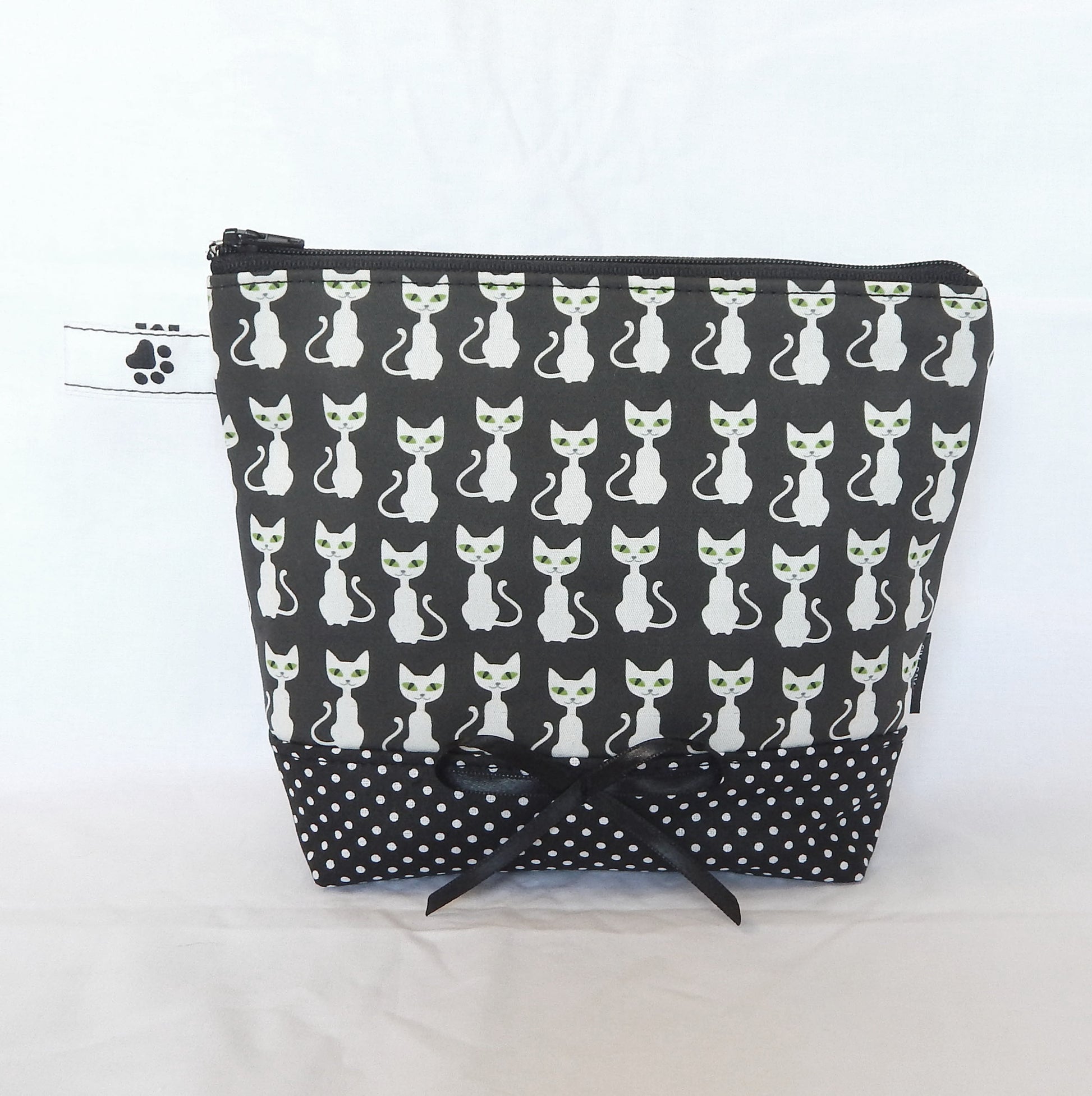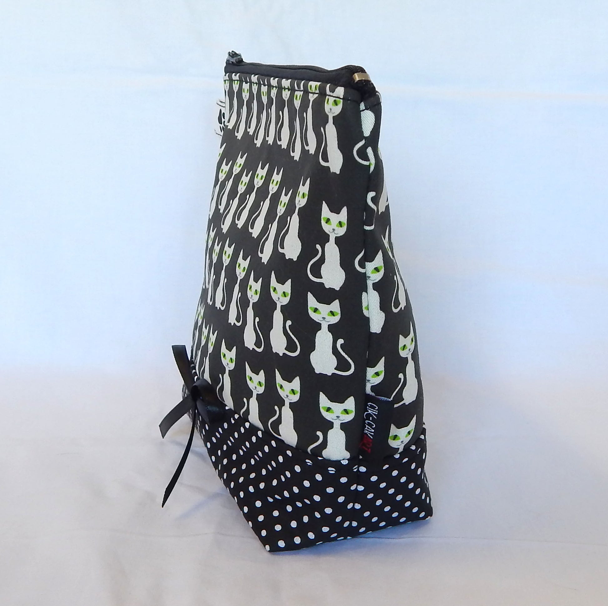 Materials: Crafted from cat print cotton canvas with paw print cotton lining for durability. Combination witk black-white polka dot bottom.