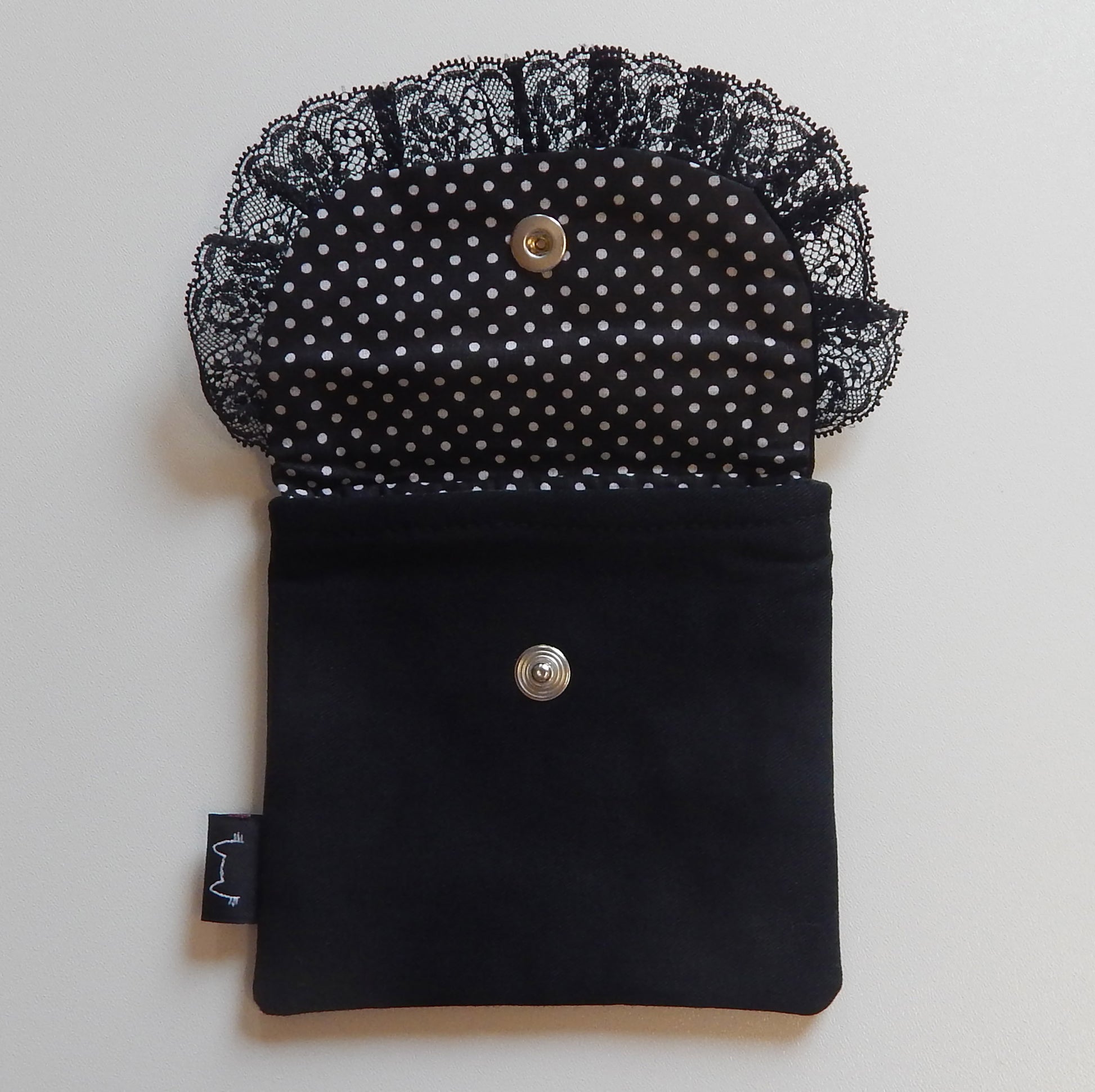 Finishing Touches: Black lace trim on the flap, secured with a silver-tone metal snap button