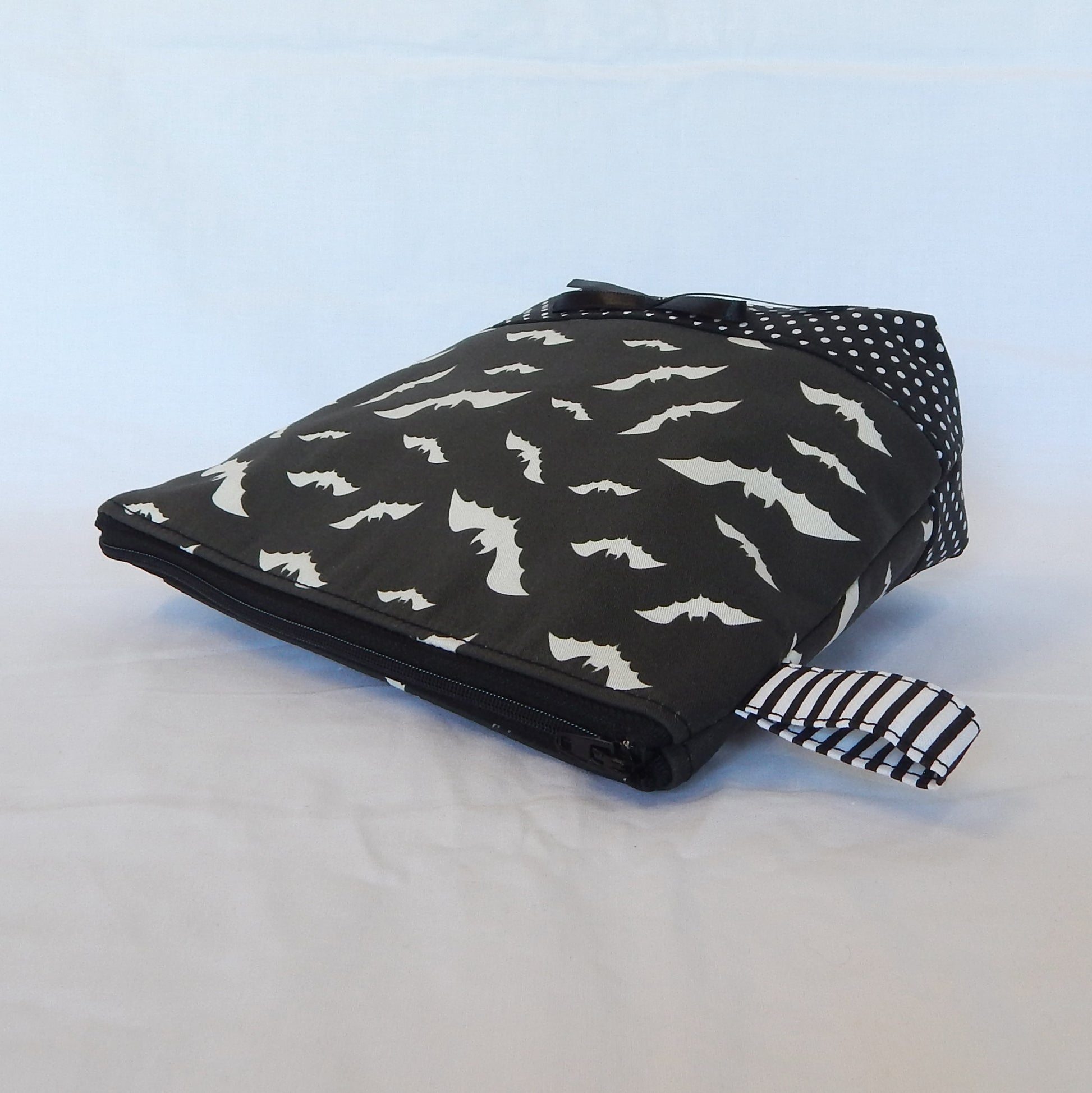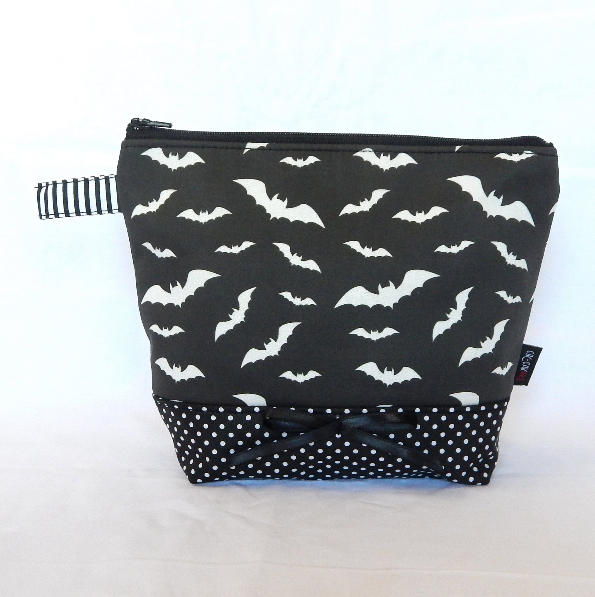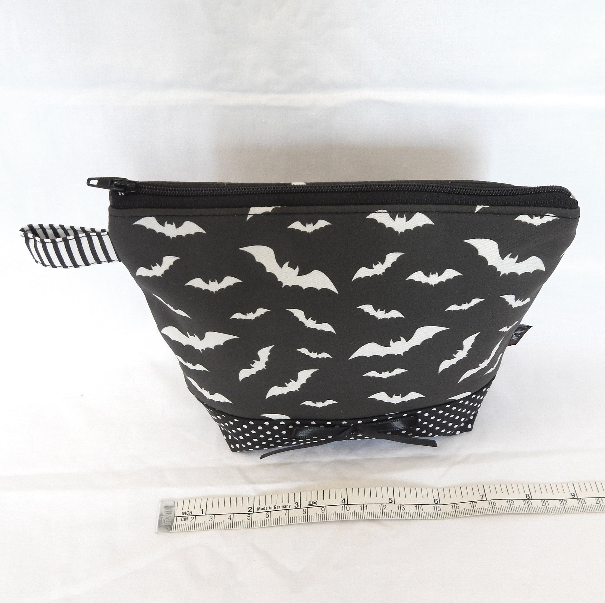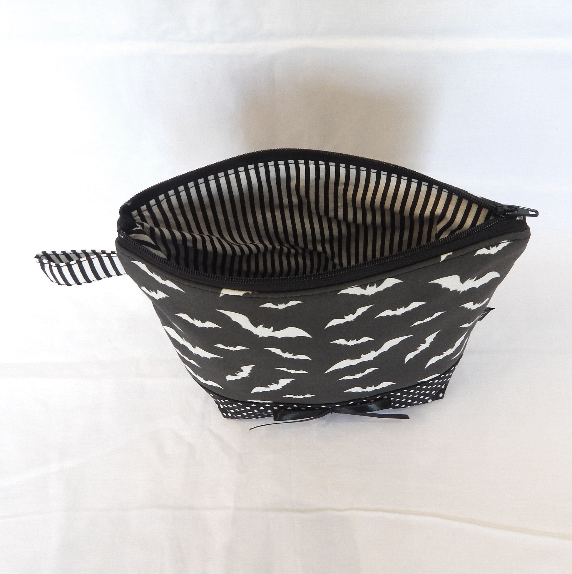 Add a touch of dark elegance to your daily routine with this handmade cotton canvas cosmetic bag featuring a bat print—perfect for Halloween lovers and gothic style enthusiasts.
