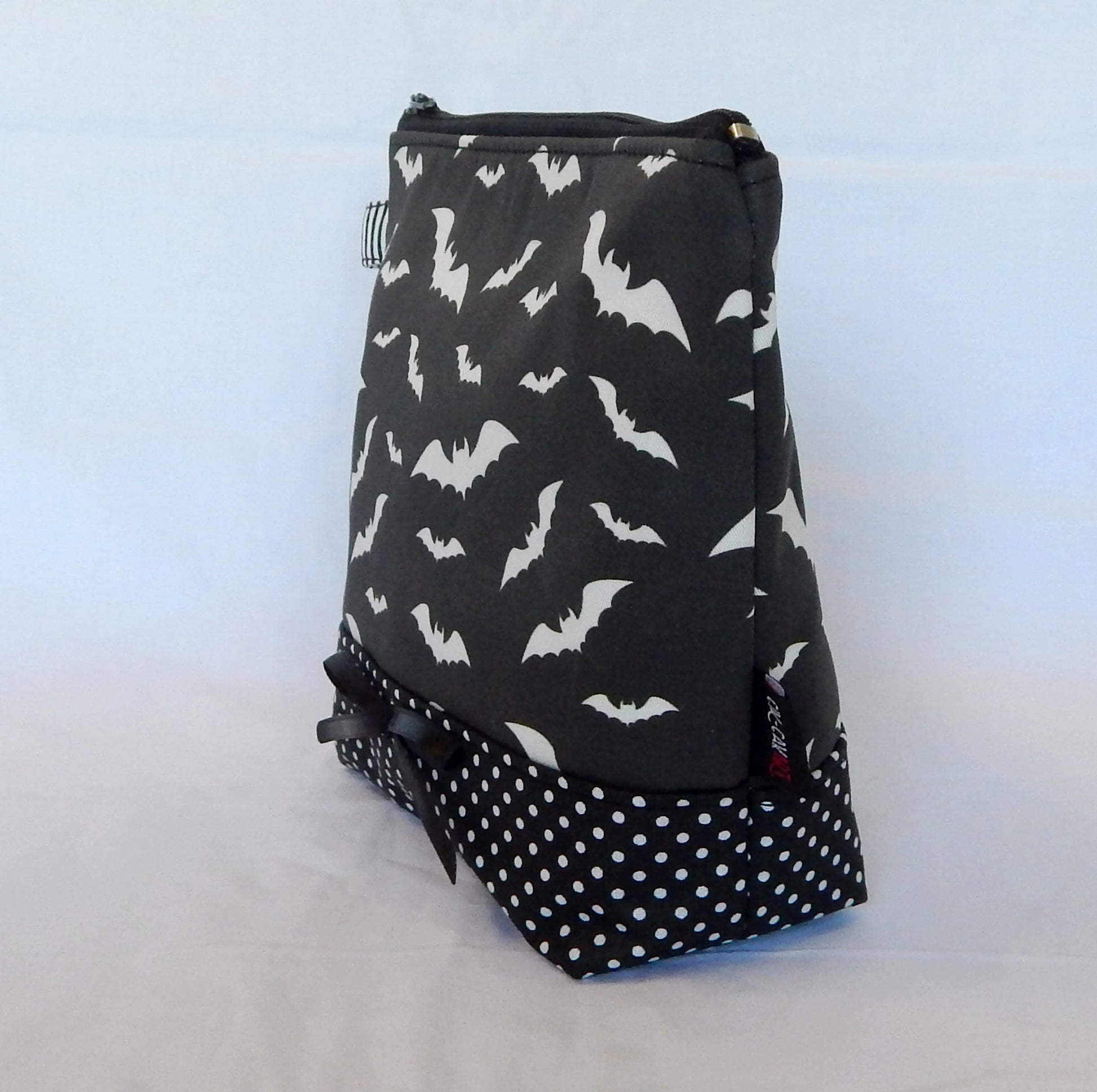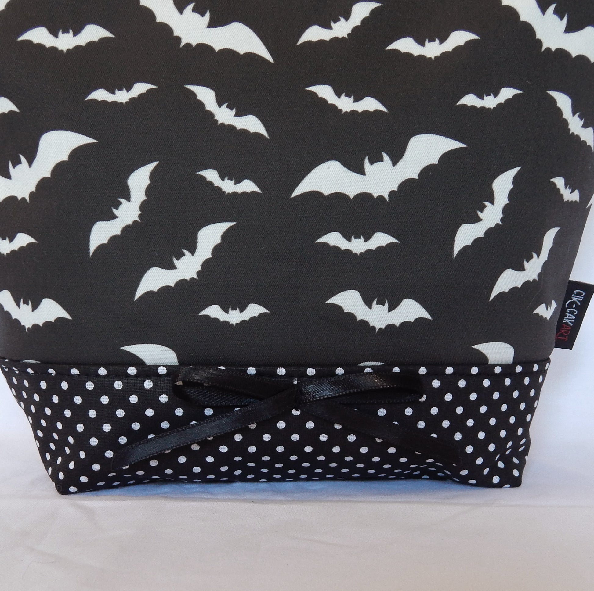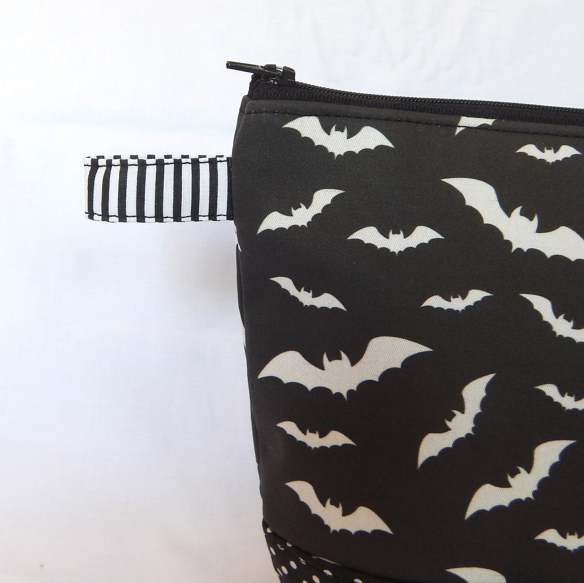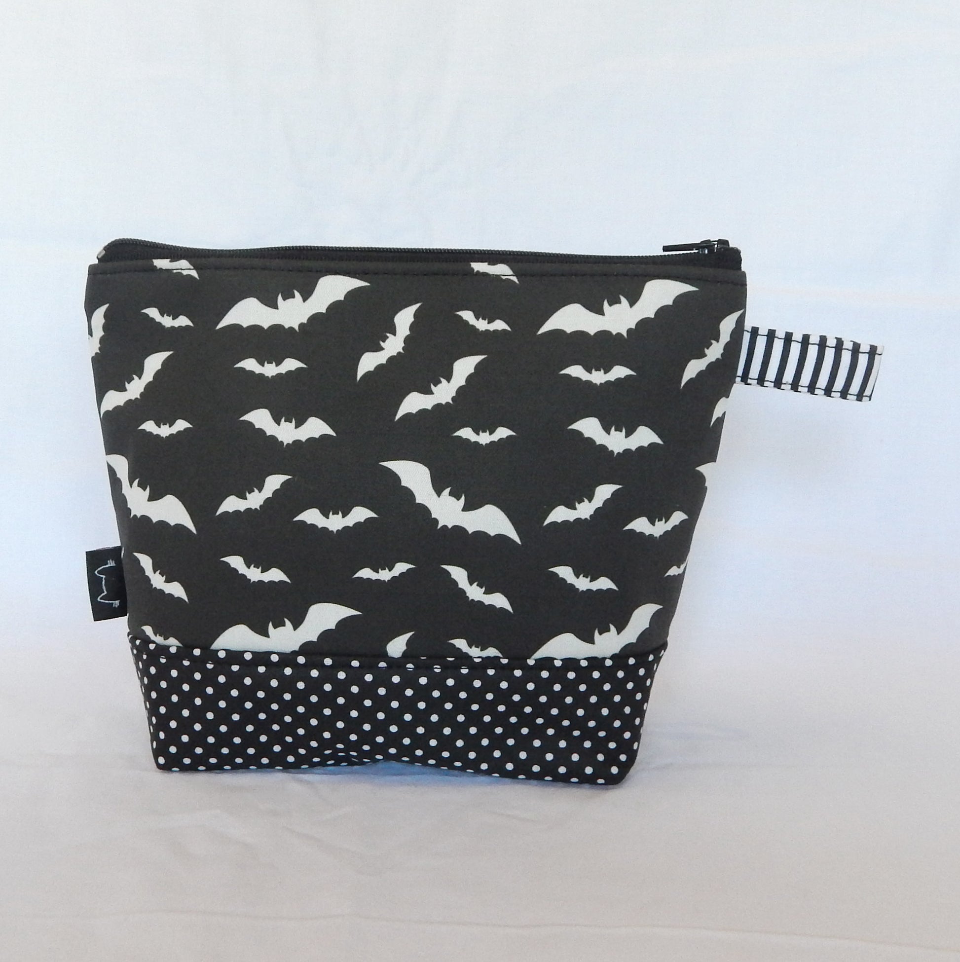 Add a touch of dark elegance to your daily routine with this handmade cotton canvas cosmetic bag featuring a bat print—perfect for Halloween lovers and gothic style enthusiasts.