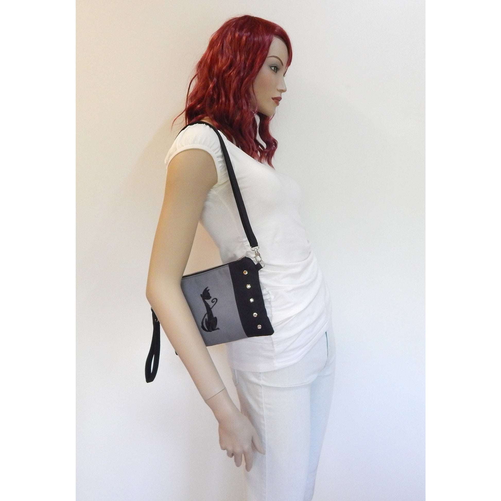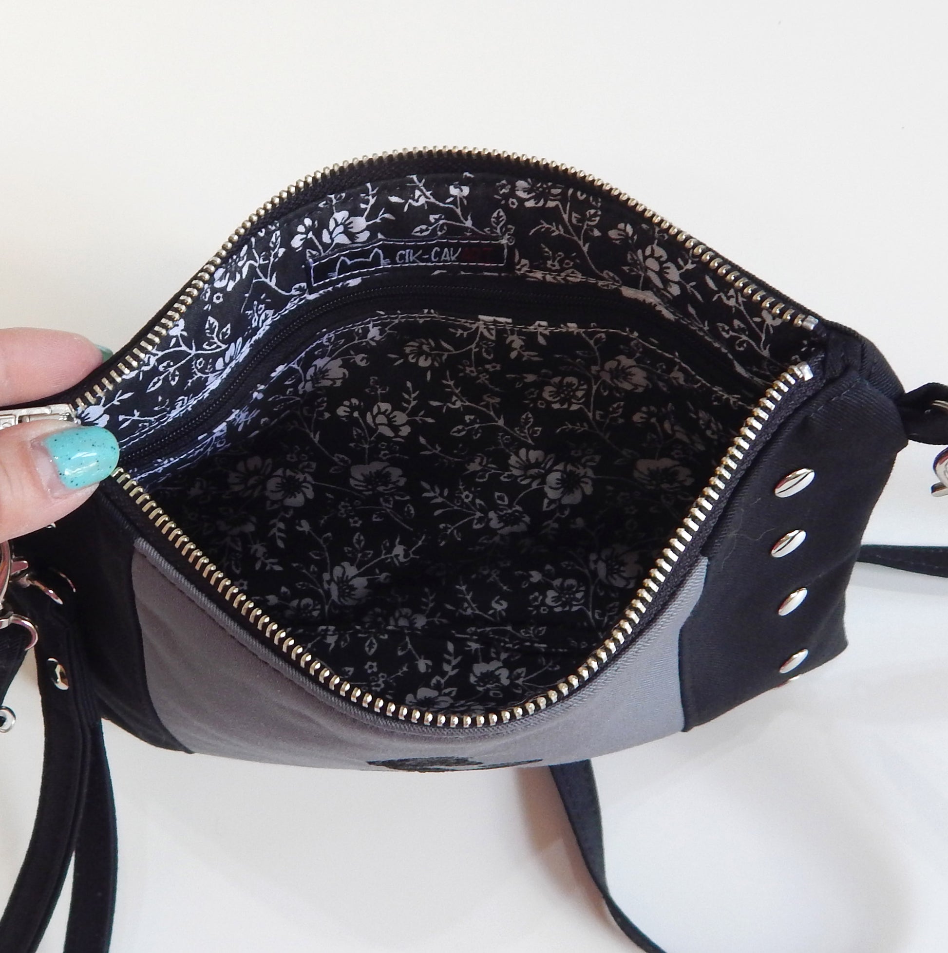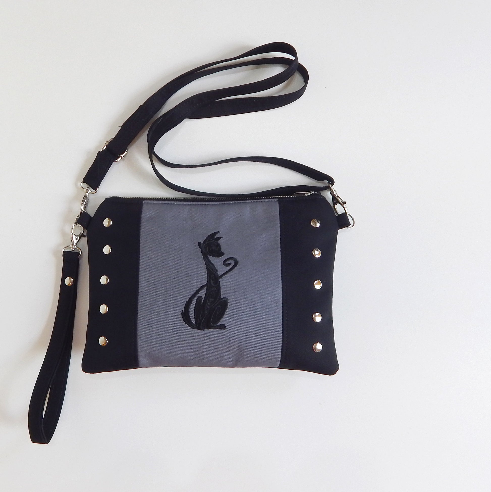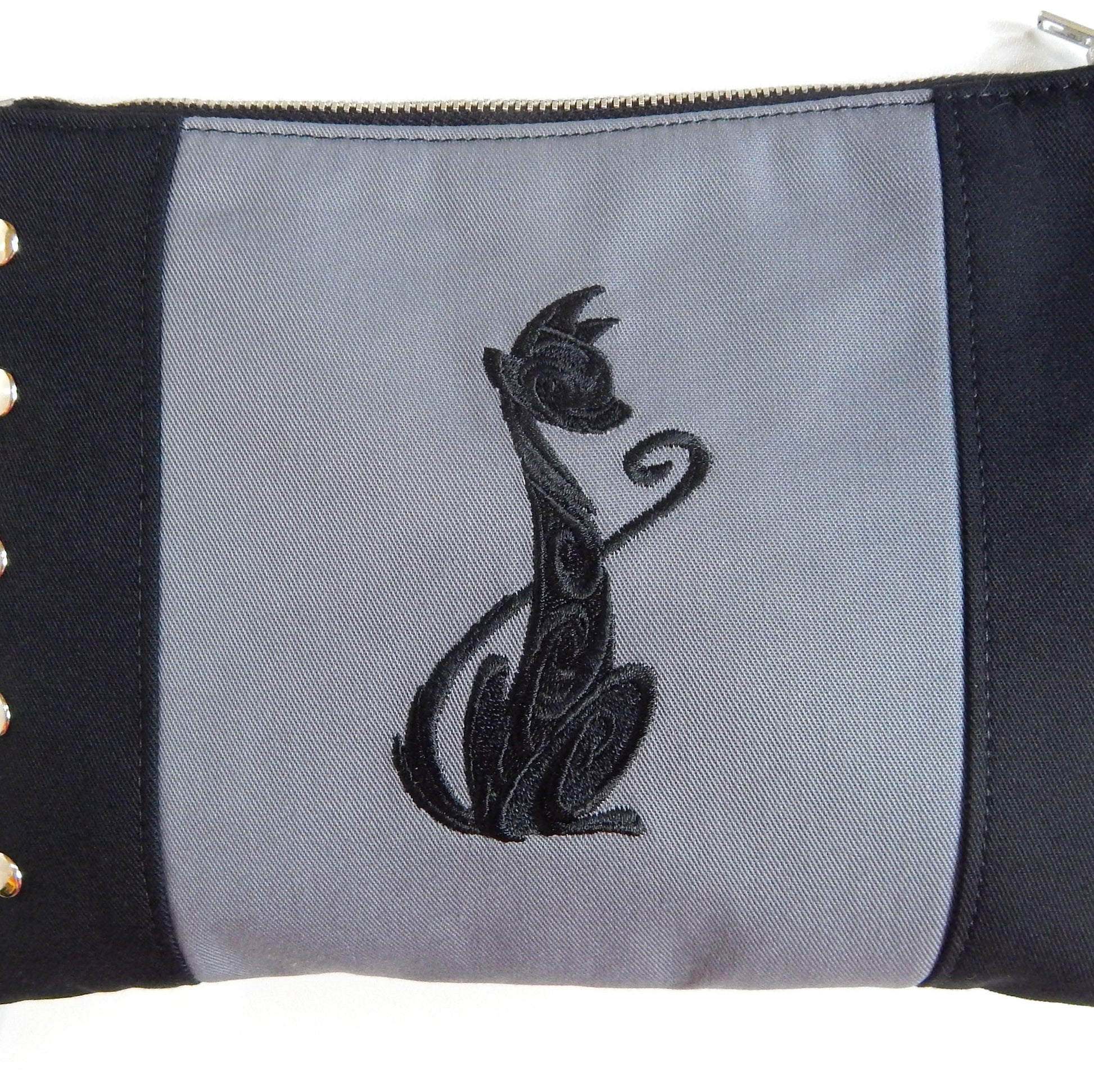 Materials: Made of black and gray cotton twill (cotton-polyester blend) with a machine-embroidered black cat design. Lined with black and white floral canvas for durability and charm. All metal parts are silver-toned for a sophisticated finish.