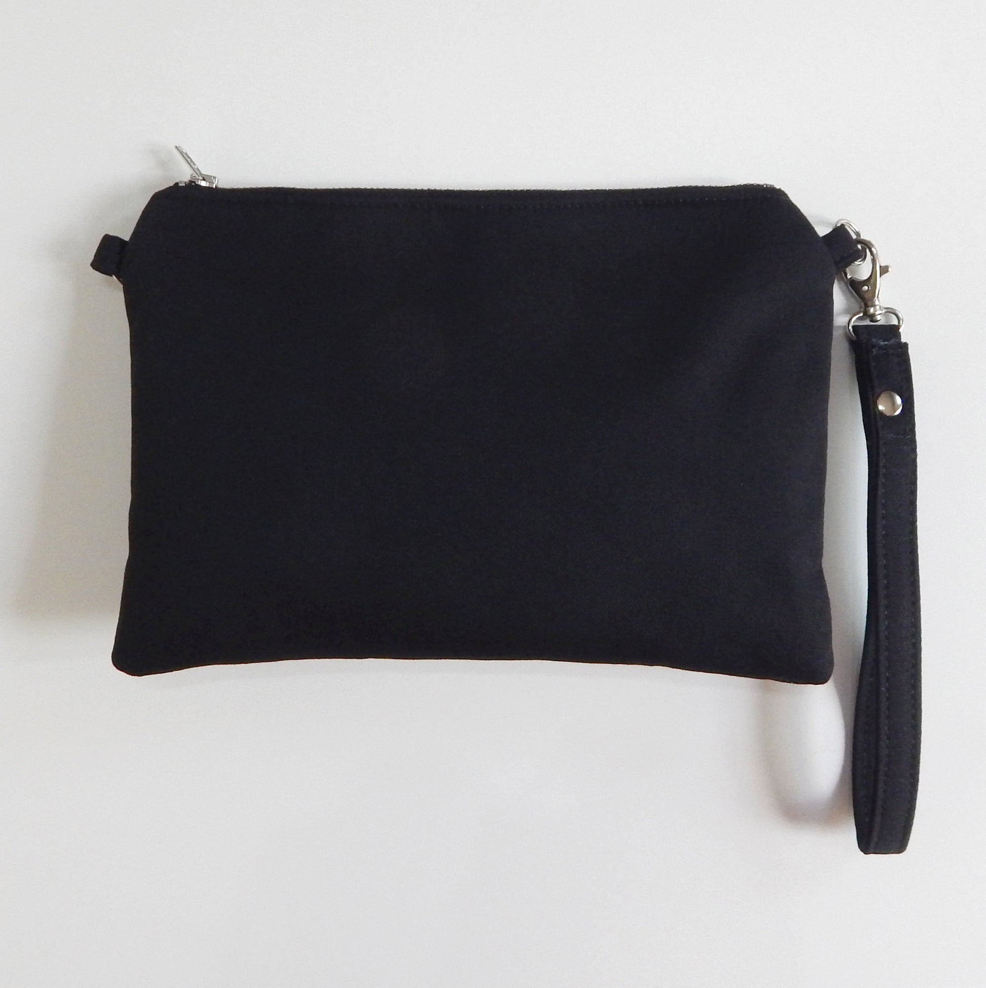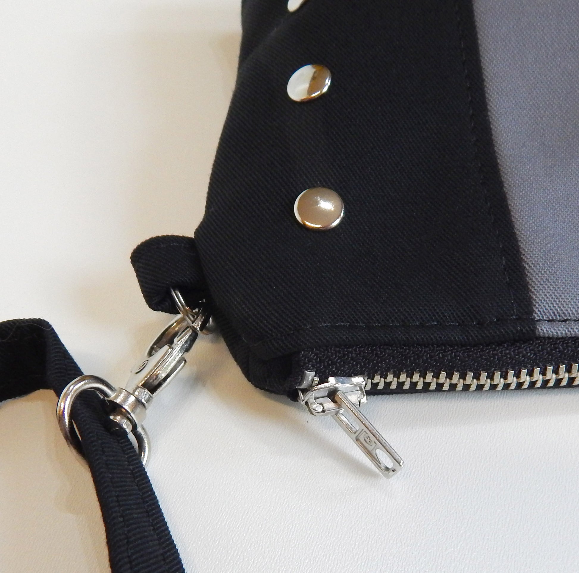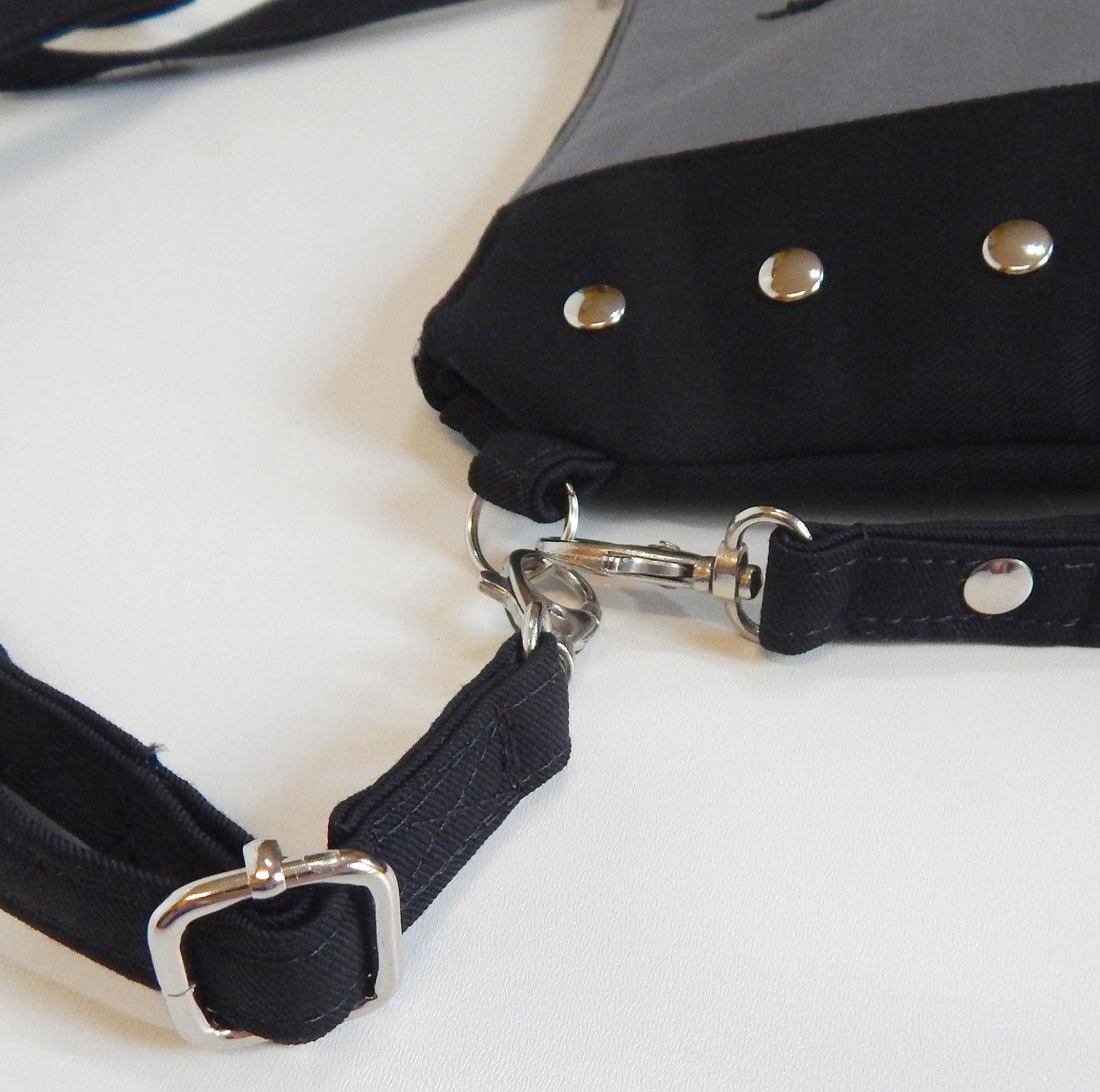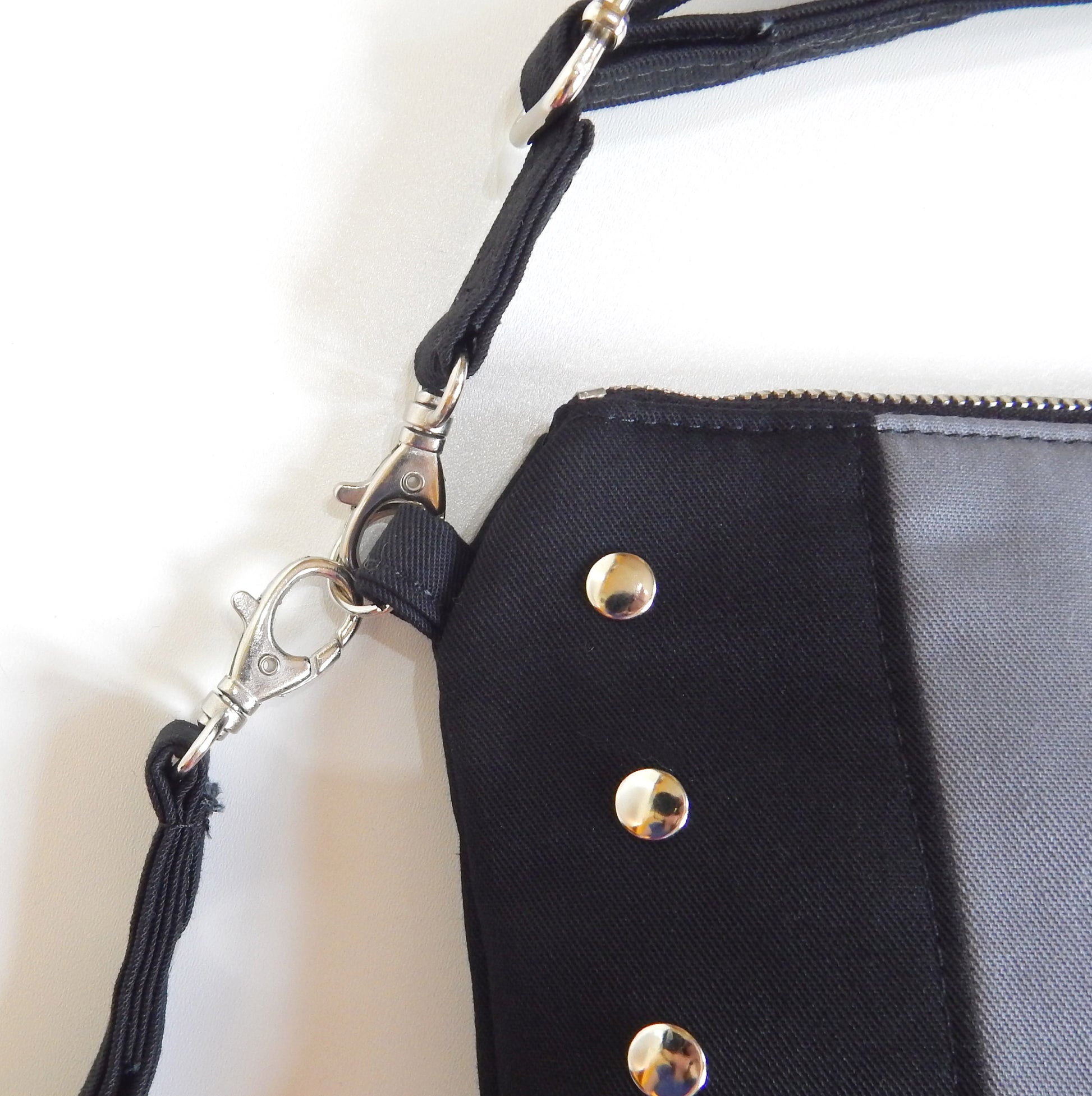 Materials: Made of black and gray cotton twill (cotton-polyester blend) with a machine-embroidered black cat design. Lined with black and white floral canvas for durability and charm. All metal parts are silver-toned for a sophisticated finish.