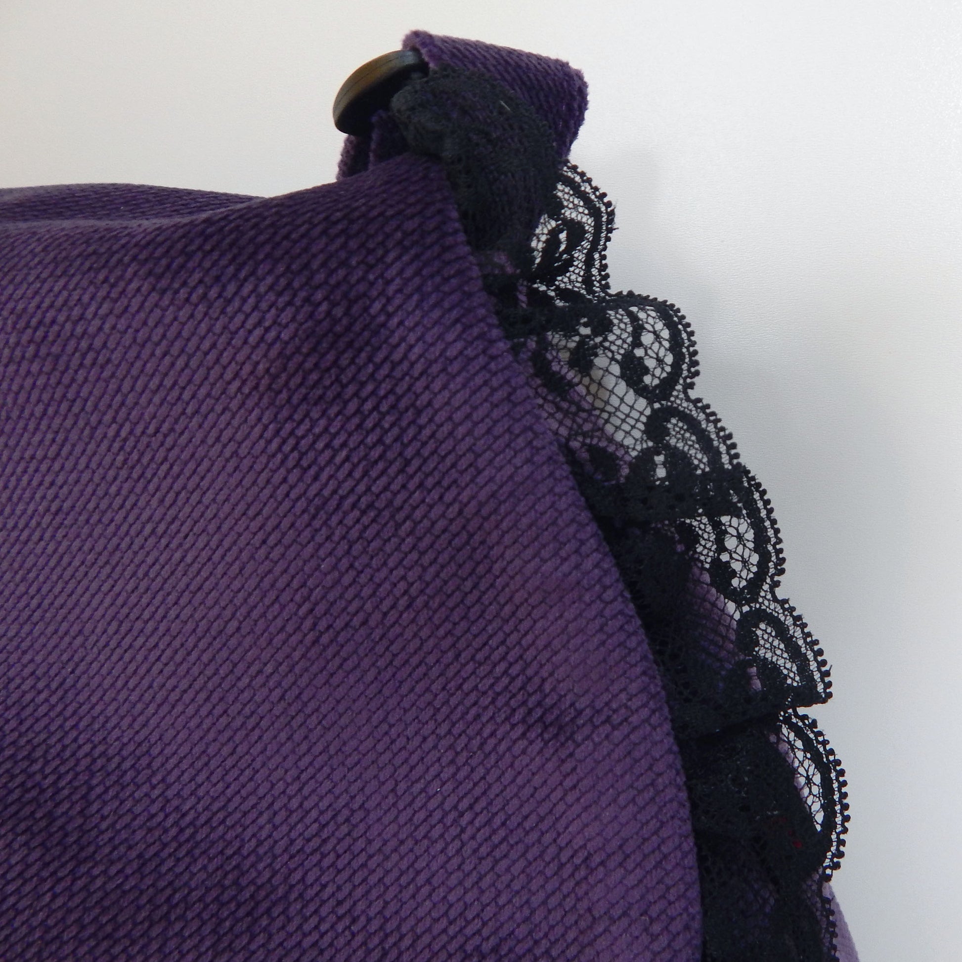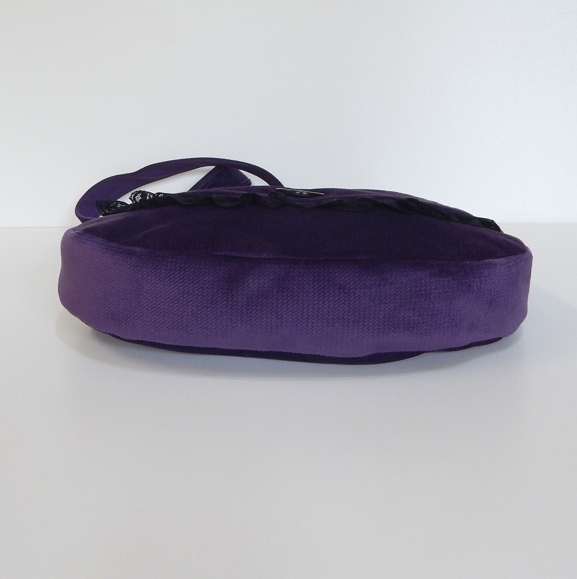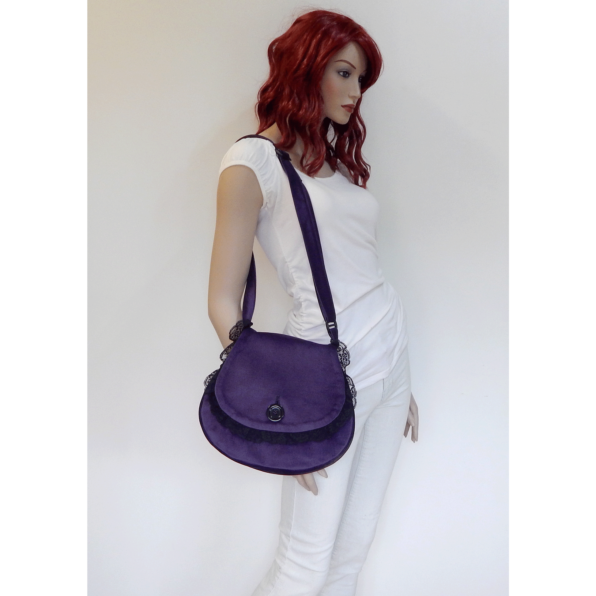Description: Elevate your gothic style with this beautifully handcrafted tear-shaped crossbody bag. Made of the finest soft dark purple velvet, this unique accessory is lined with durable black cotton canvas for added quality. The front flap is edged with elegant black lace and securely fastened with a large black button, offering a vintage look and feel. Inside, a zippered pocket provides space for your essentials. The adjustable shoulder strap ensures versatility, making it perfect for Halloween, gothic events, or as a thoughtful gift for someone who loves bold style.