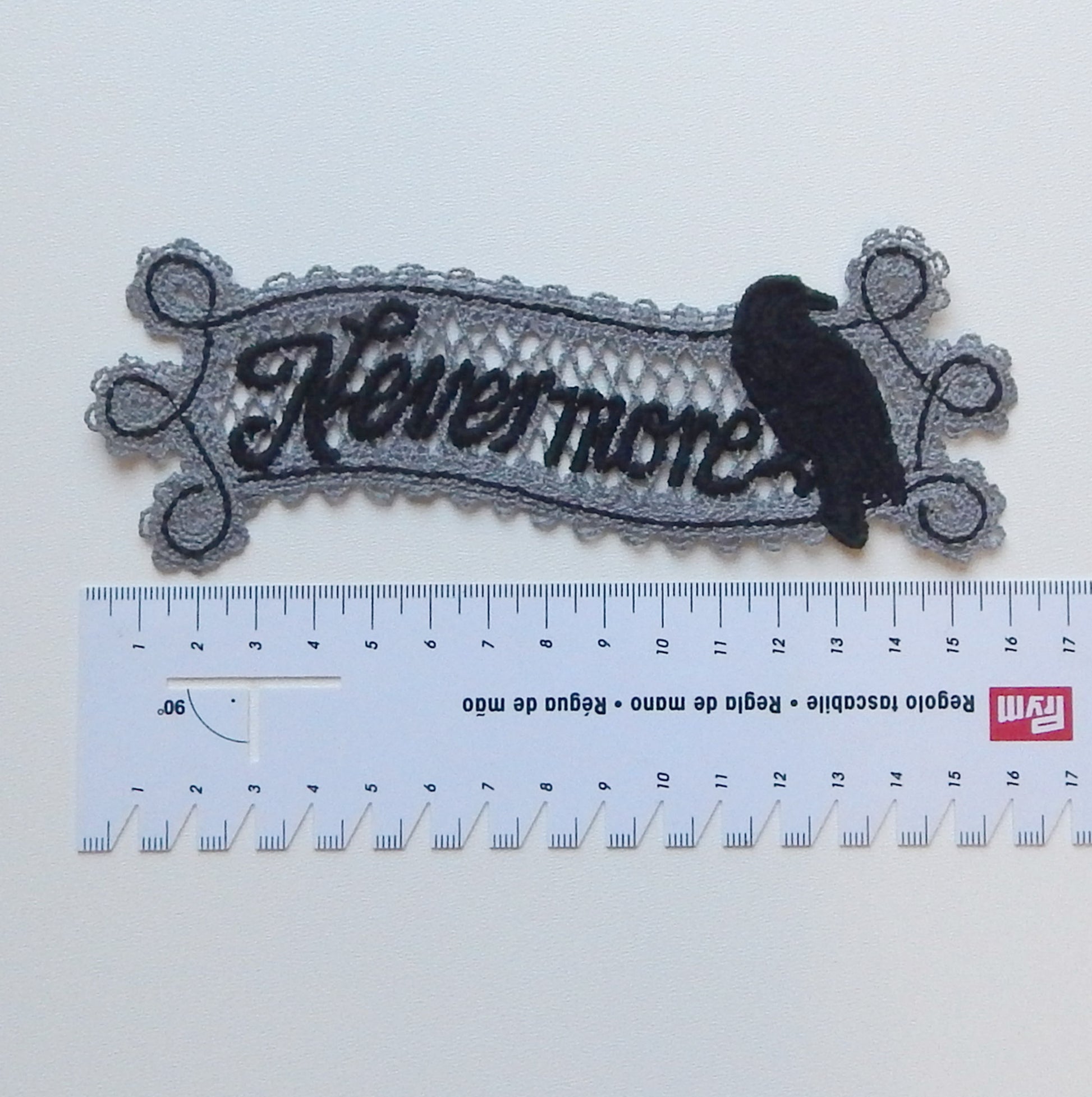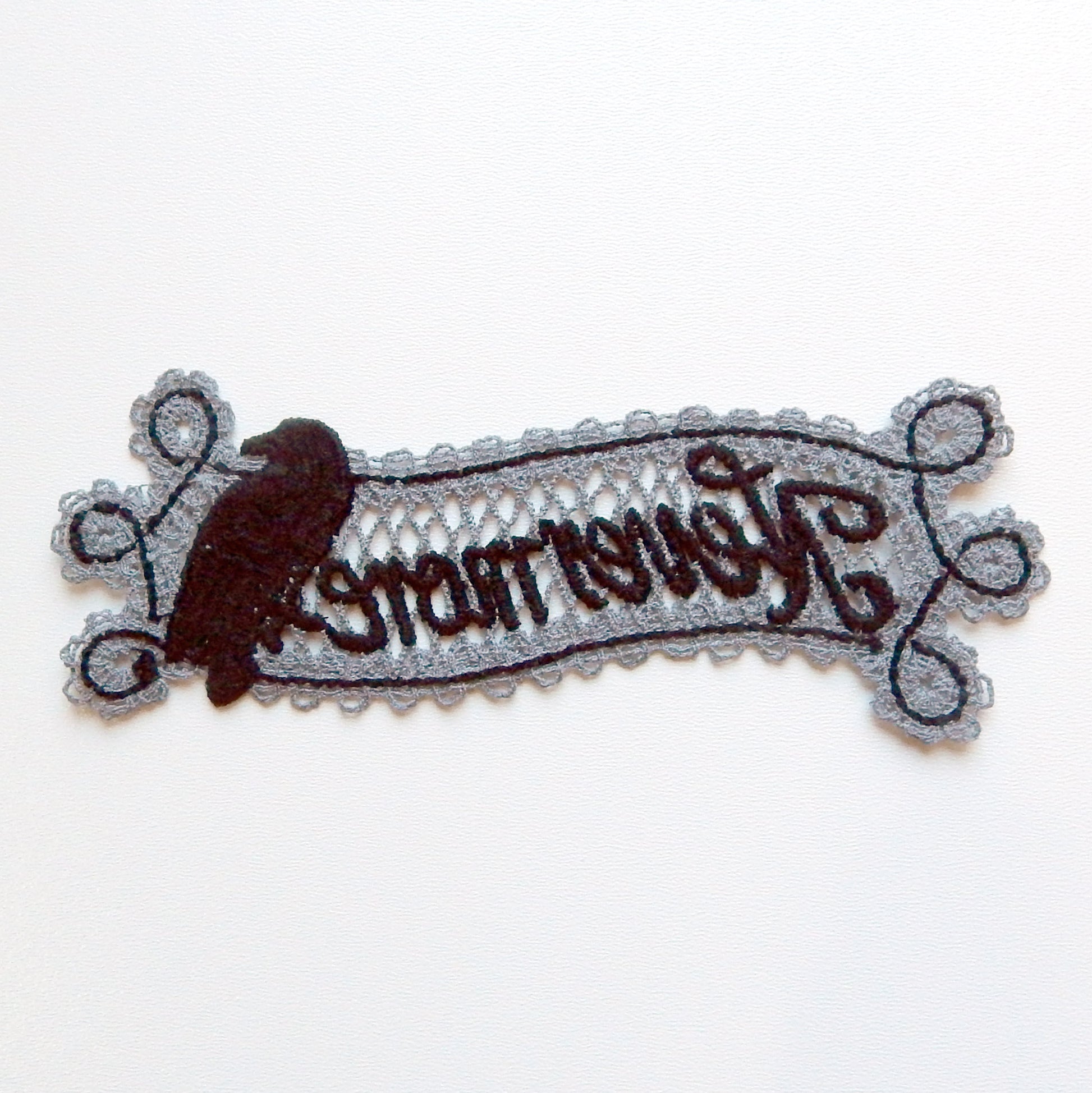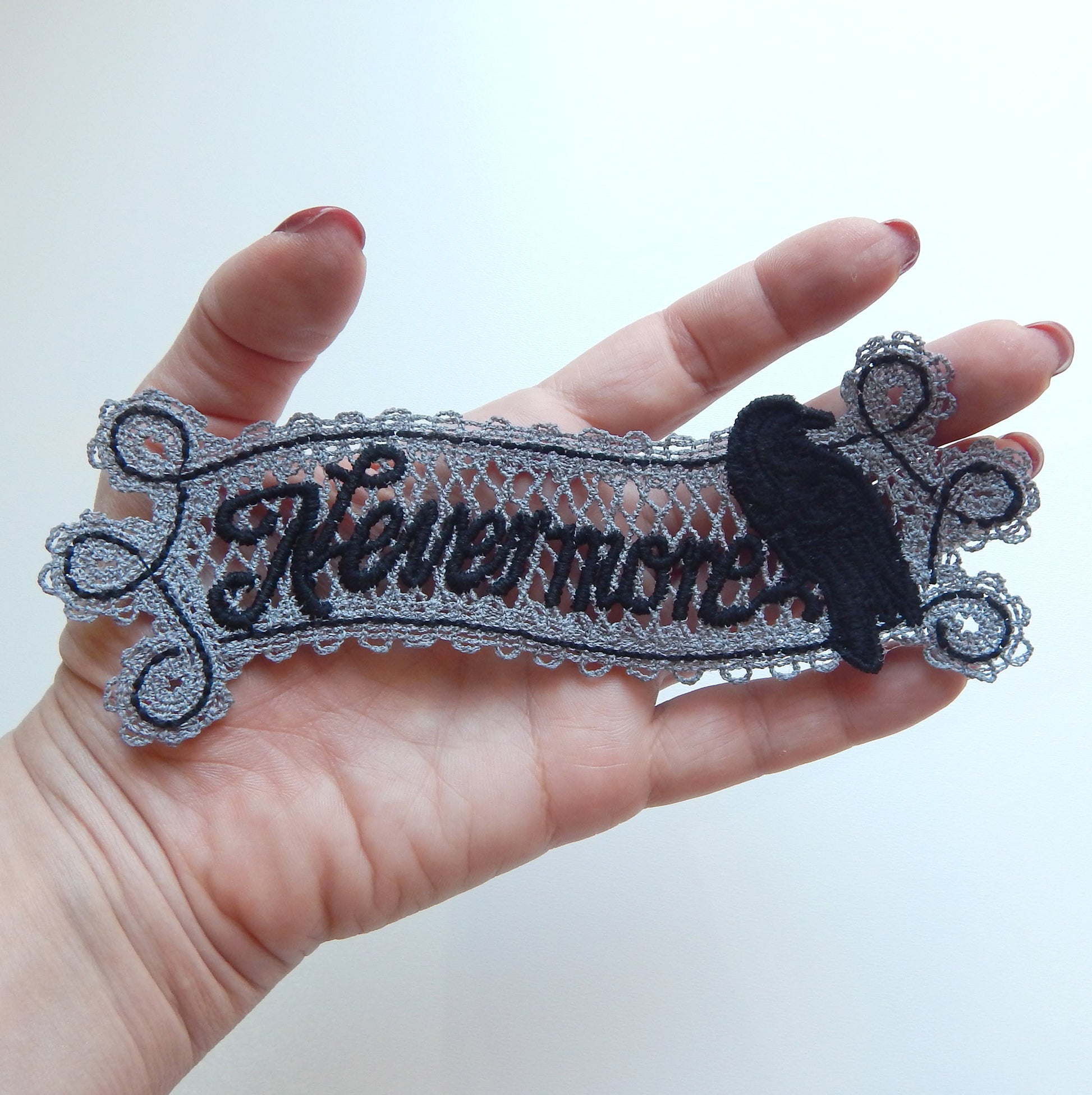 A delicate, machine‑embroidered lace bookmark made with cotton embroidery thread. Perfect as a gothic reading accessory or as a decorative accent for your home. It can be hung on a wall, placed on a shelf, or displayed anywhere you want a touch of dark elegance.