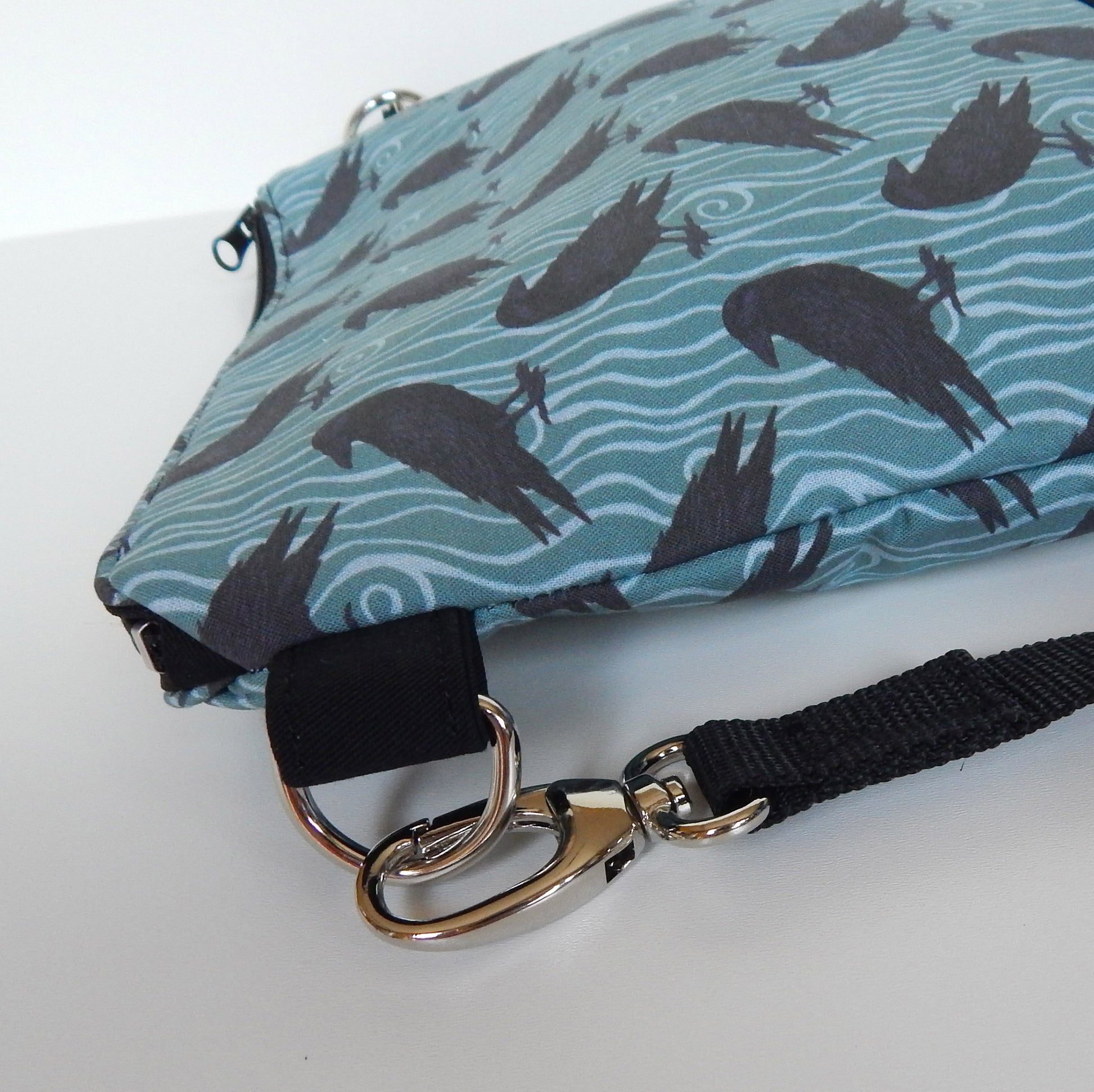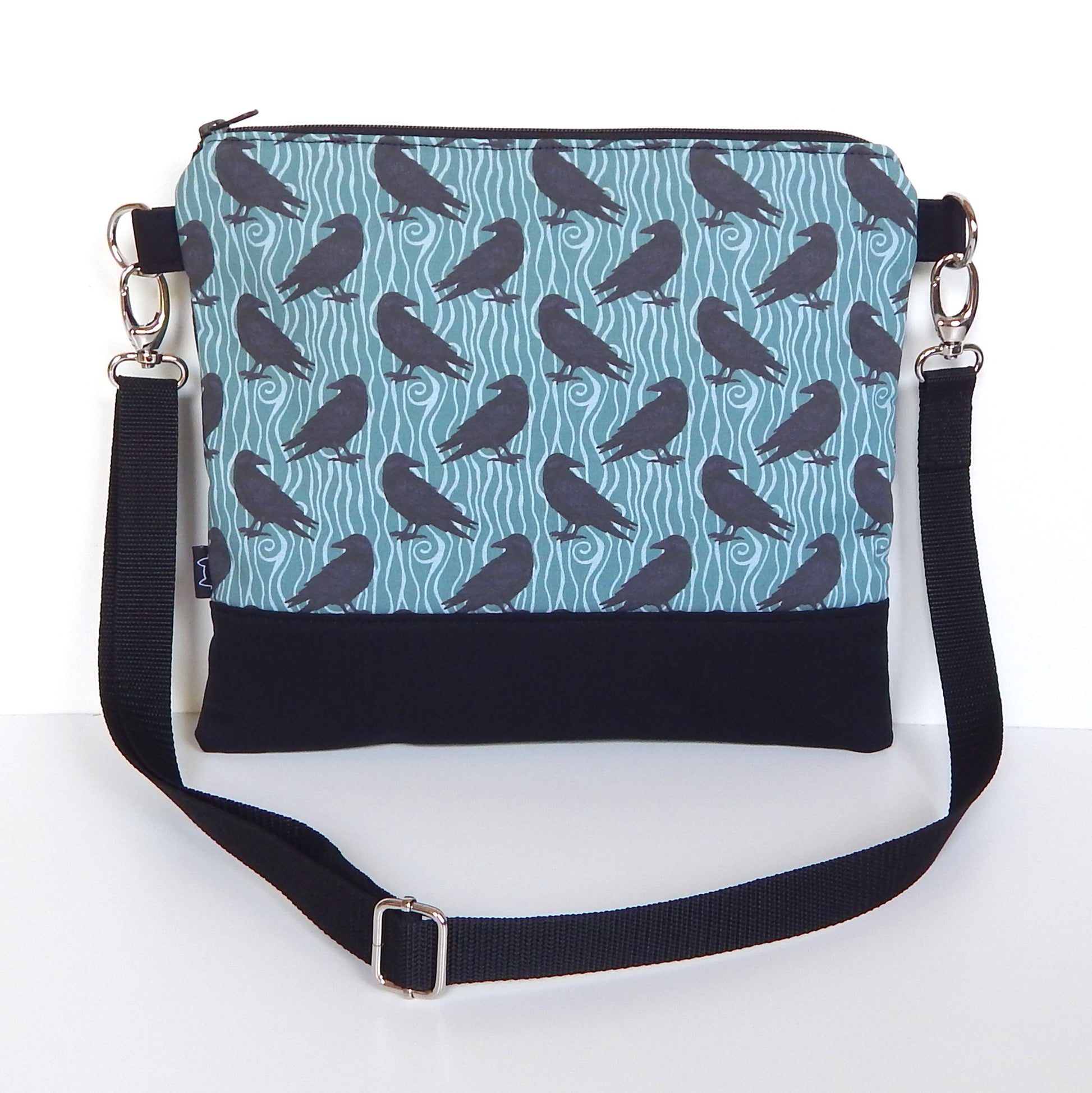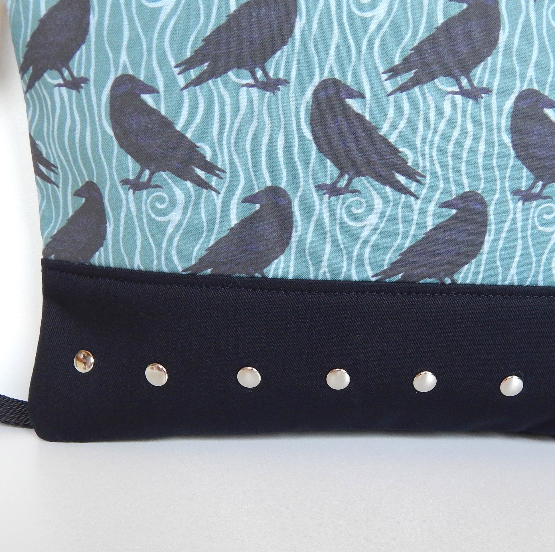 A blend of gothic symbolism and subtle witchy elegance. This dusky mint raven crossbody bag is crafted from black twill and raven‑printed canvas, accented with metal rivets and a soft polka‑dot lining. Lightweight, practical, and enchanting enough for everyday magic or moonlit adventures.