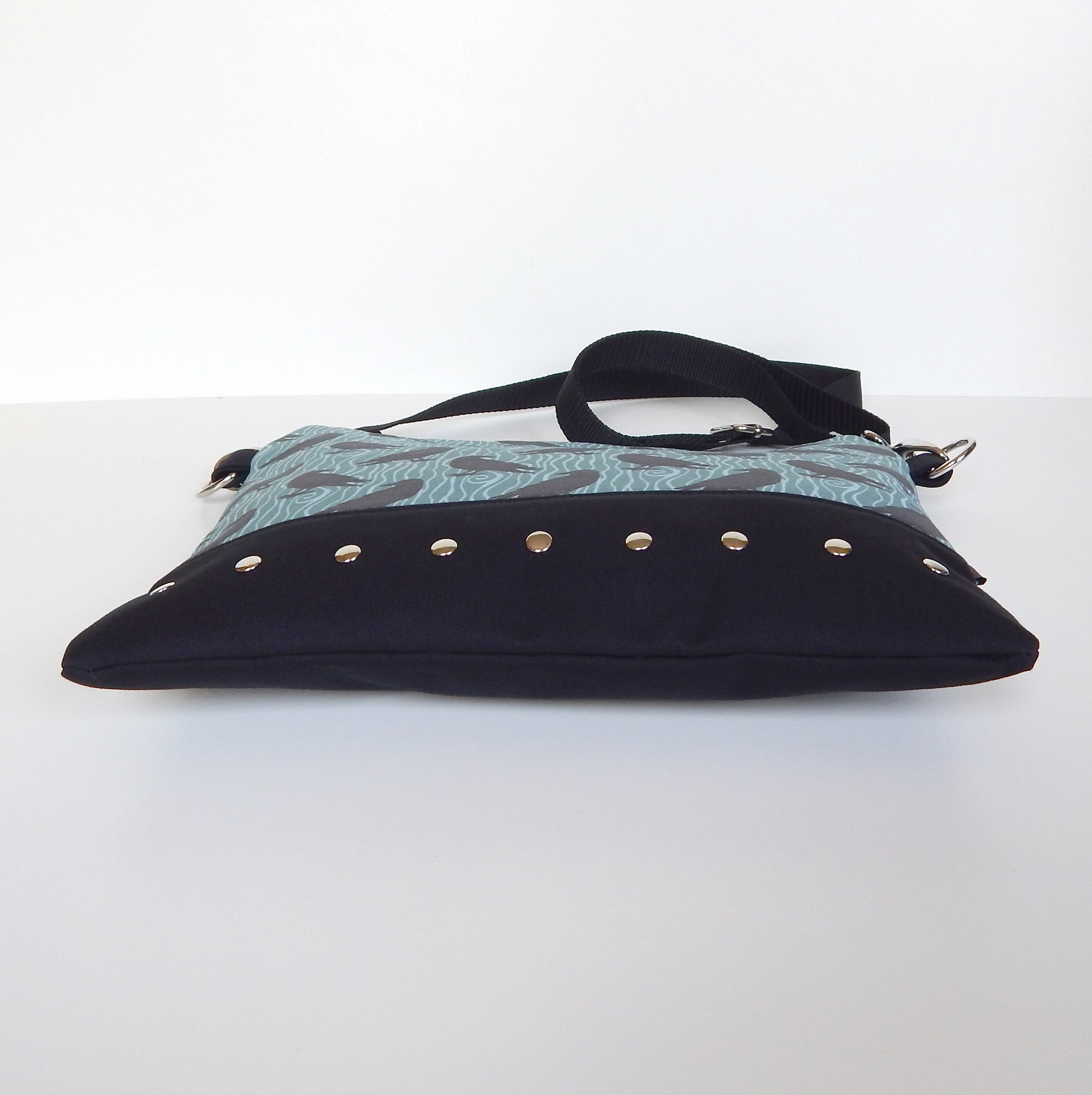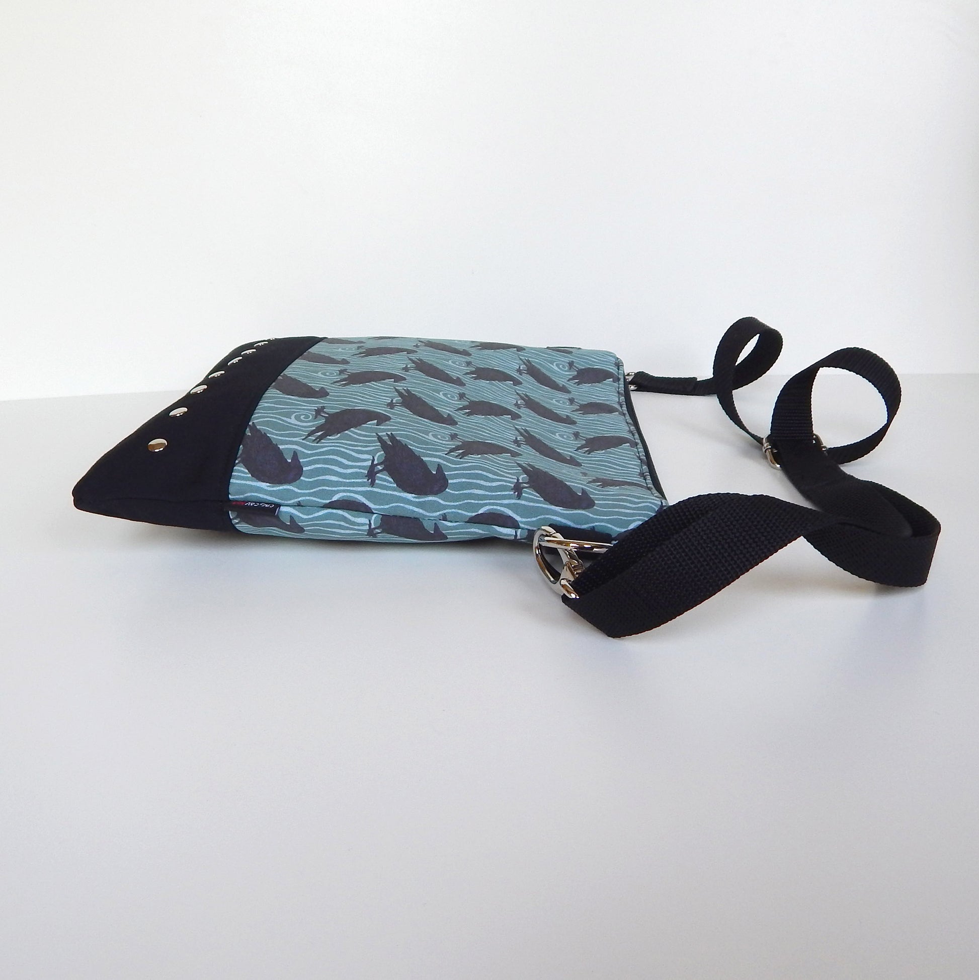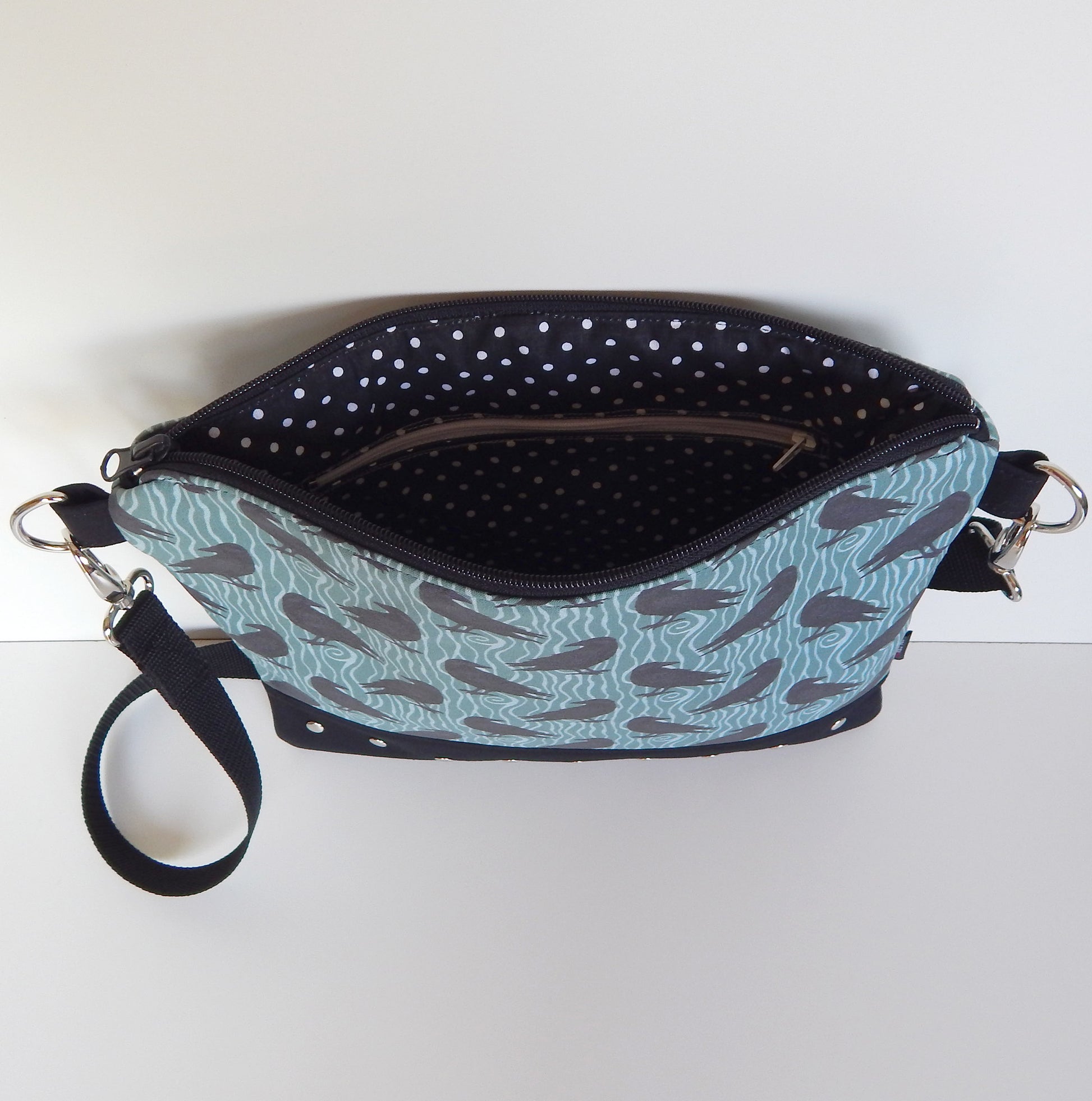 A blend of gothic symbolism and subtle witchy elegance. This dusky mint raven crossbody bag is crafted from black twill and raven‑printed canvas, accented with metal rivets and a soft polka‑dot lining. Lightweight, practical, and enchanting enough for everyday magic or moonlit adventures.
