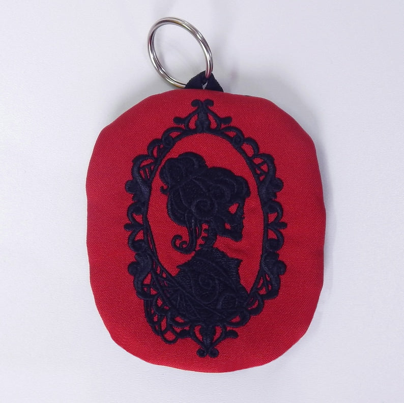 Black cameo is machine embroidered.It is made of combination red polyester synthetic textile (front side) and black cotton-twill (back side).Keychain is lined with black synthetic lining inside.
