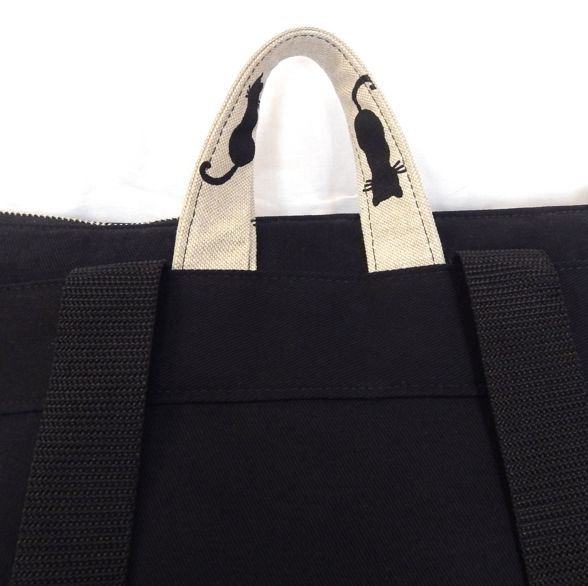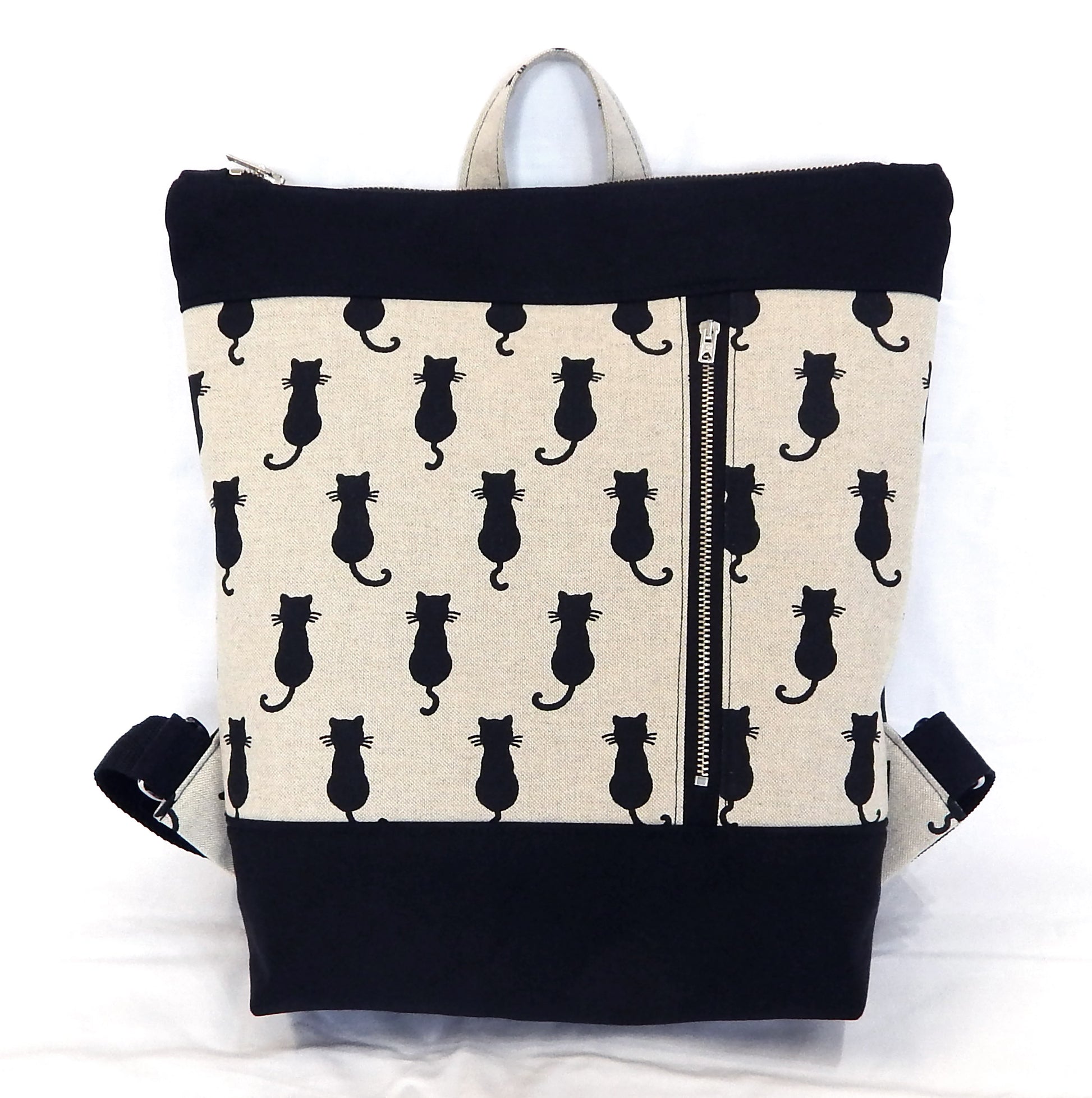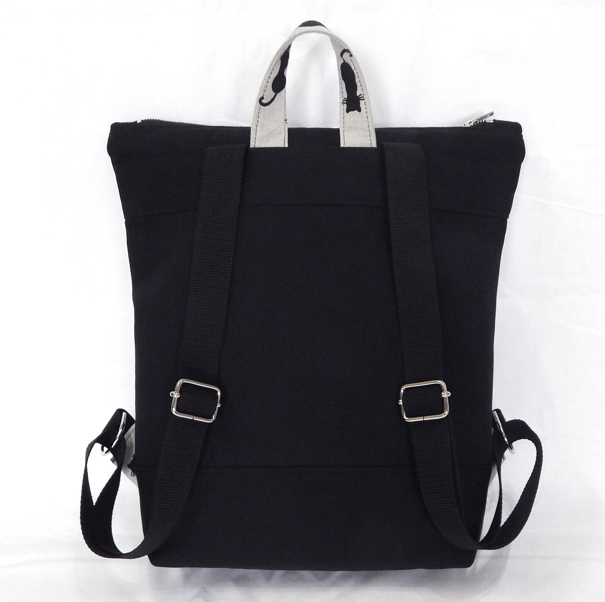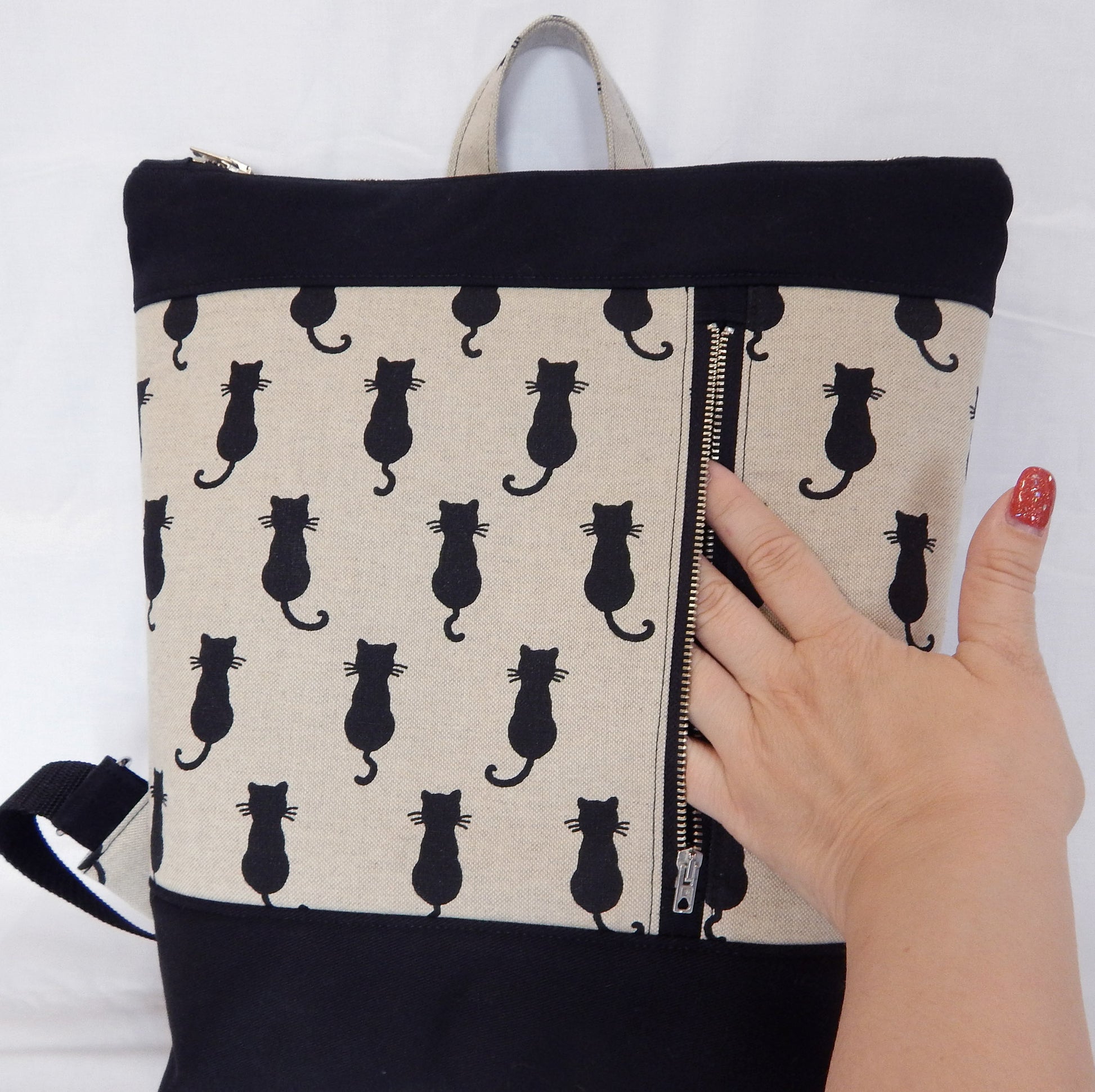 🐈⬛ About: Step into the world of gothic elegance with this handmade Black Cat Backpack, crafted with durability and unique style in mind. Made from natural-colored cotton canvas with black cat print and black cotton twill, this medium-sized backpack is reinforced with thicker interlining and padding fabric for extra sturdiness. The lining features a vichy black-white cotton print, adding a timeless touch to its design. Silver-tone metal zippers, D-rings, and metal hooks ensure both functionality and longevity. The spacious interior includes a small zippered pocket, making it perfect for carrying A4 files, notebooks, books, a mobile phone, and everyday essentials with ease.