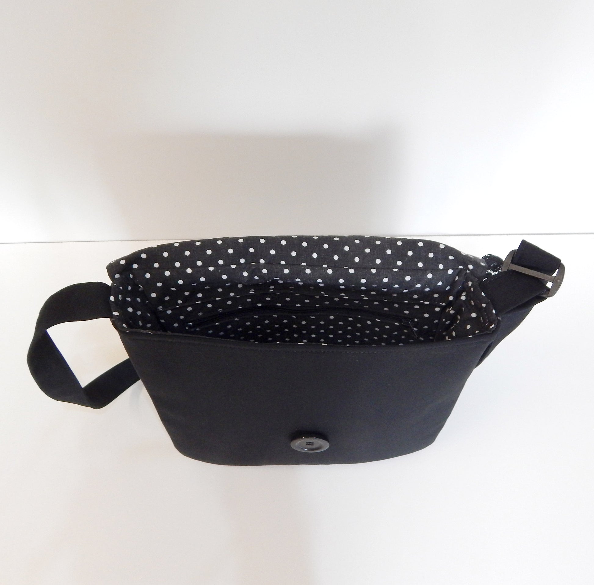 Description: Handmade with dark elegance, this medium-sized crossbody bag is crafted from high-quality black cotton-polyester (50% cotton, 50% polyester) twill, featuring a striking dark gray bat print cotton twill on the front and sides. The bag is lined with black-and-white polka dot cotton for added character. Its cover is accented with delicate black lace and fastens securely with a large black button. Inside, you'll find a zippered pocket to store your essentials safely.