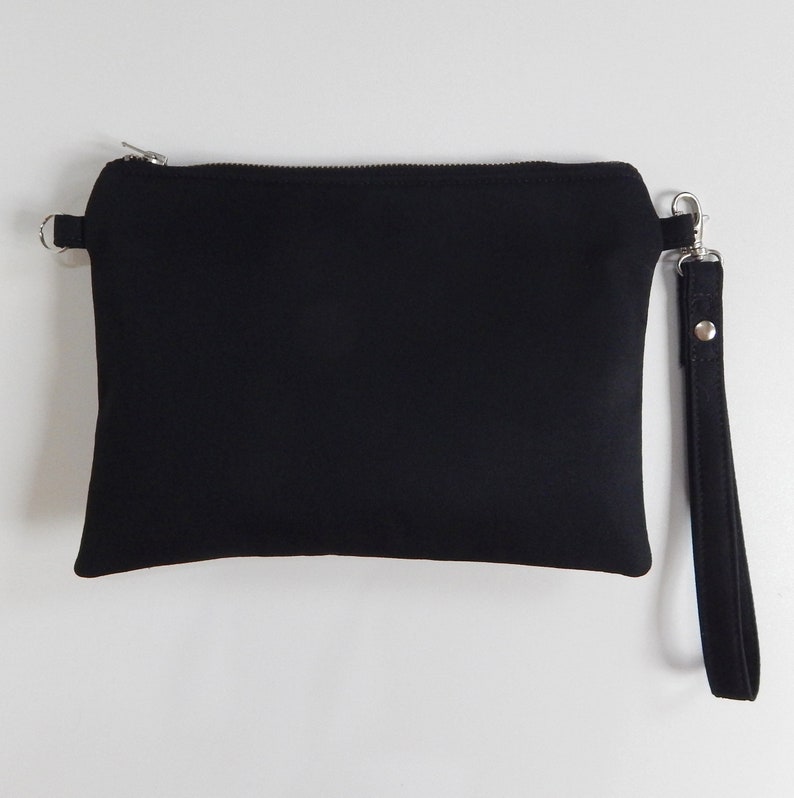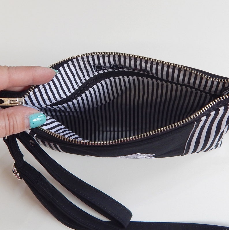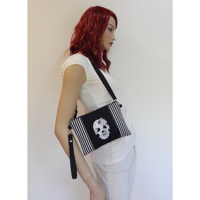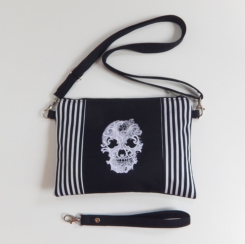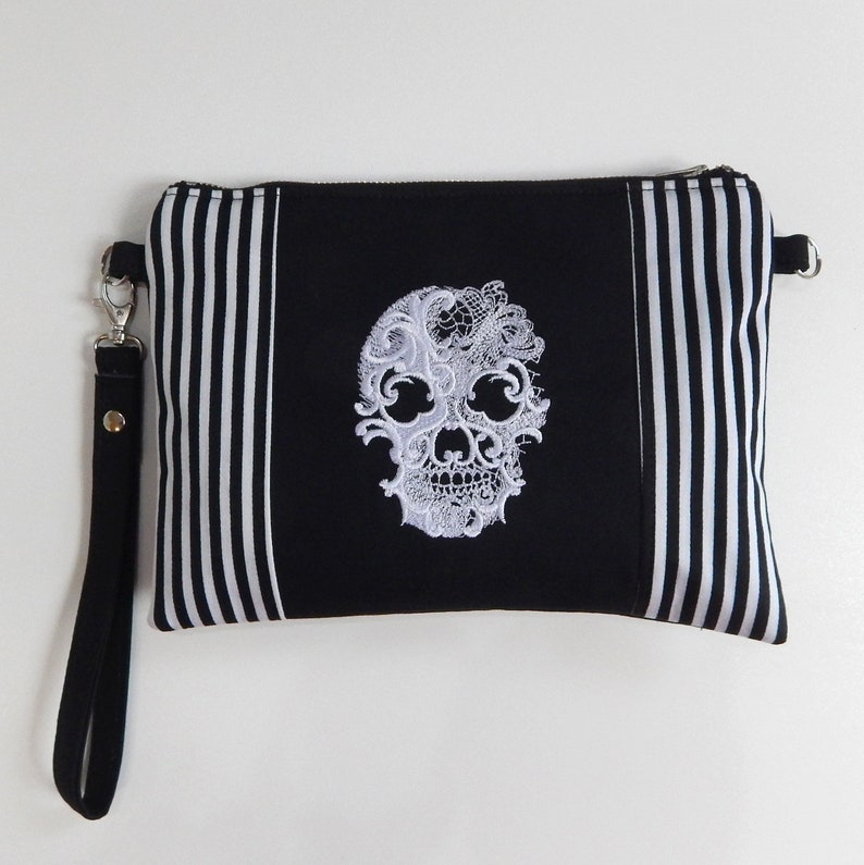 Wristlet gothic handbag made of black cotton twill (mix cotton-polyester twill), black - white striped cotton twill and machine embroidered skull . The bag is lined with black white striped canvas lining and has a zippered closure on the front.
