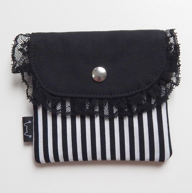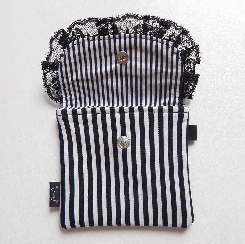 The pouch is made of black cotton- polyester twill, striped black white twill and is lined with striped black white cotton canvas lining inside.