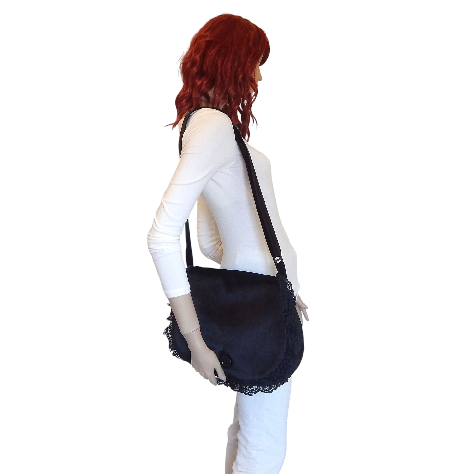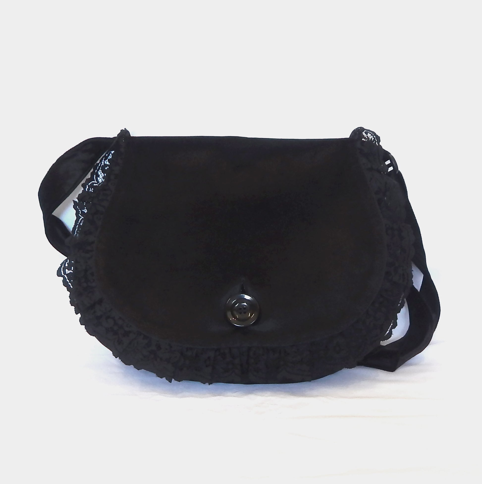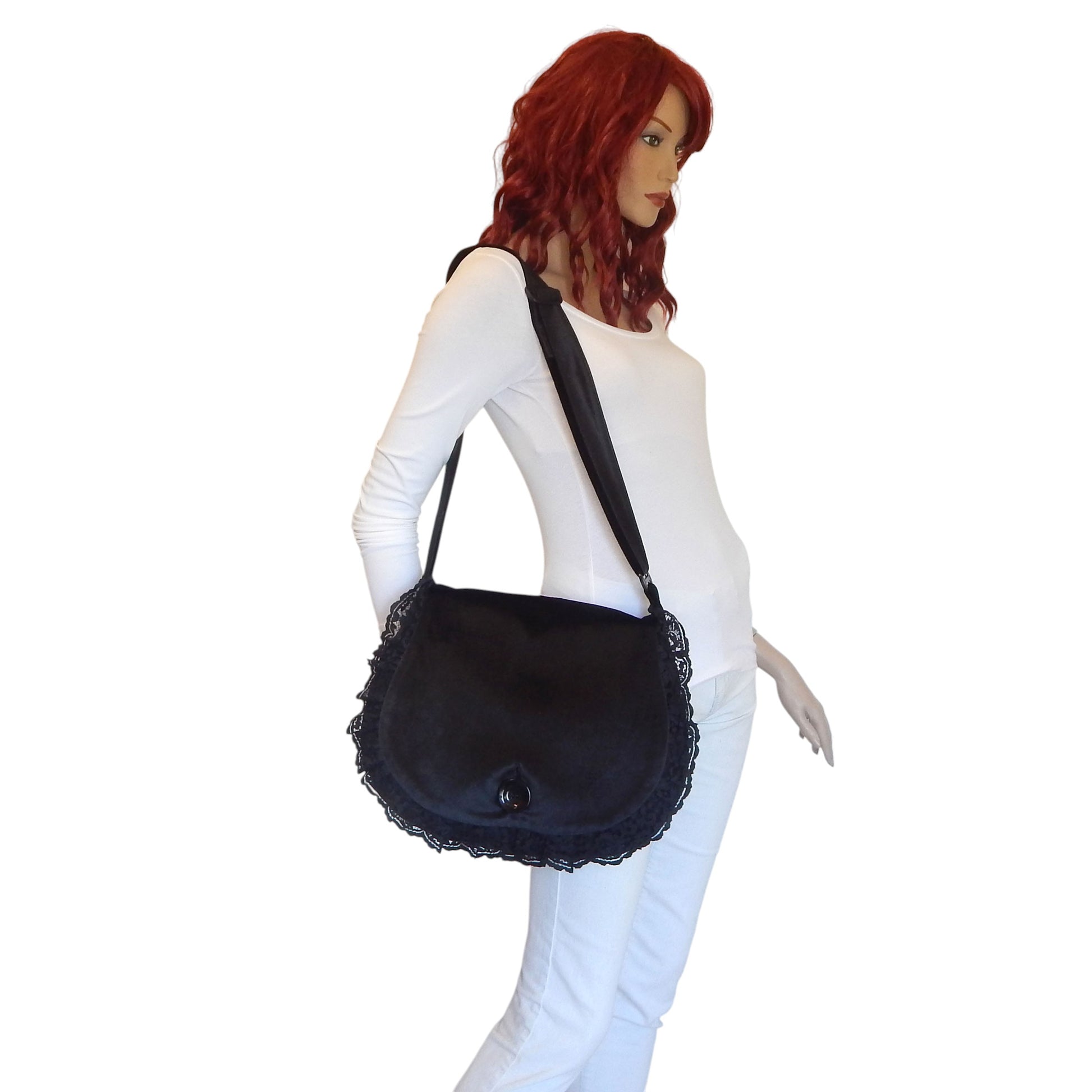 Description: Step into timeless elegance with this luxurious crossbody bag, crafted in a wide oblong silhouette that evokes vintage charm with a modern twist. Made from premium decorative black velvet with a soft, moderate sheen, this piece is designed for lovers of gothic style and refined accessories.