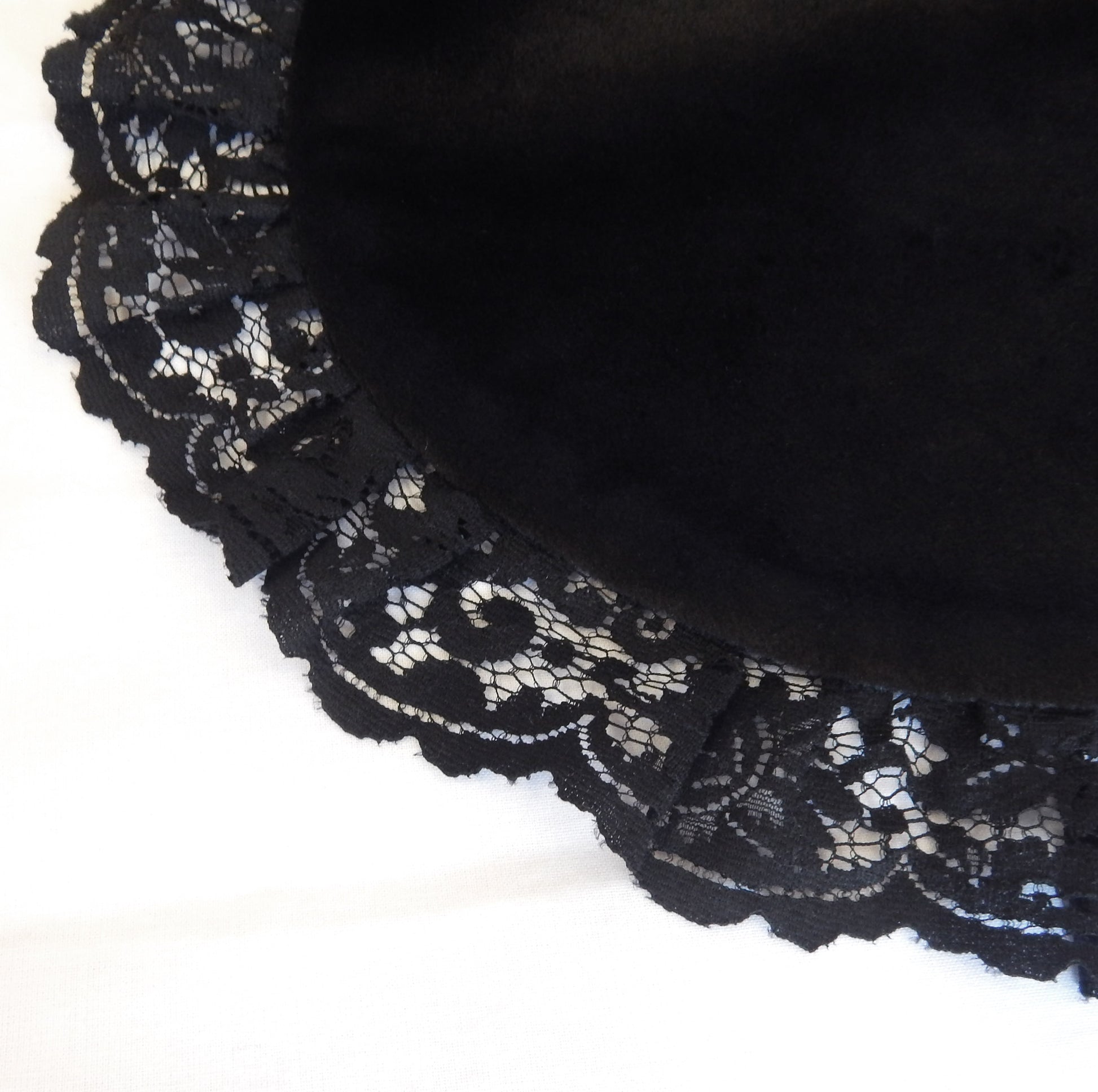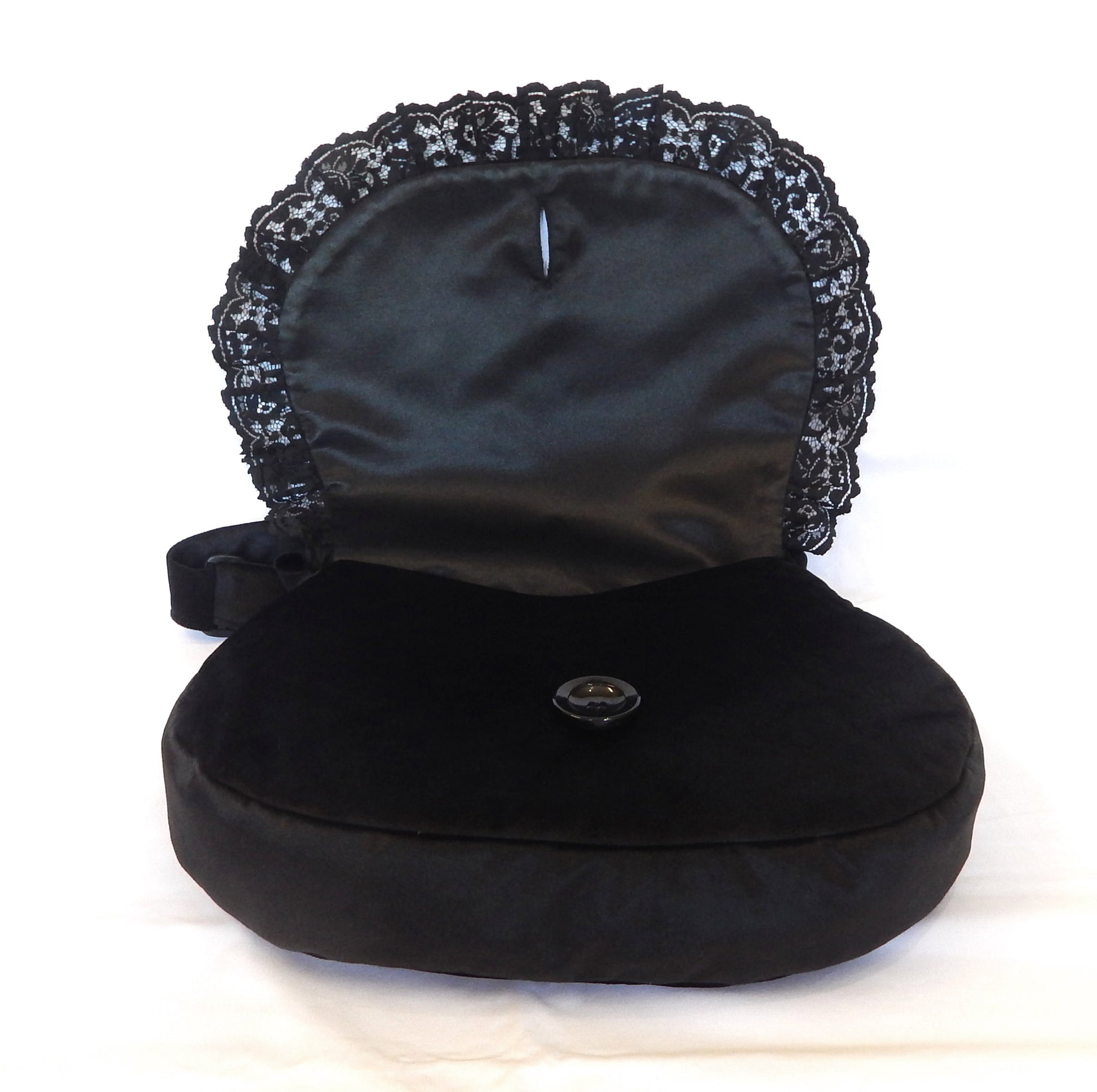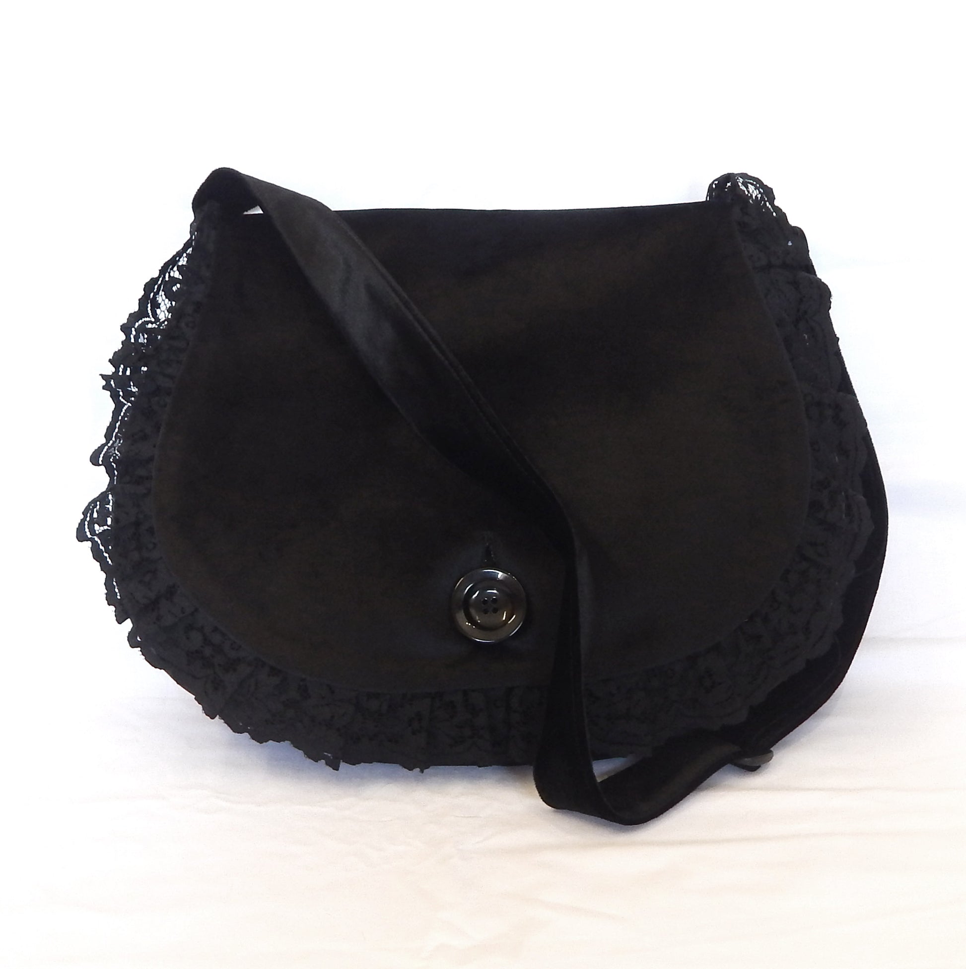 Fastens with a large retro-style black button and trimmed with ornate black lace