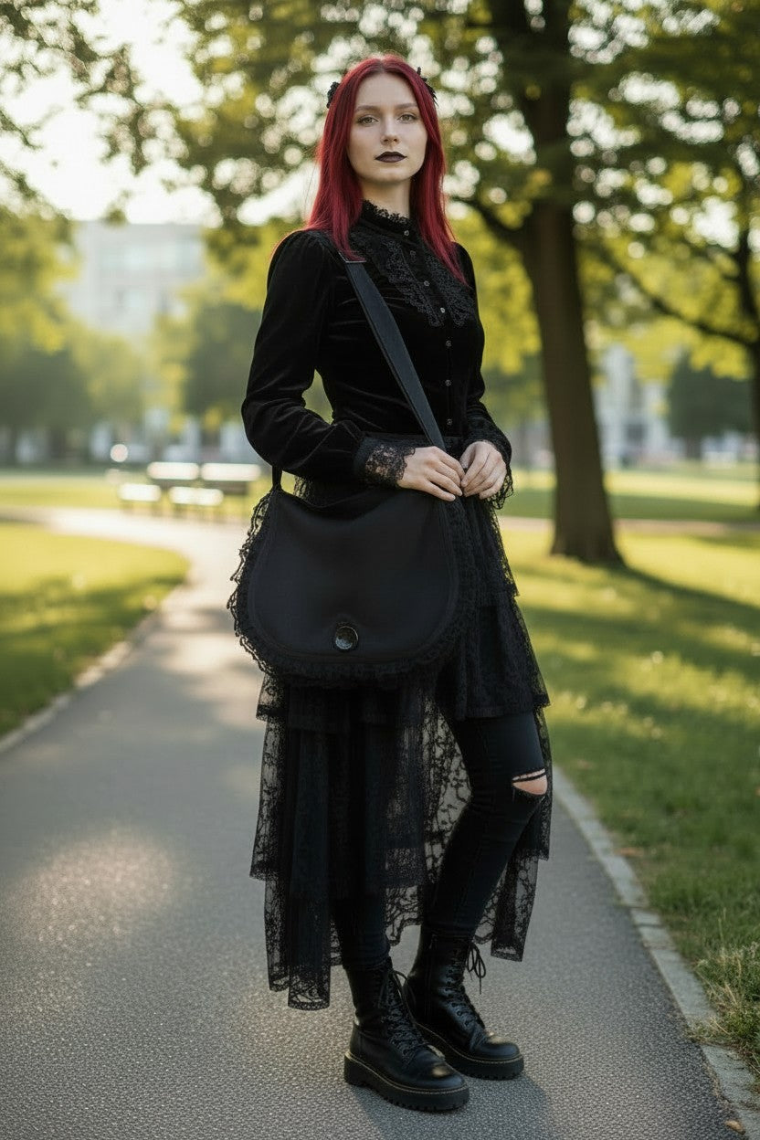 This bag is a perfect companion for gothic fashion lovers, vintage enthusiasts, or anyone seeking a bold yet elegant accessory.