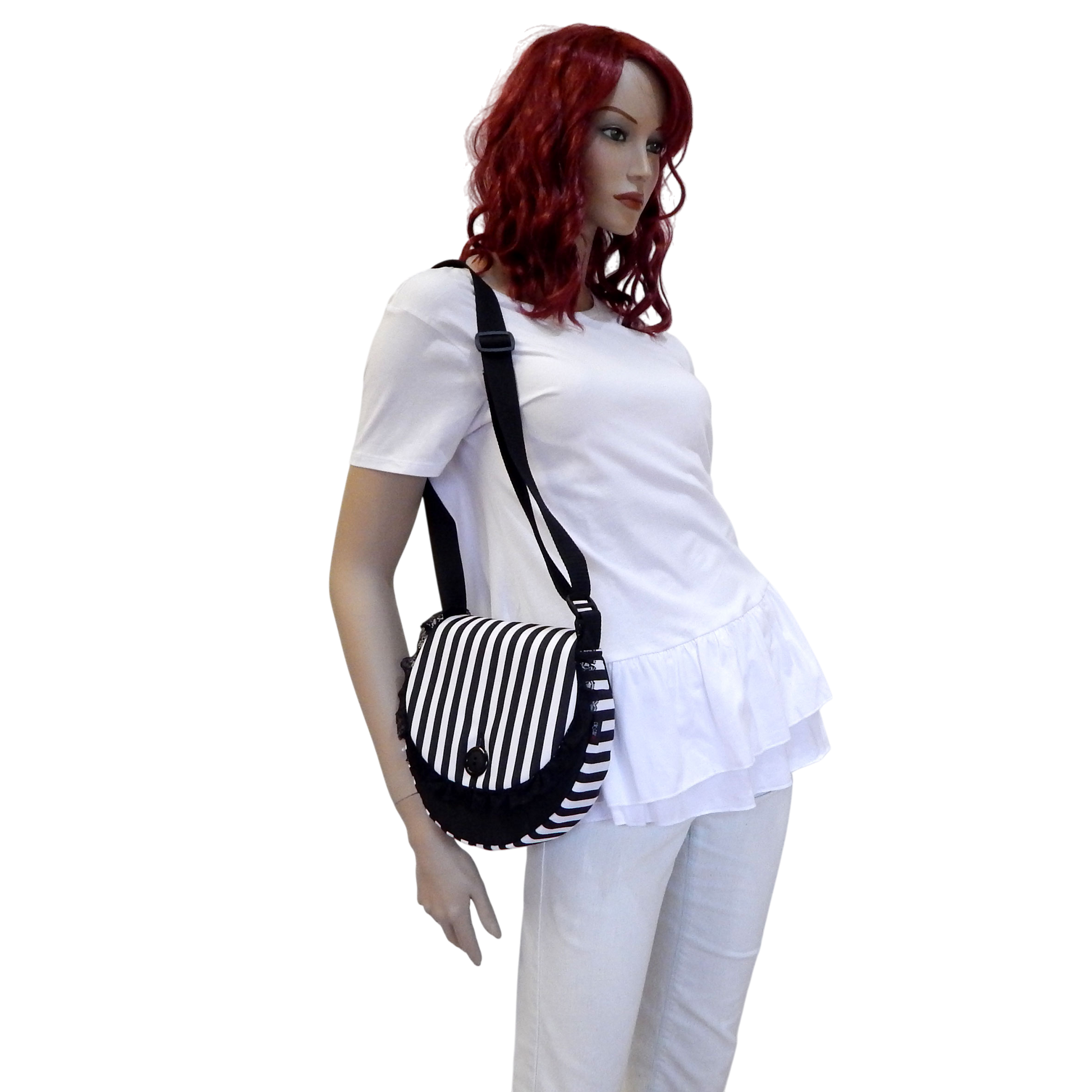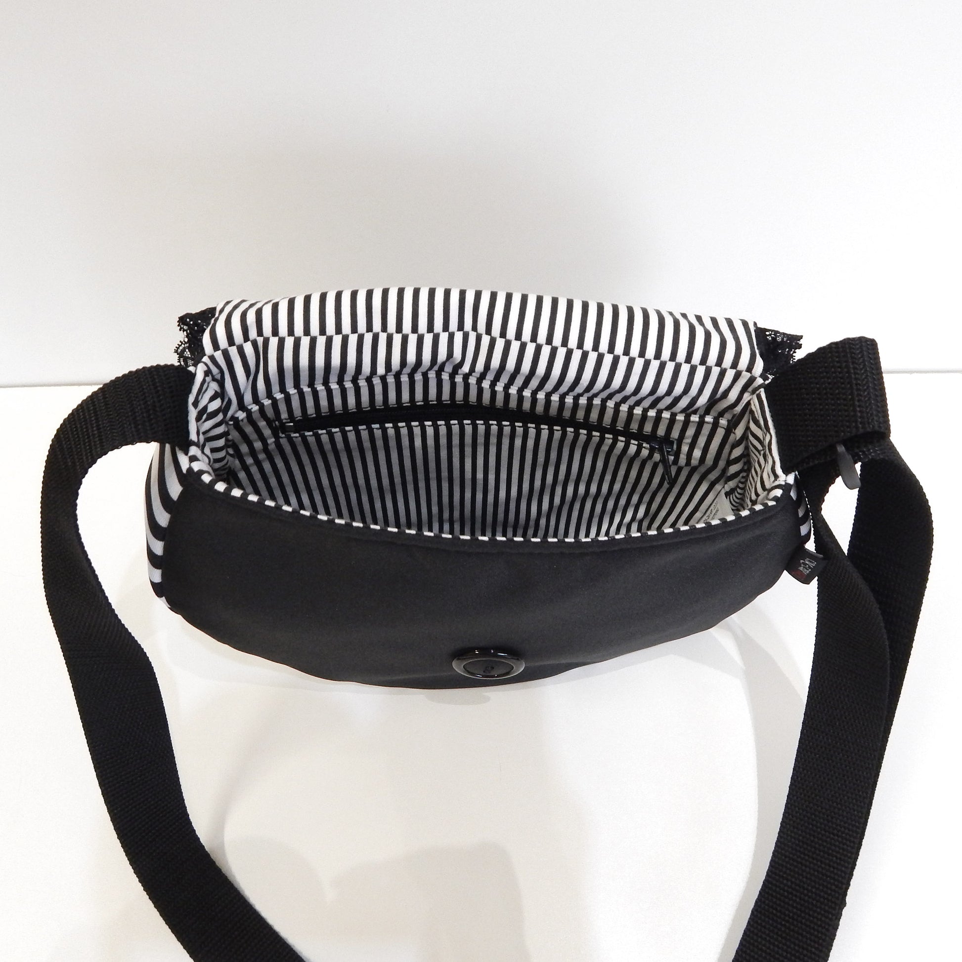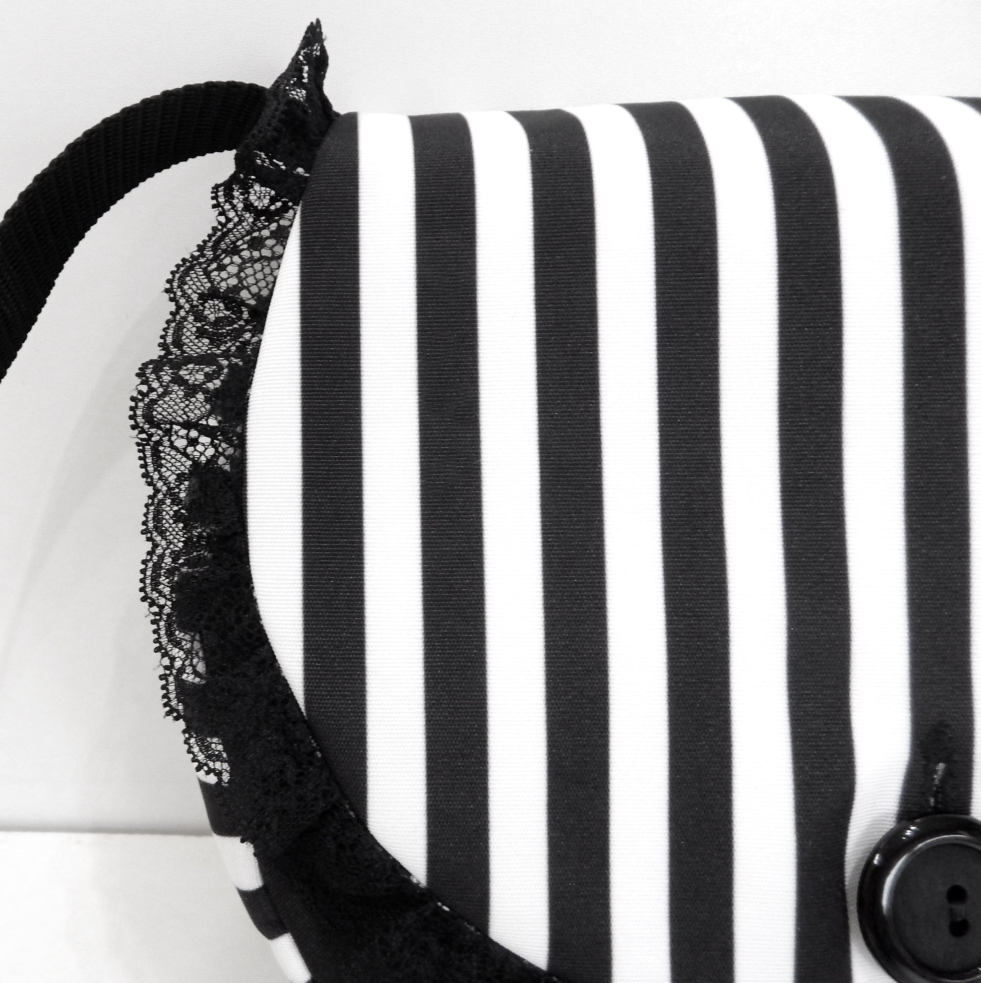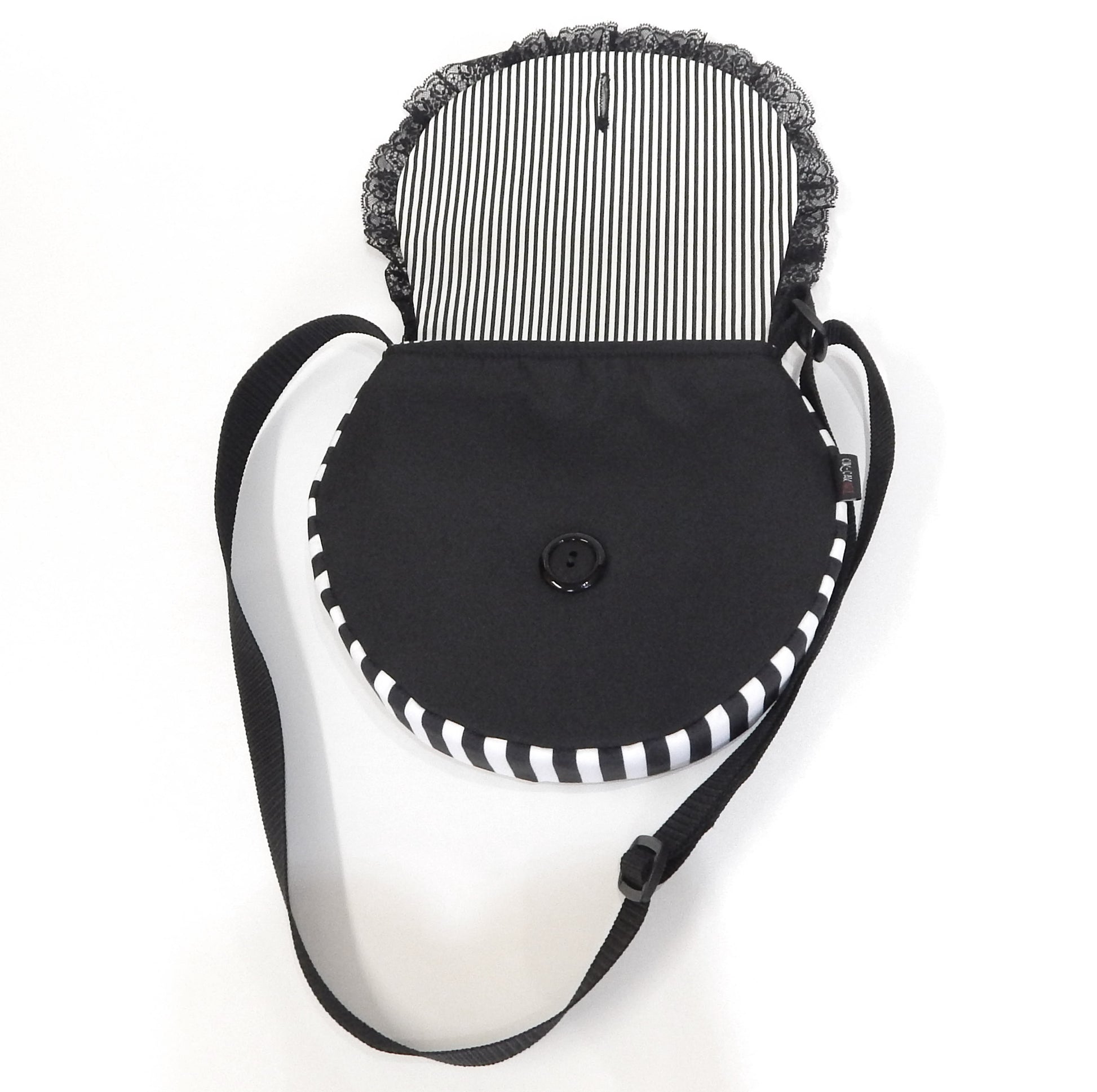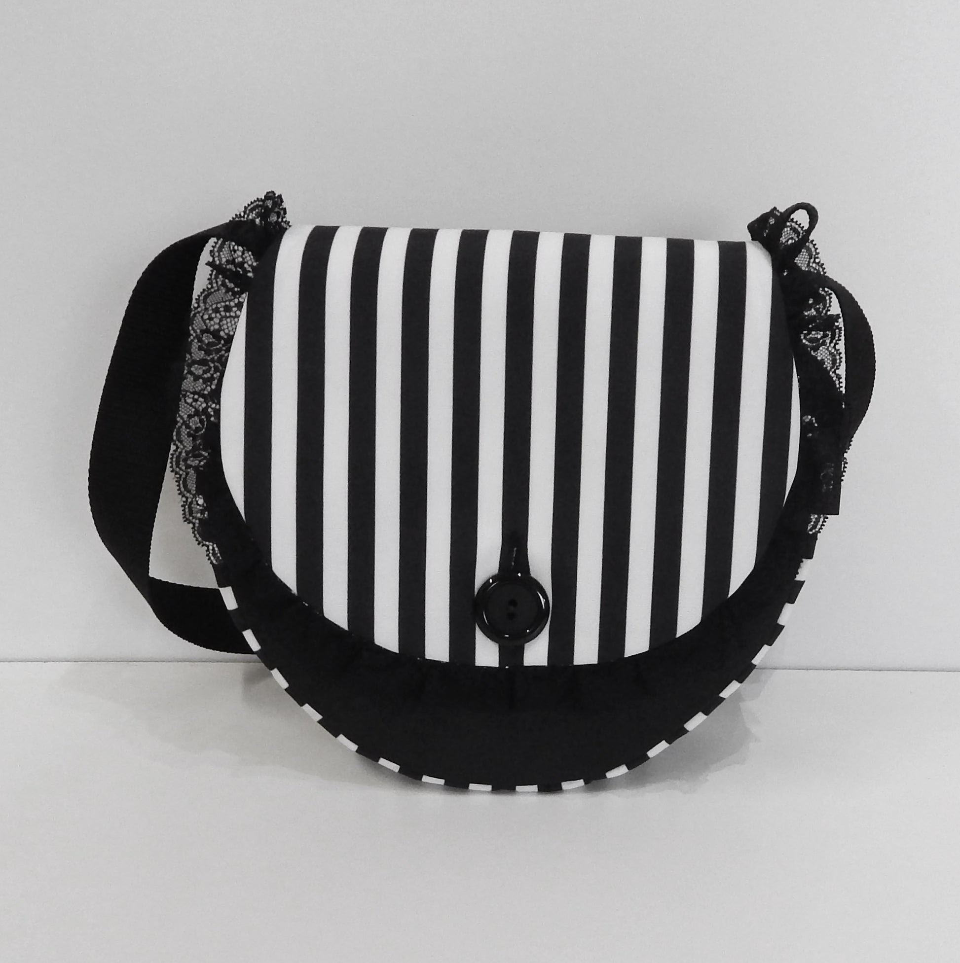 Materials: Crafted from high-quality water-resistant canvas, offering protection against dust, moisture, and light rain. Lined with black-and-white striped cotton canvas for durability and style. The front flap is edged with black lace and secured with a large black button for a gothic touch.